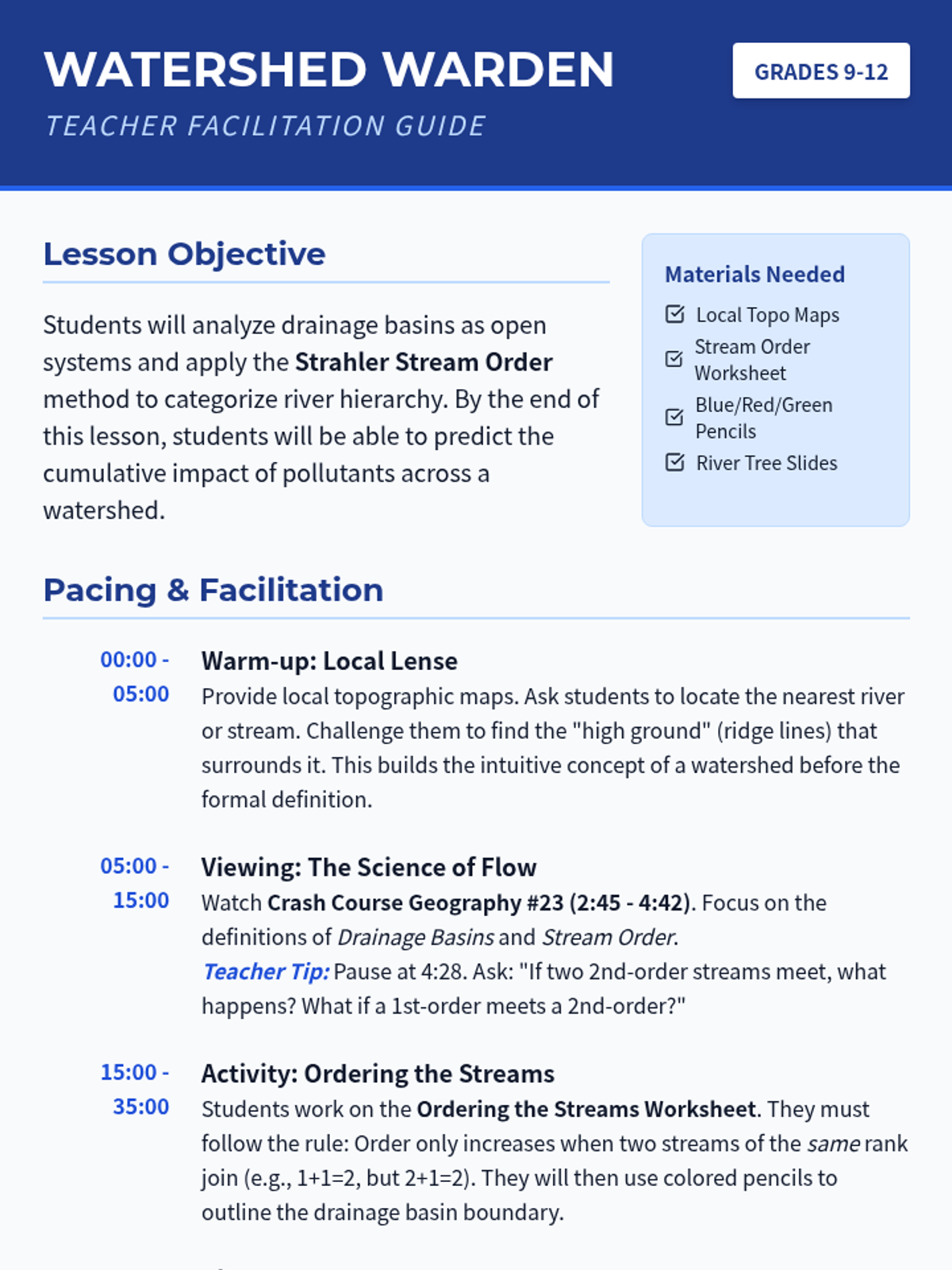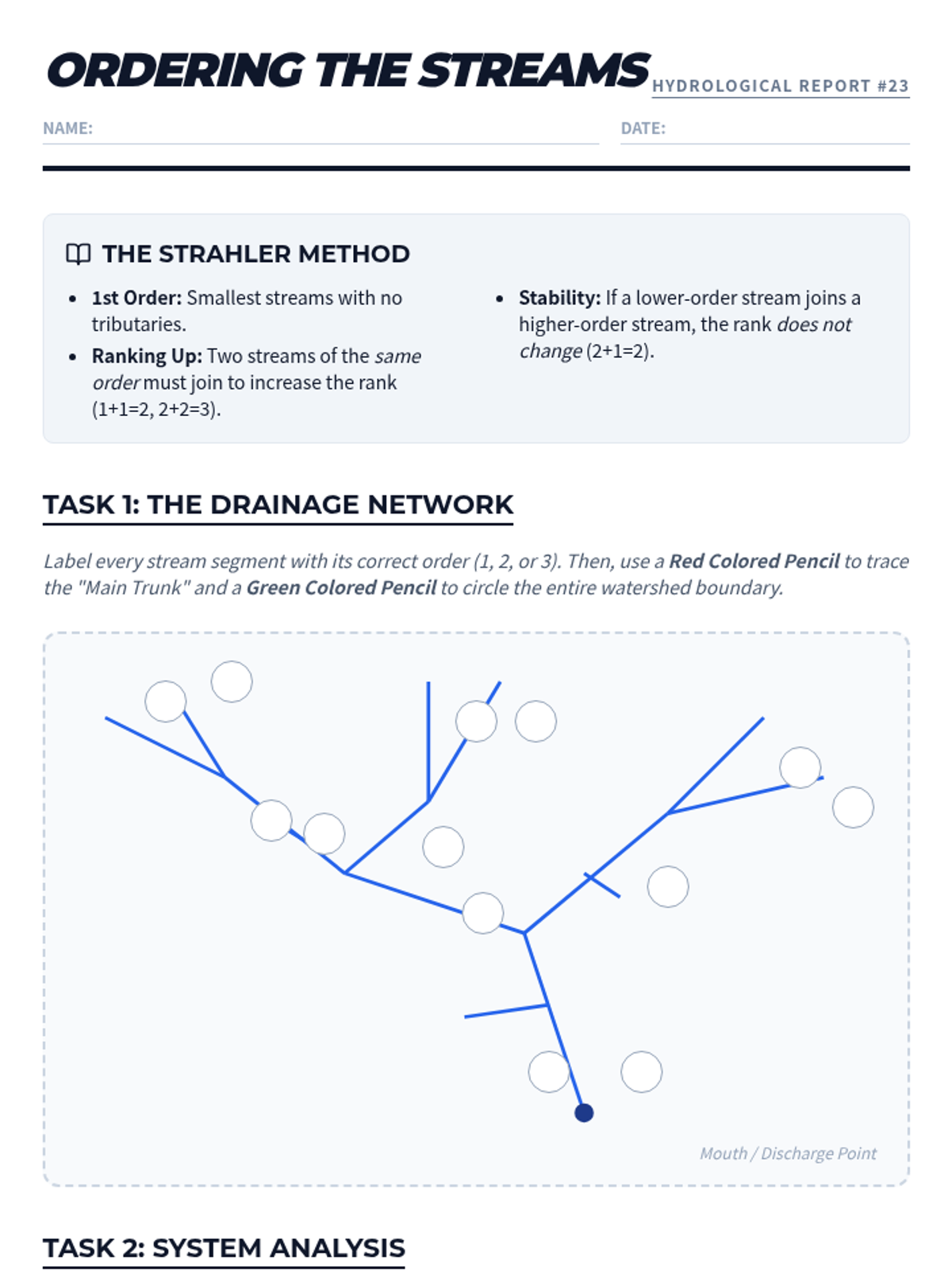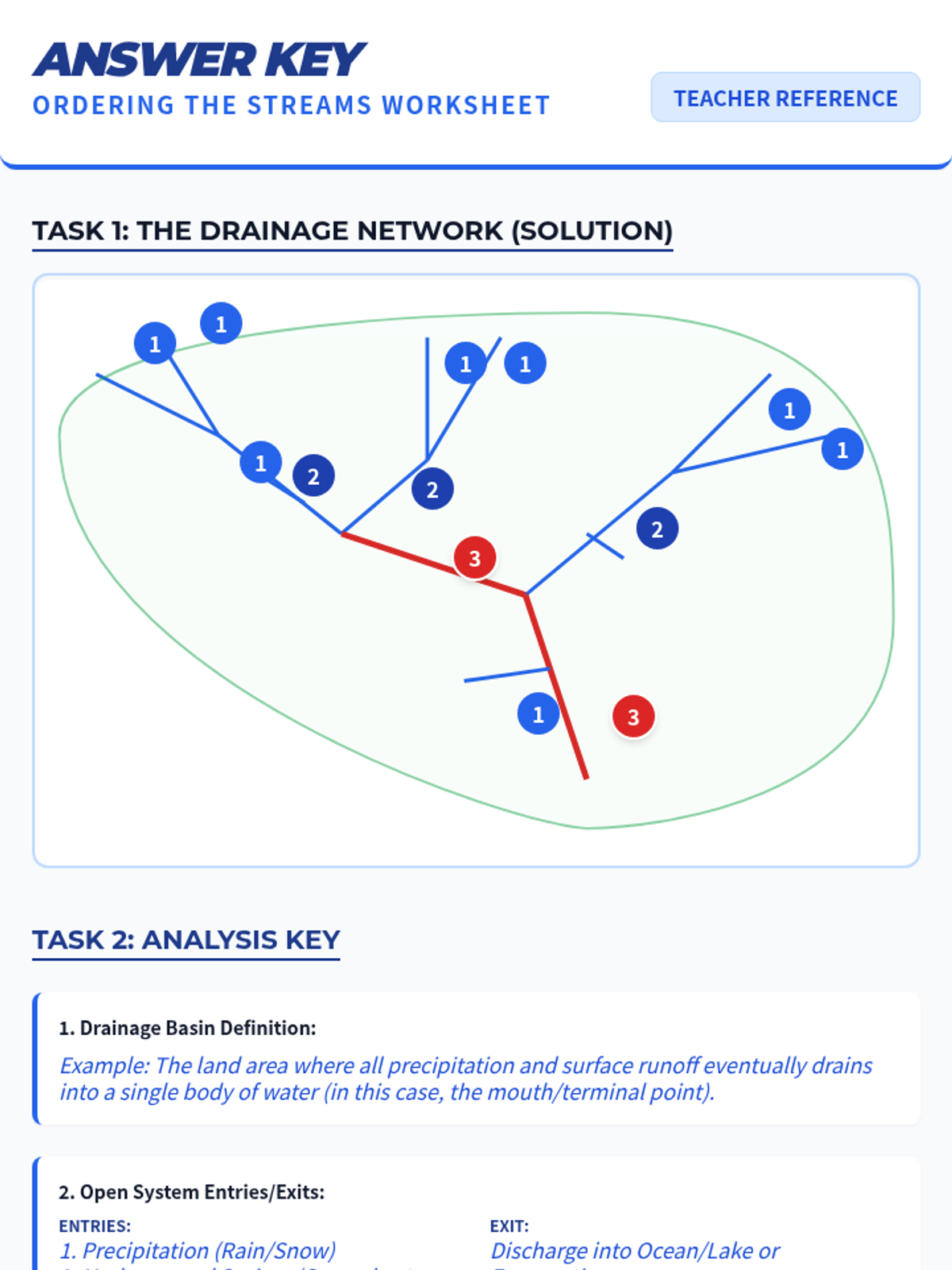 A comprehensive high school lesson exploring how water moves through landscapes using stream hierarchy (Strahler stream order) and drainage basin concepts. Students will analyze maps to trace river systems and discuss the impacts of pollution within an open hydrological system.