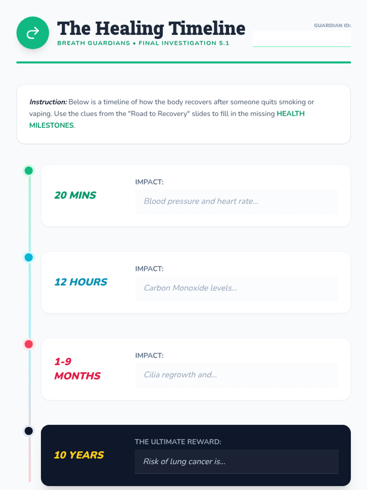 The sequence concludes by celebrating the body's resilience. Students map out a healing timeline for quitting tobacco and commit to a tobacco-free lifestyle.