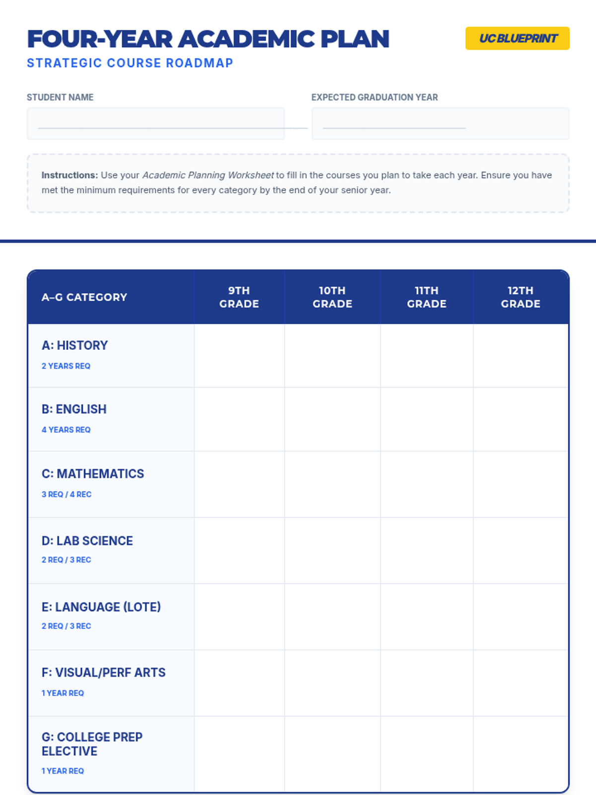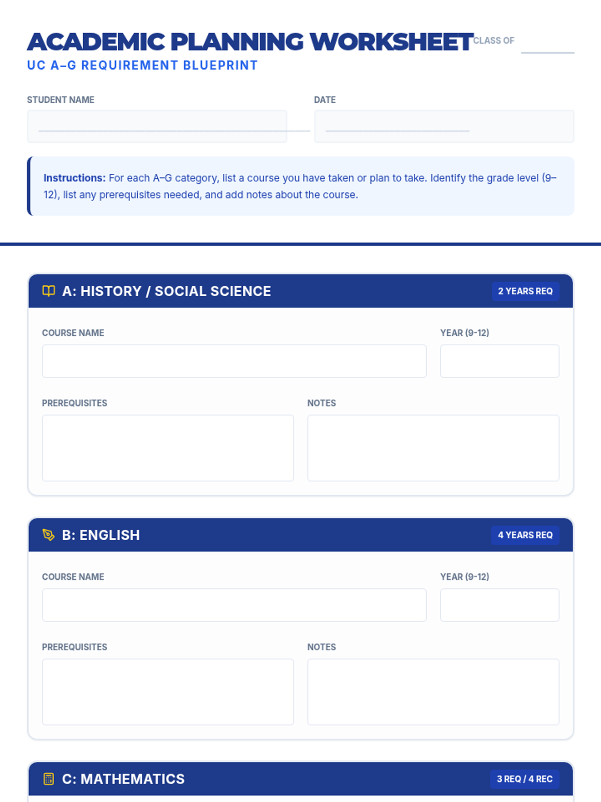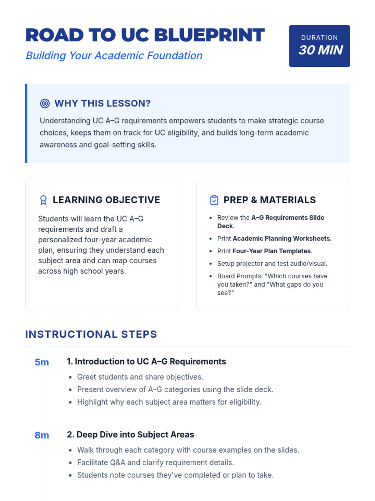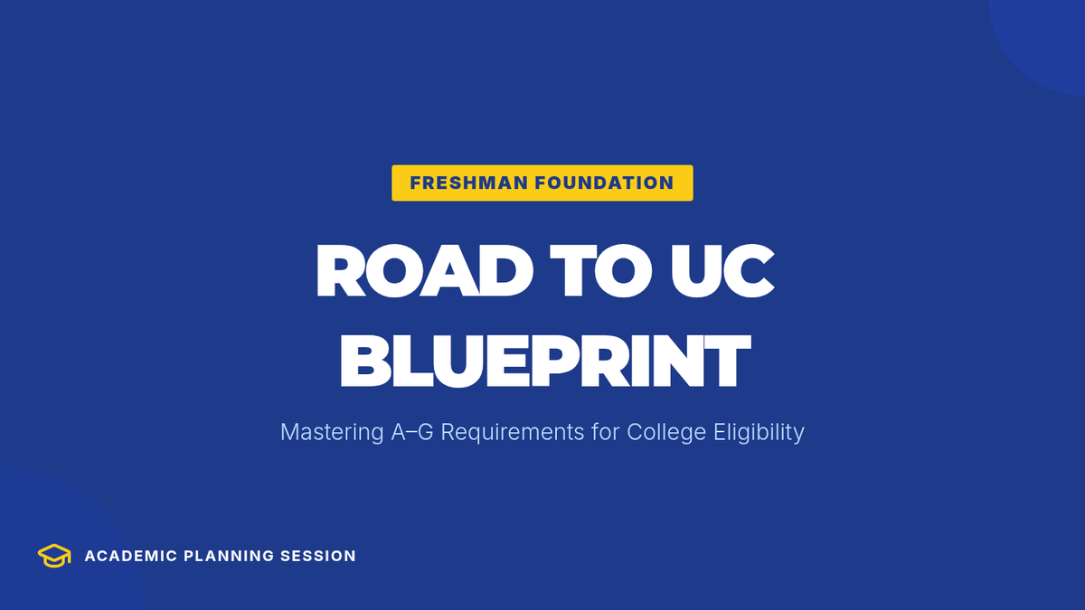 A 30-minute foundation session for 9th graders to understand University of California A–G requirements and draft their four-year academic roadmap. Students will explore course categories and ensure they are on track for college eligibility from day one.