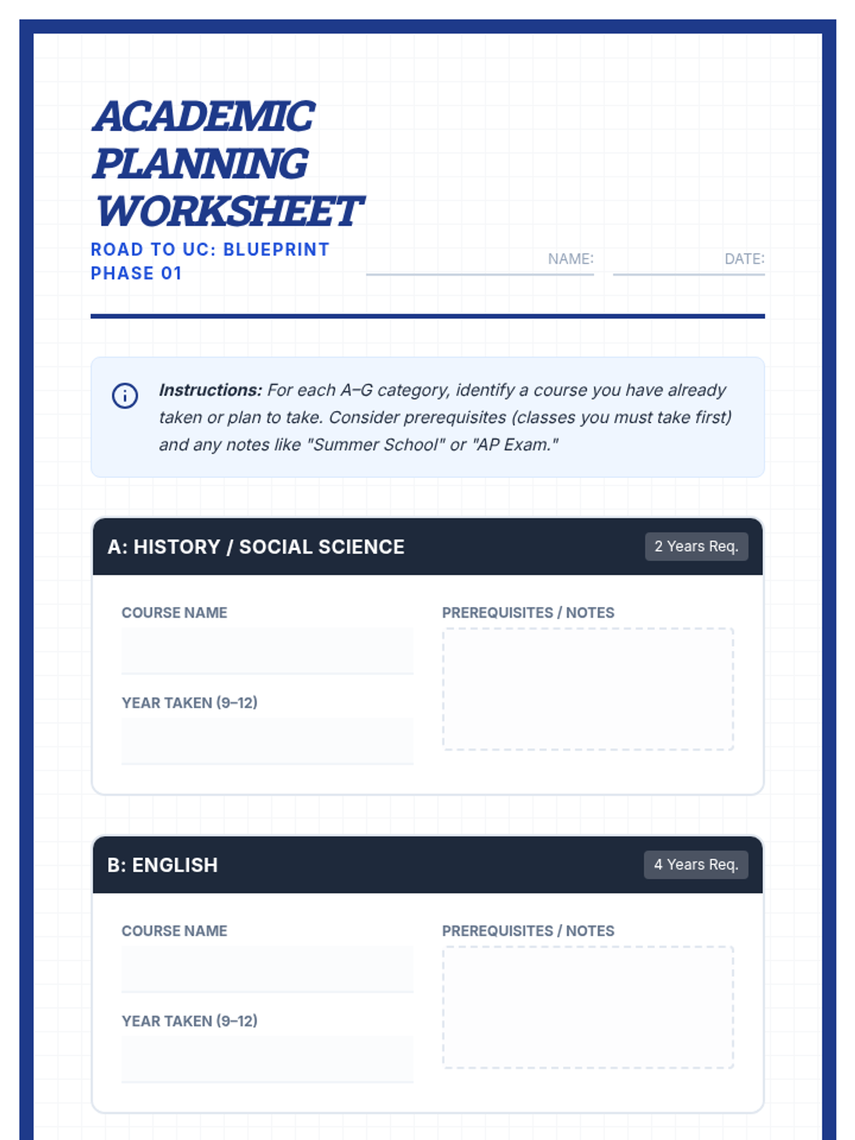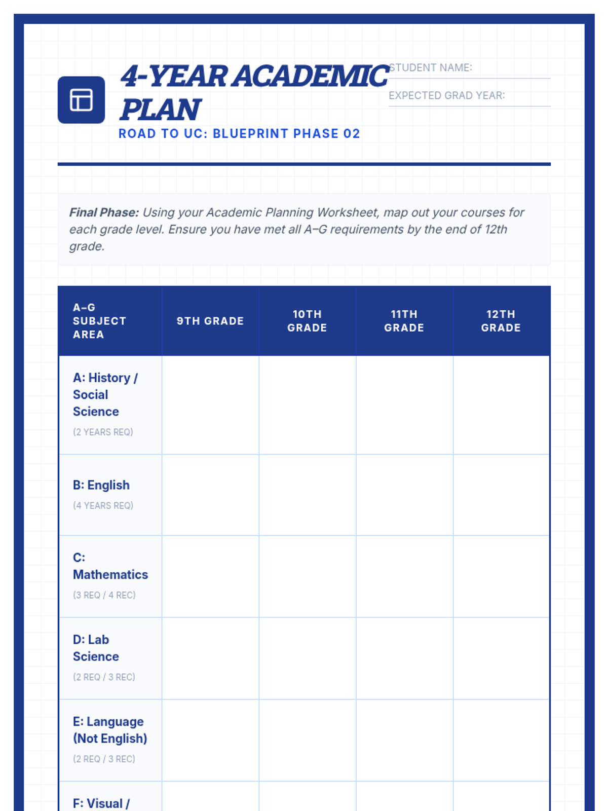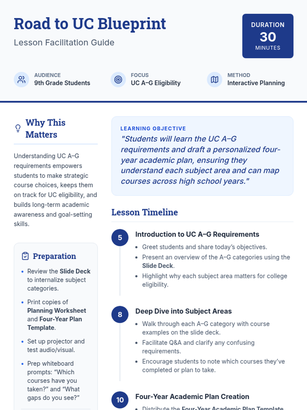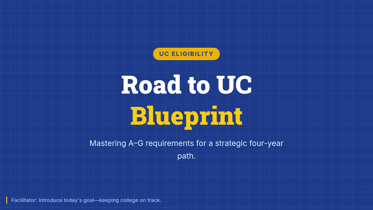 A foundational 30-minute session for 9th-grade students to master UC A–G requirements and draft a strategic four-year academic plan for college eligibility.