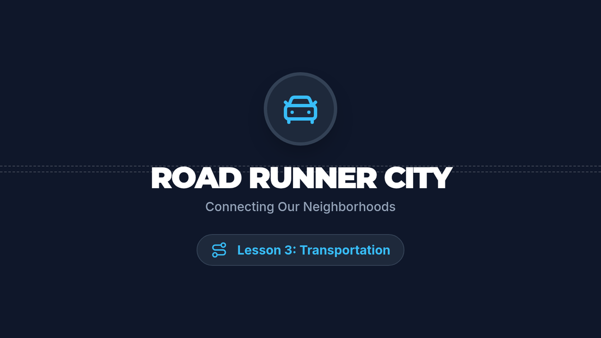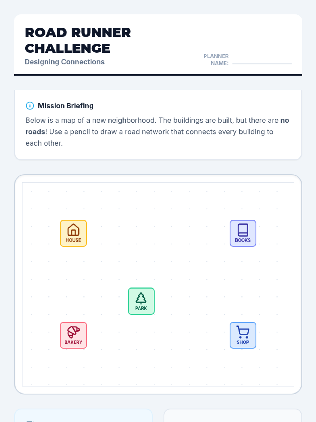 Students design road networks and transportation systems to connect different parts of their city, focusing on how people move safely and efficiently.