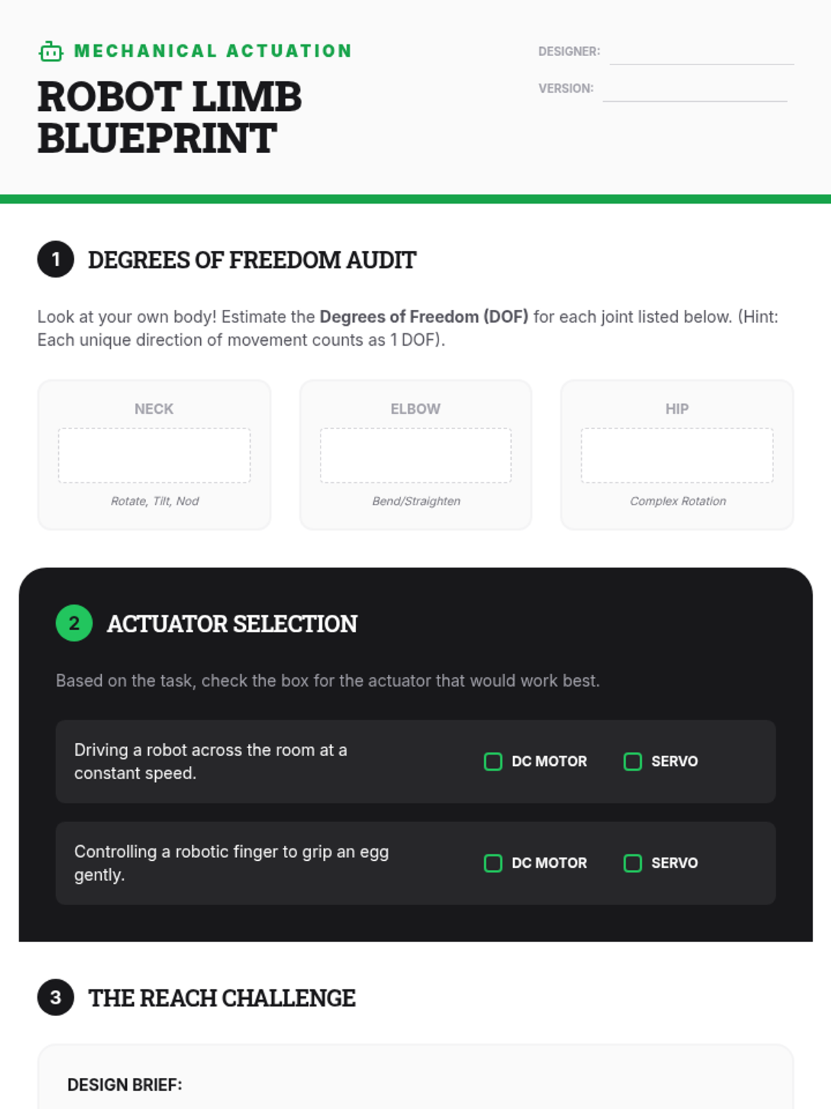 This lesson introduces robotic actuation, exploring degrees of freedom and the integration of motors with mechanical constraints.