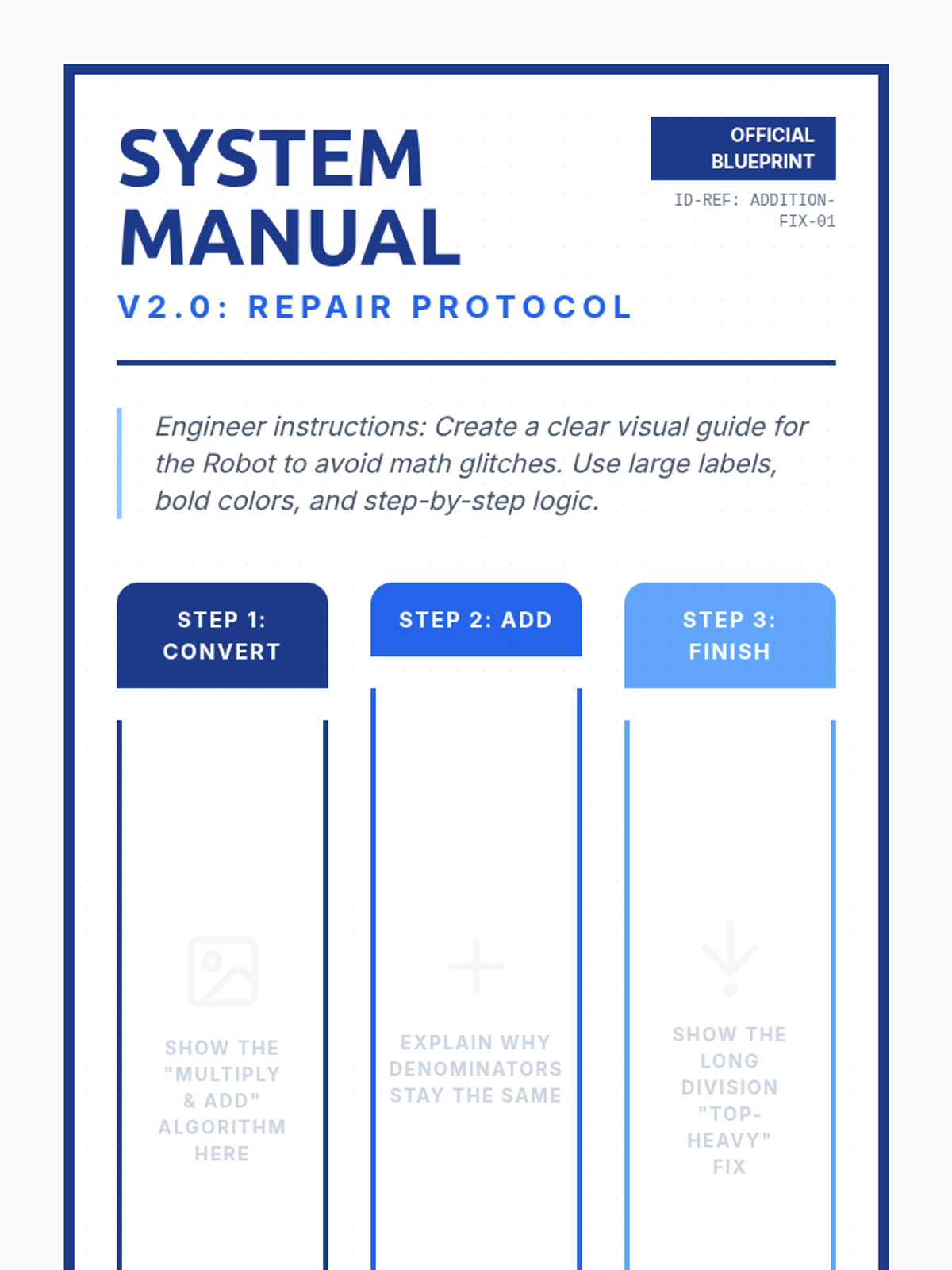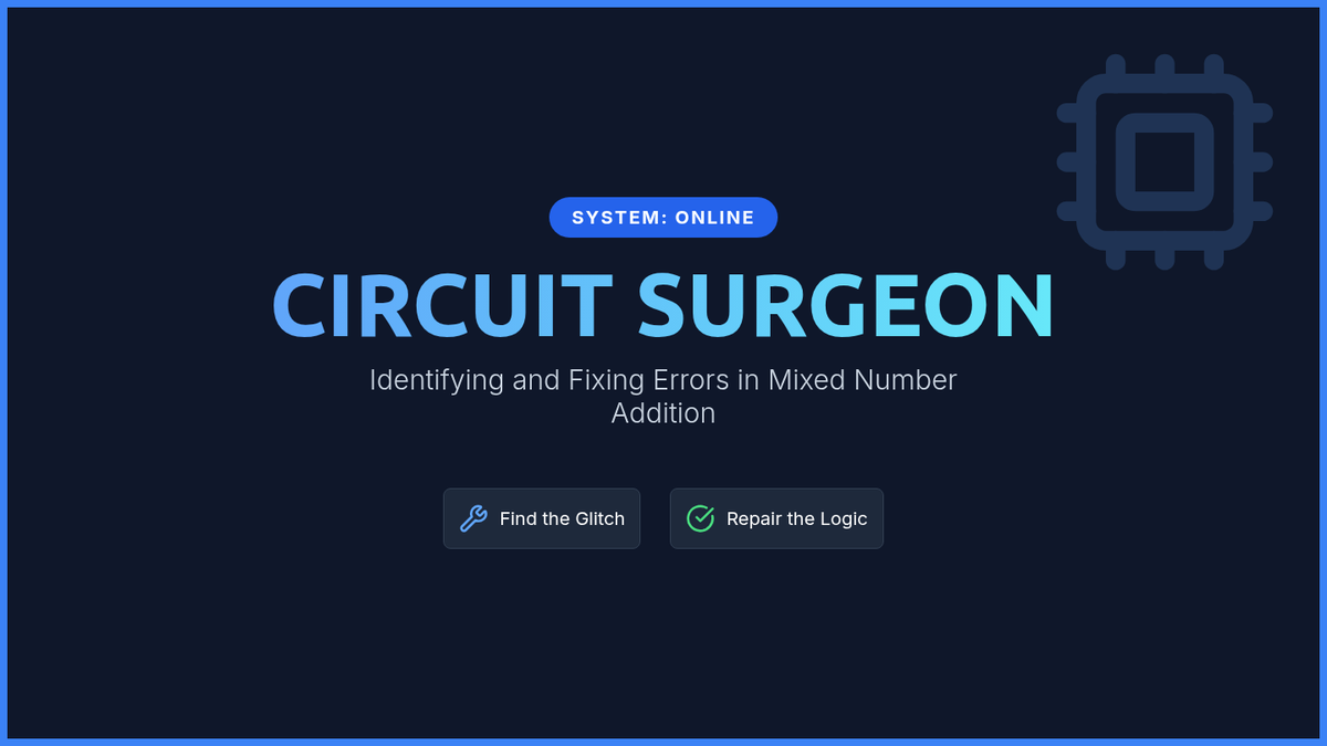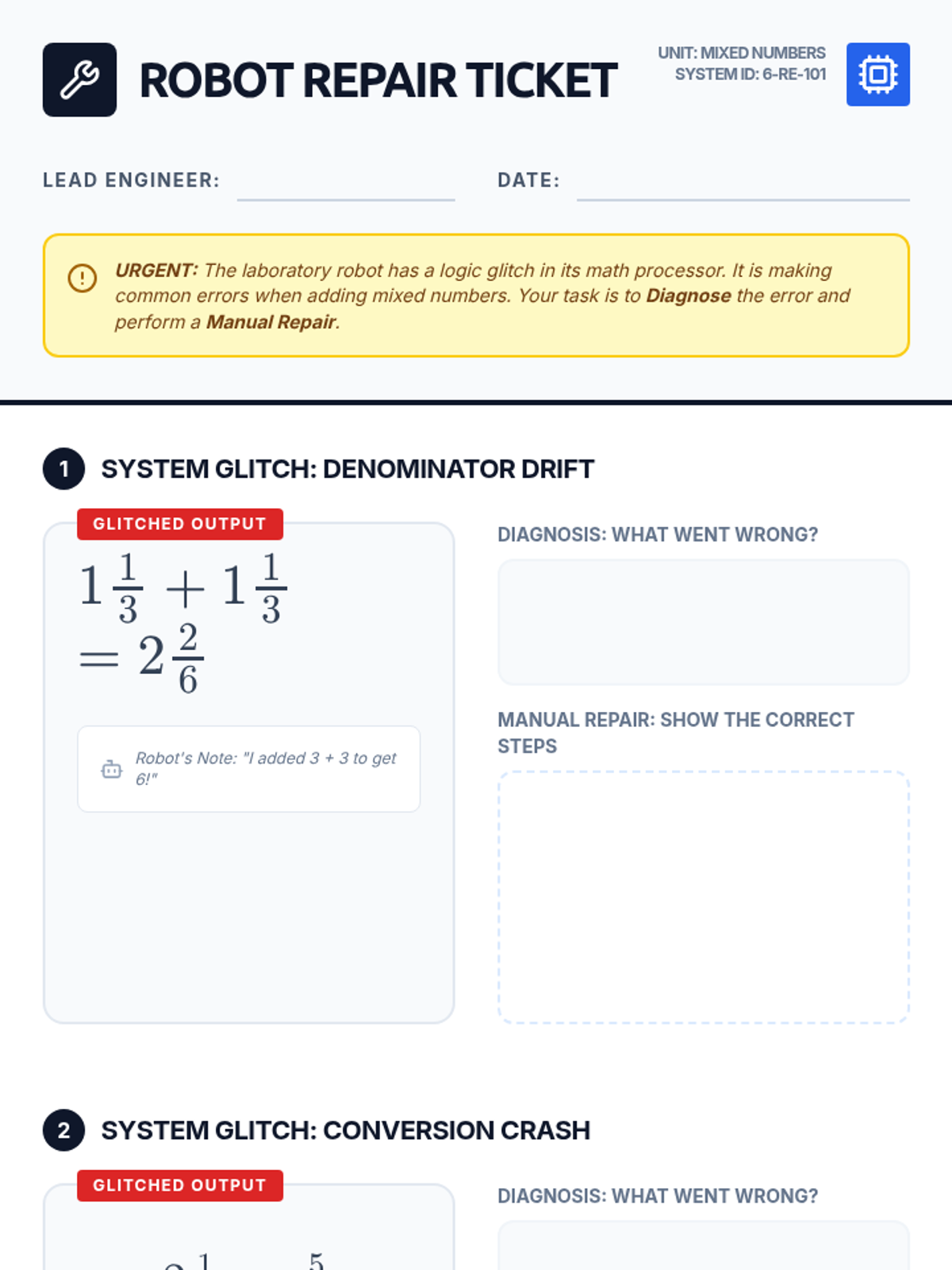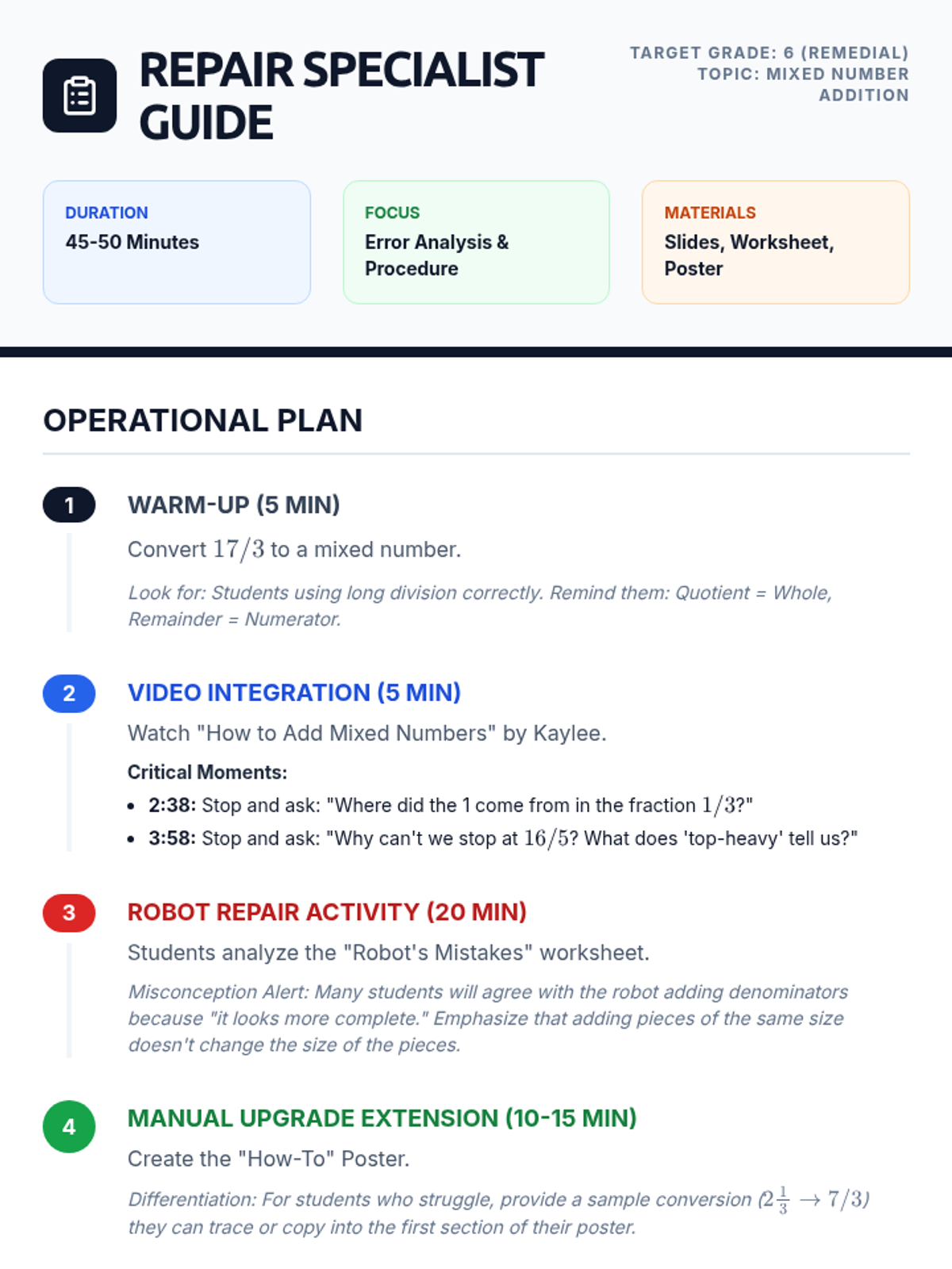 A remedial math lesson for 6th graders focused on identifying and correcting errors in mixed number addition using the improper fraction method. Students engage in error analysis through a "Robot Repair" theme, watching an instructional video and creating a procedural poster.