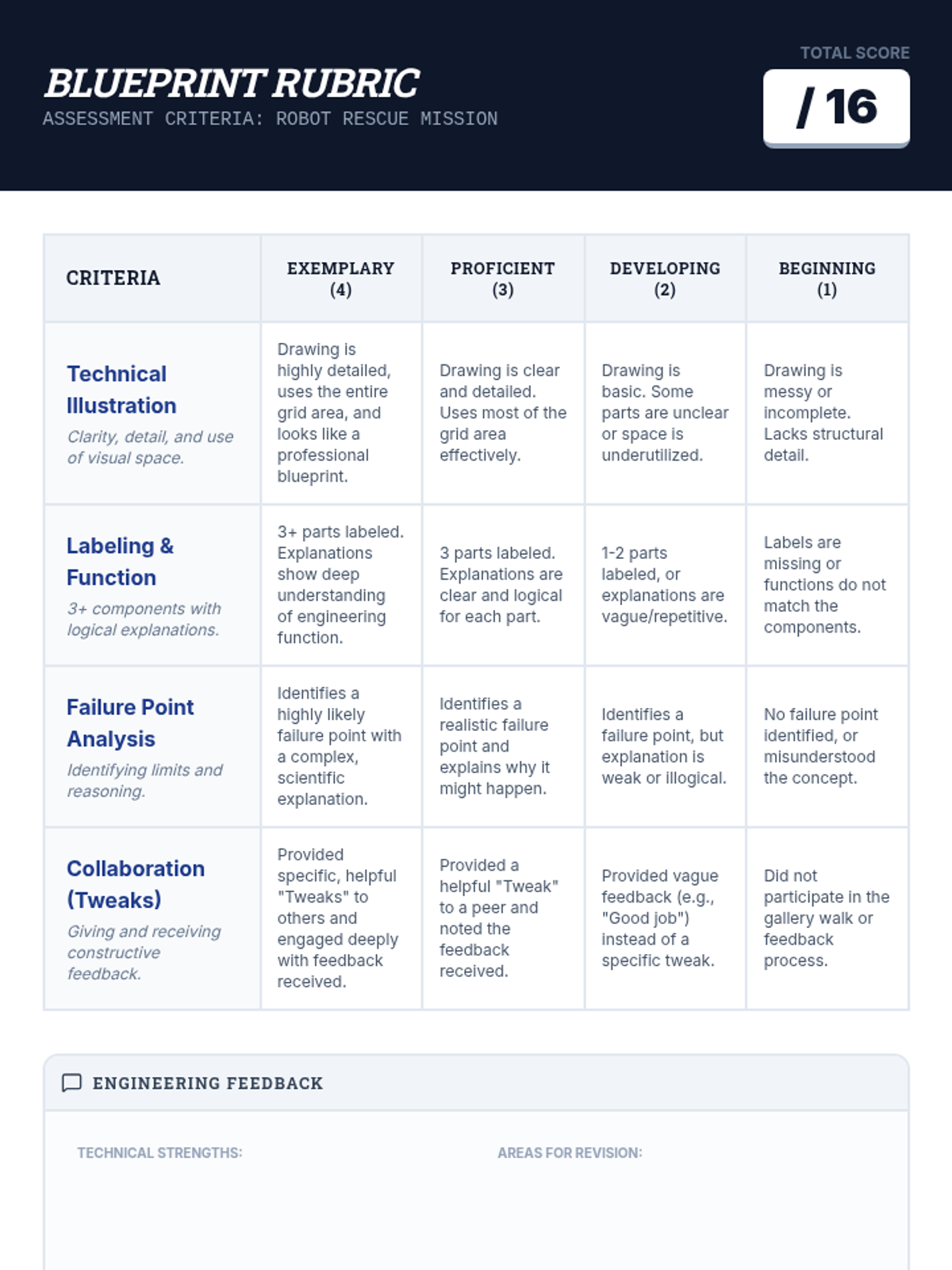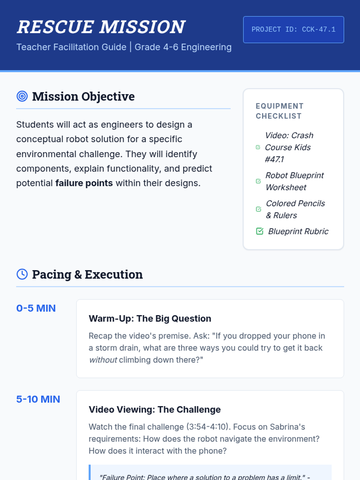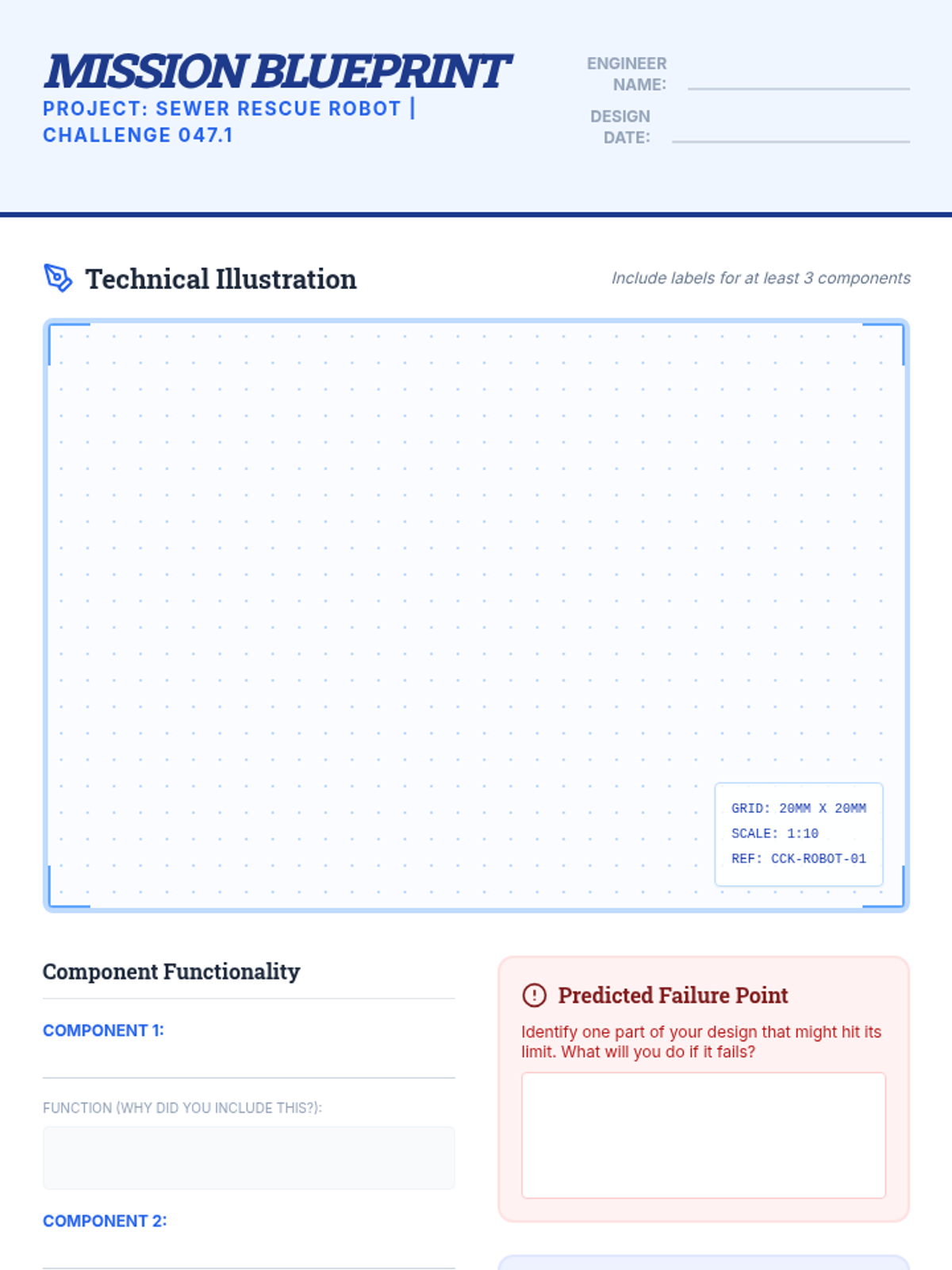 Students apply the engineering design process to design a conceptual robot that can retrieve a phone from a storm drain, focusing on identifying failure points and isolating variables.