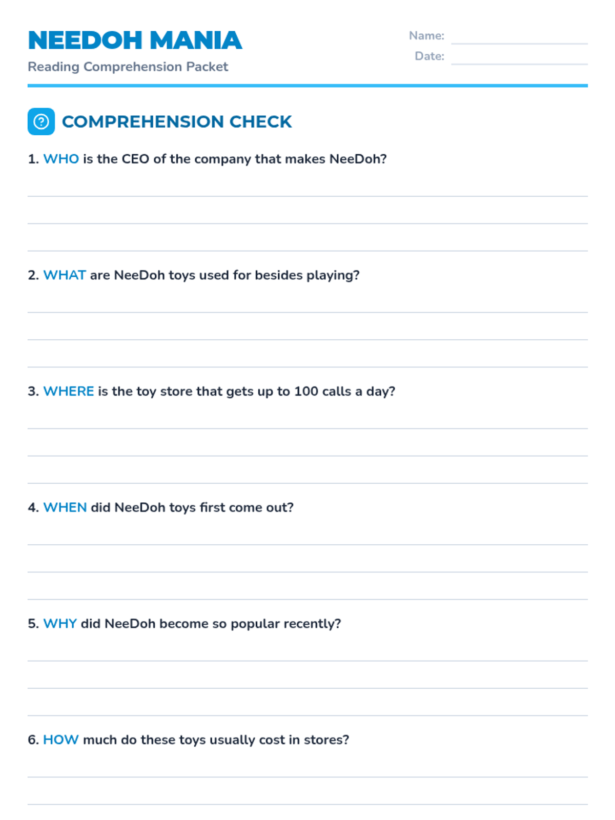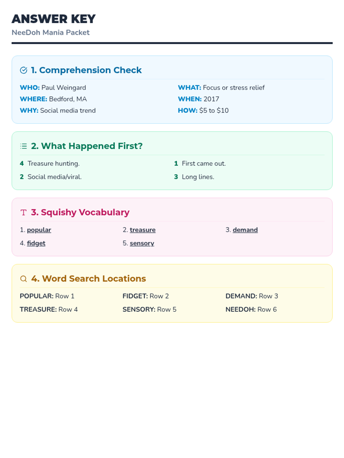 A packet of activities based on the viral NeeDoh toy trend, designed for 3rd-grade students to practice comprehension, vocabulary, and sequencing skills.