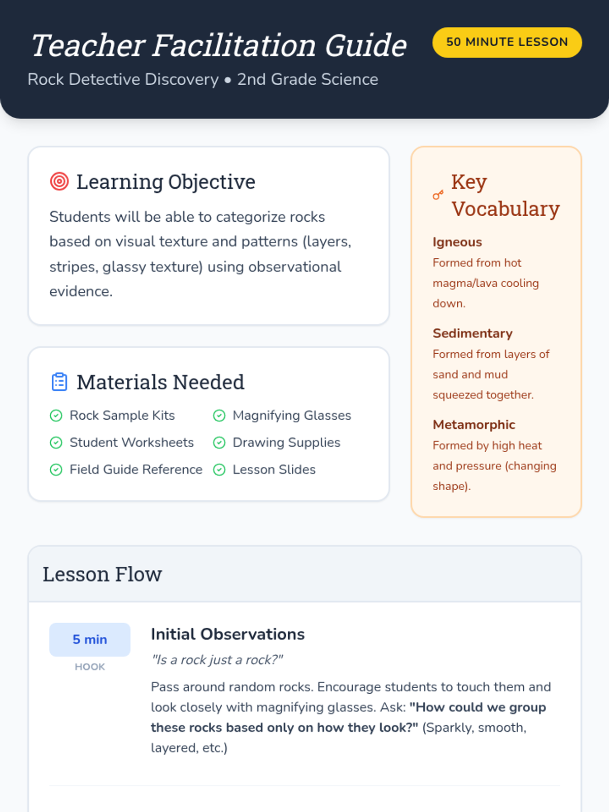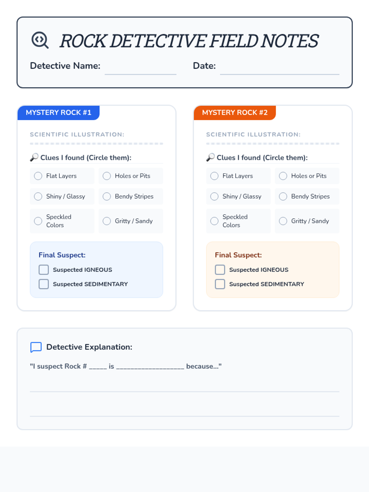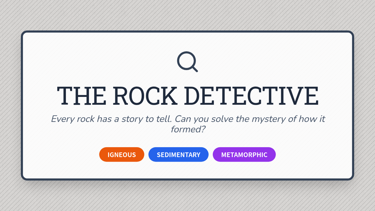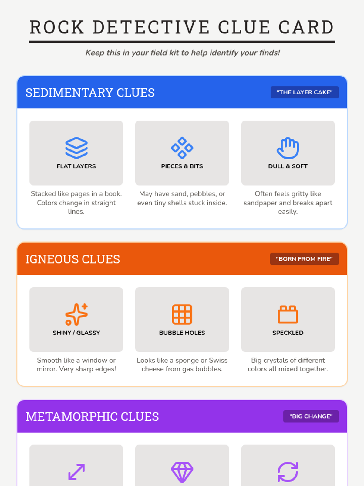 Students become 'Rock Detectives' as they learn to categorize rocks based on visual patterns like layers, stripes, and textures through a video-guided observation and an outdoor field walk.