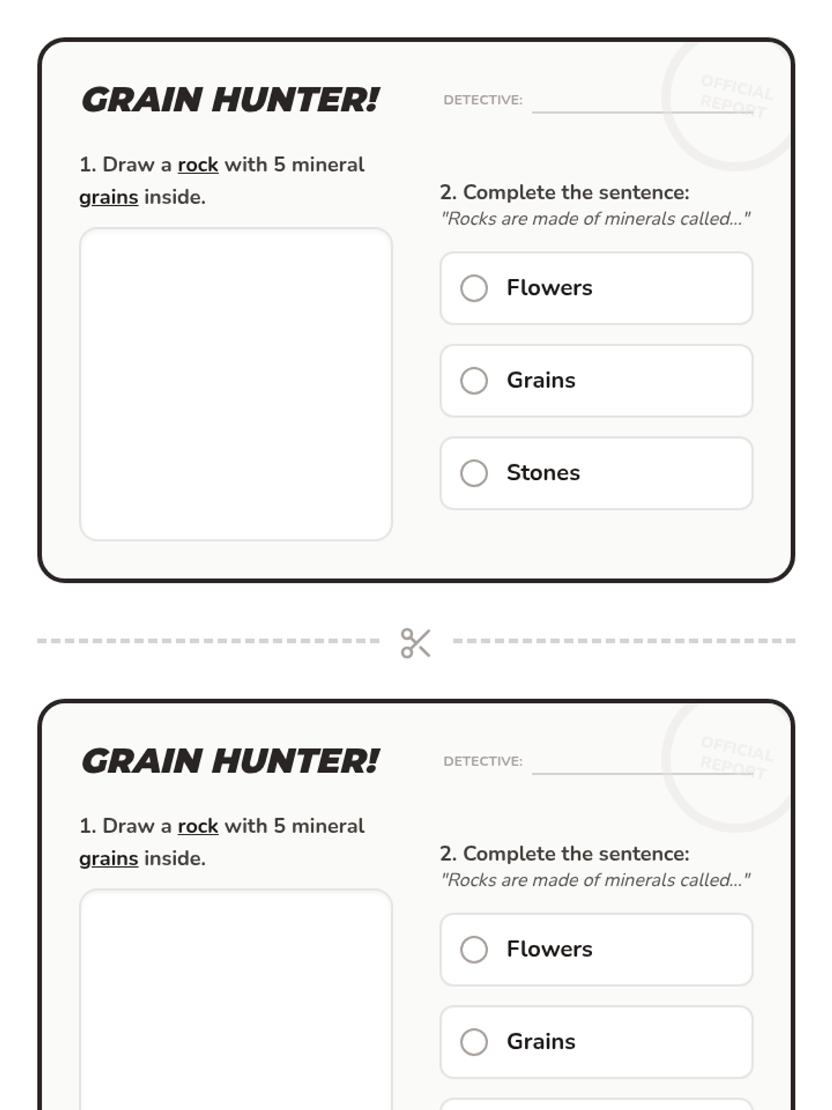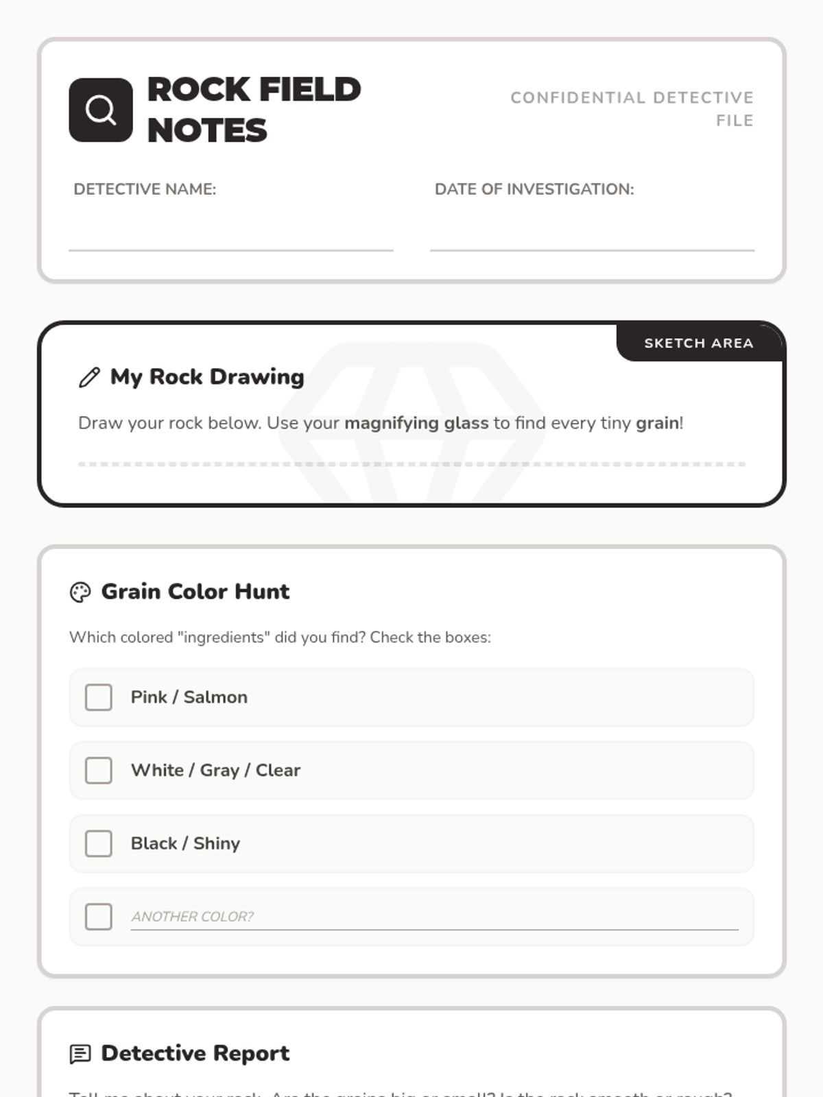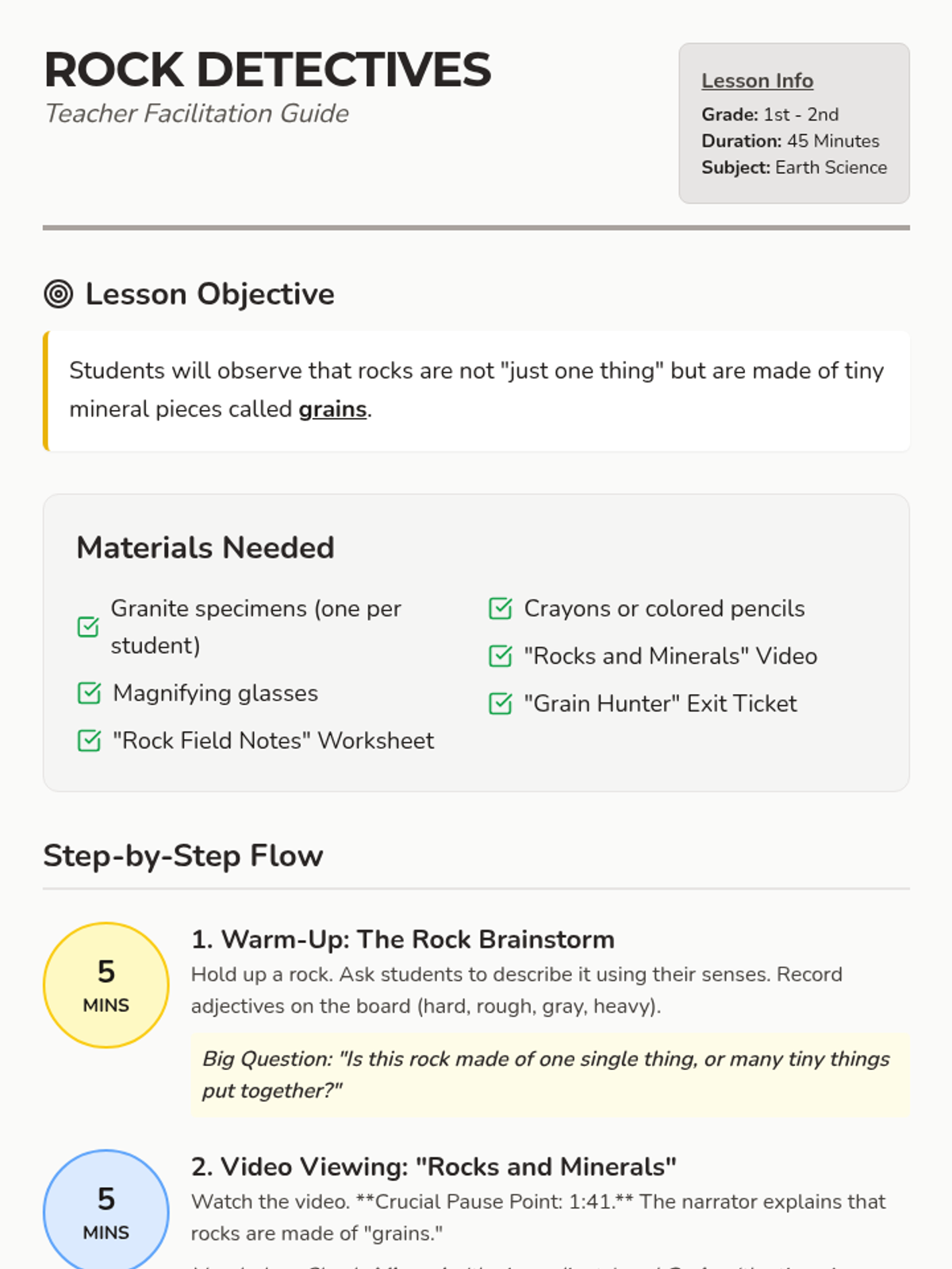 A hands-on introductory geology lesson for 1st and 2nd graders that explores the composition of rocks. Students act as 'detectives' using magnifying glasses to discover that rocks are made of mineral 'grains,' using granite as a primary example.