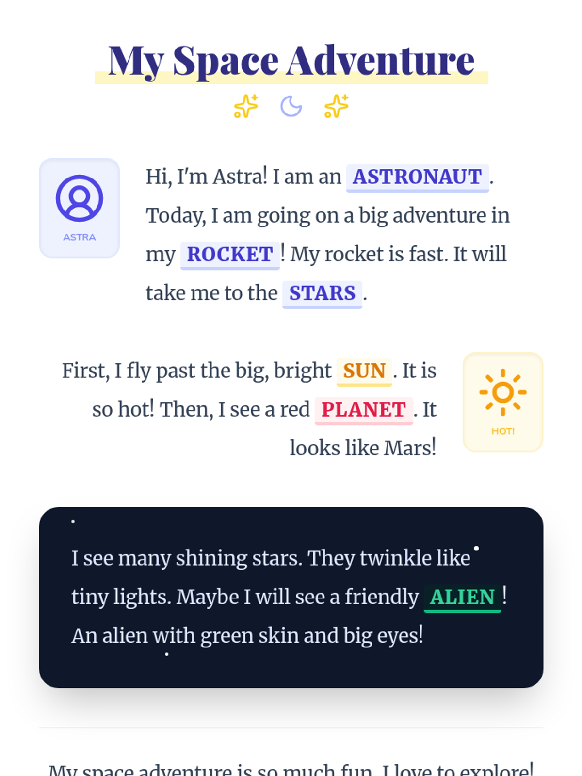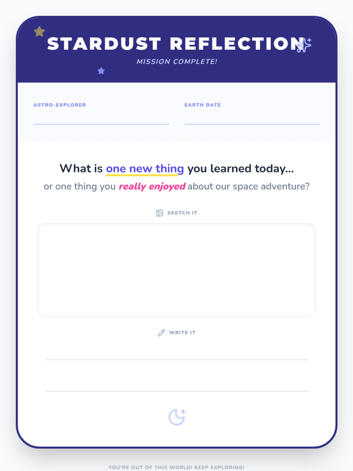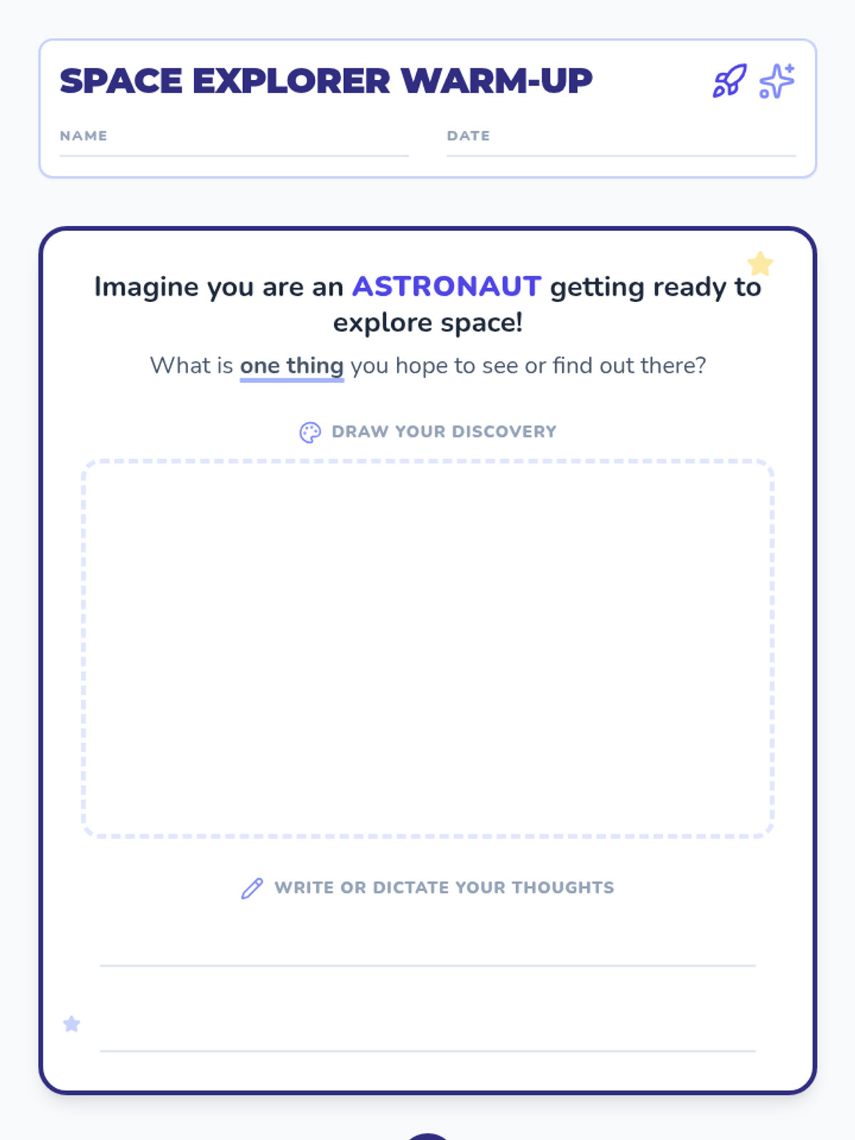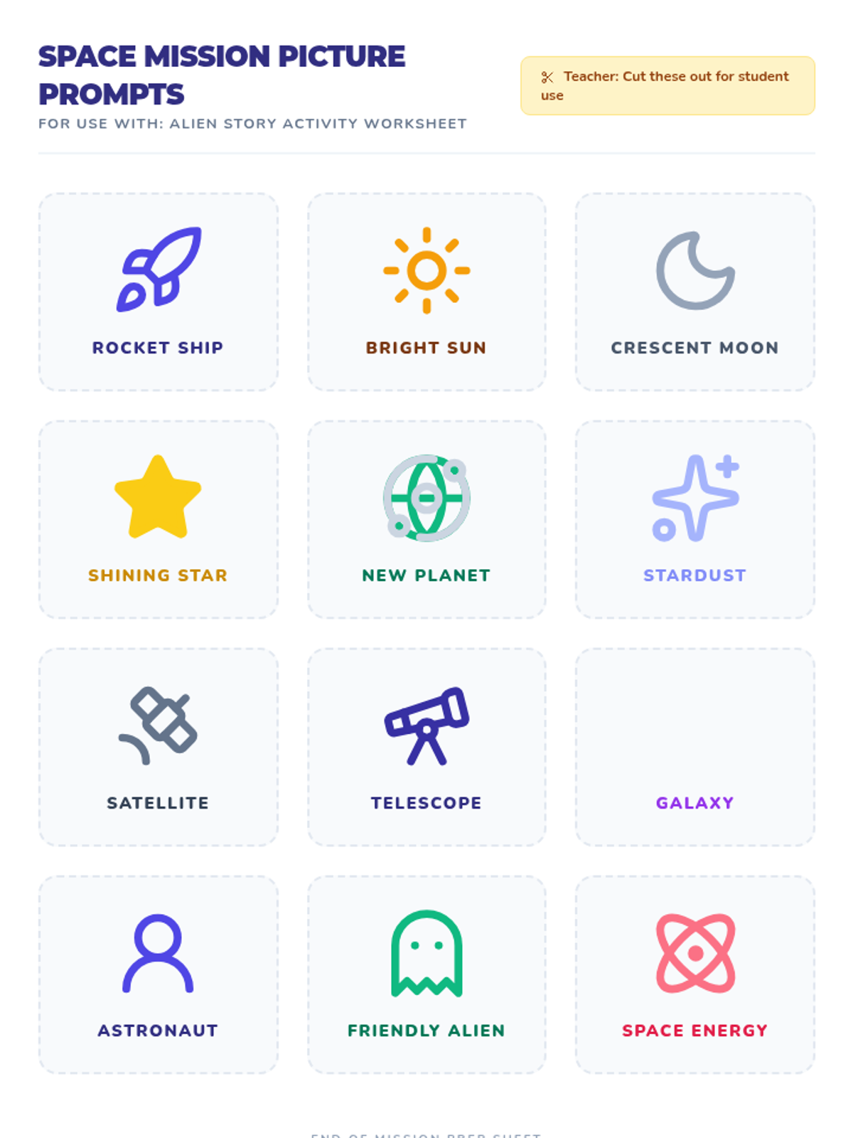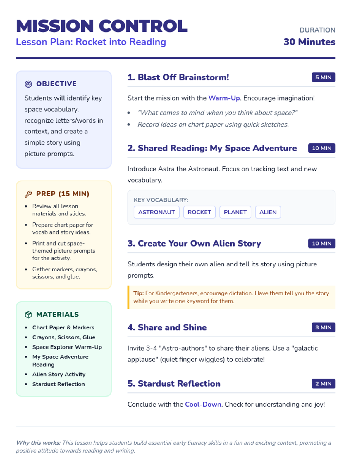 A 30-minute ELA lesson for K-1 students using a space theme to build vocabulary, letter recognition, and creative storytelling skills.