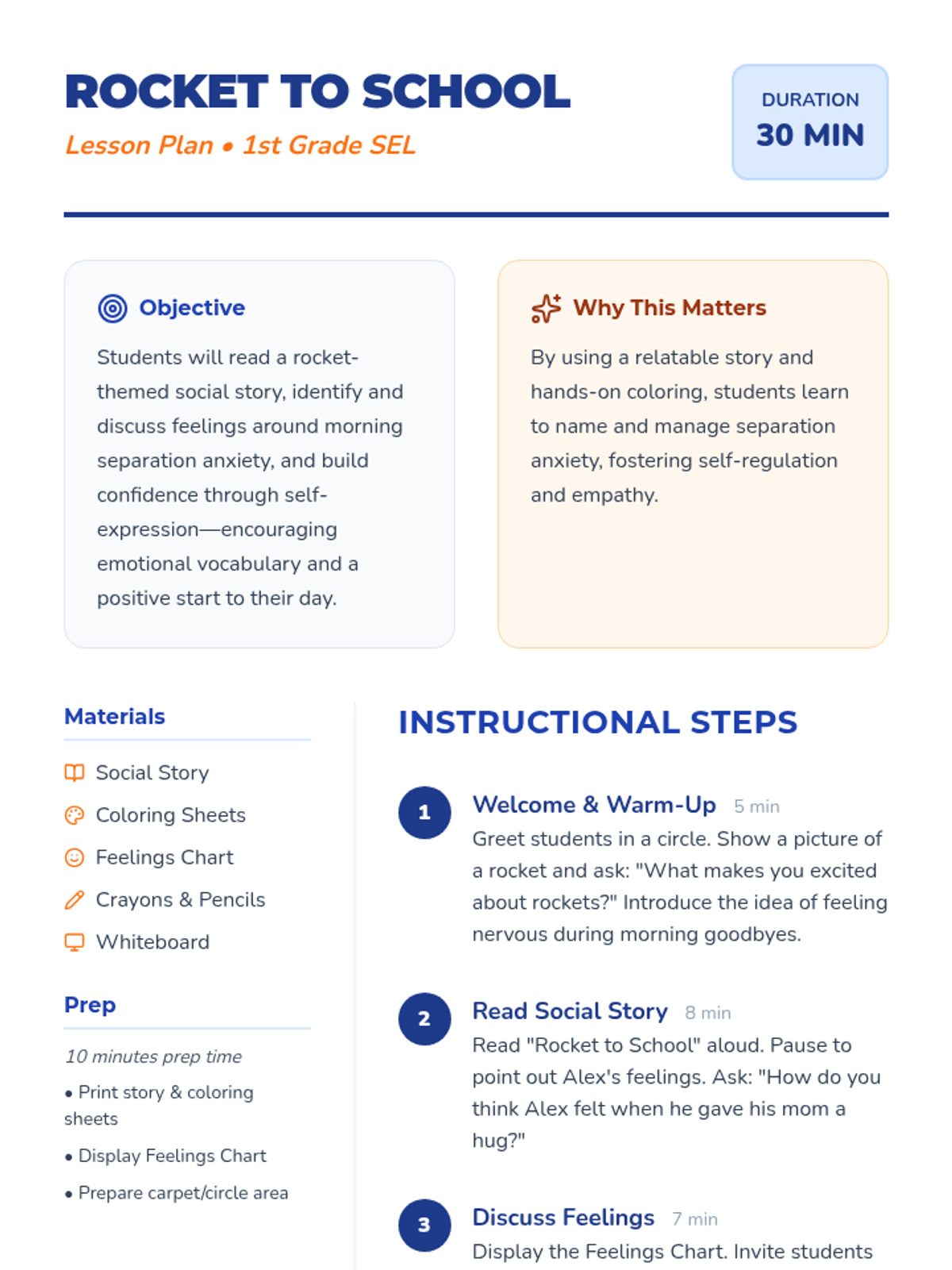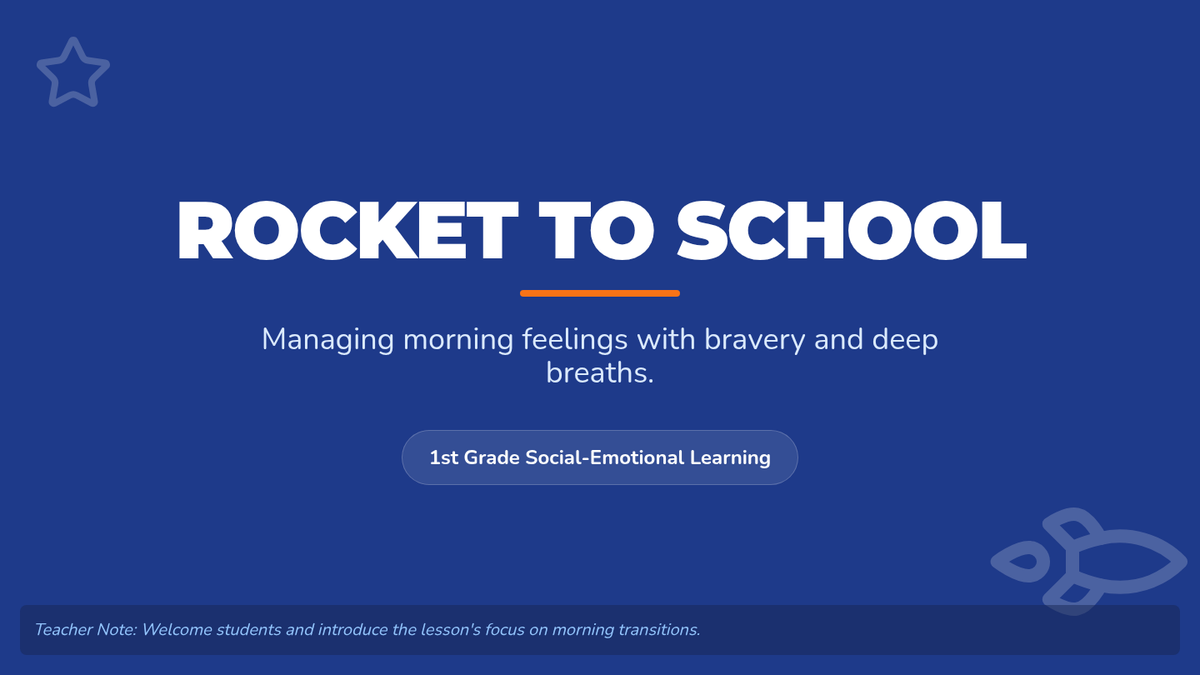 A 30-minute social-emotional learning lesson for 1st graders focused on overcoming morning separation anxiety through a relatable rocket-themed story and activities.