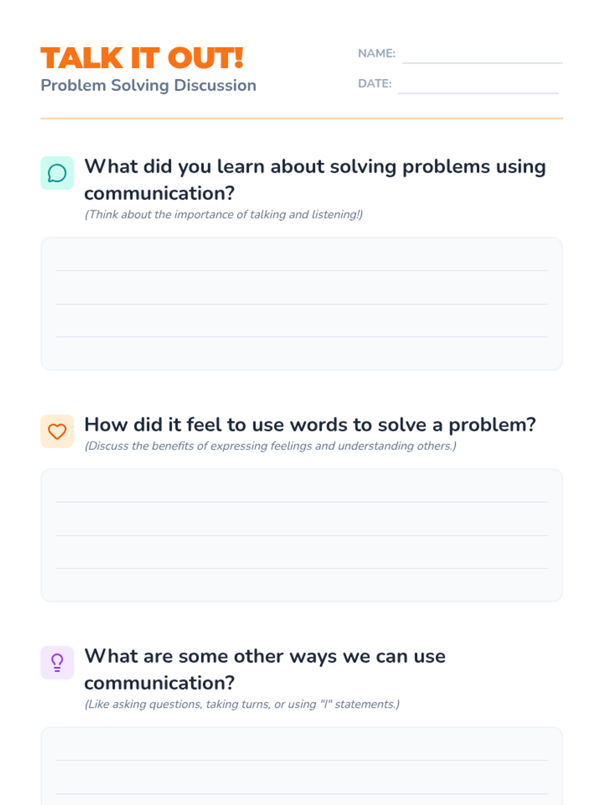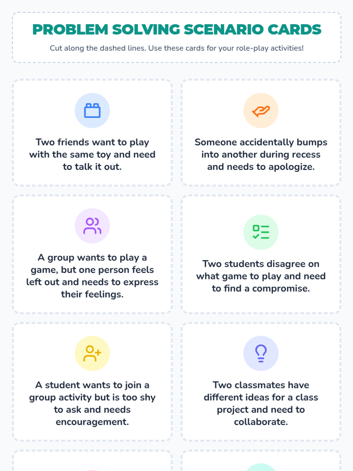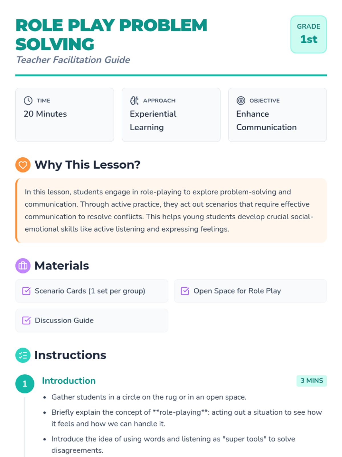 A 20-minute experiential lesson for 1st graders focused on resolving conflicts through role-play and effective communication. Students practice active listening and expressing feelings in common social scenarios.