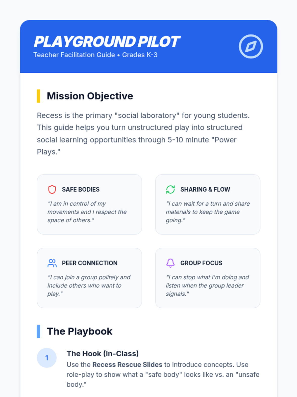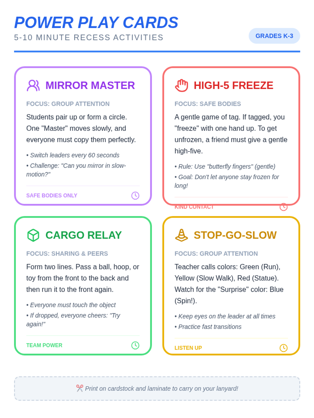 A collection of quick, 5-10 minute activities designed to teach K-3 students social-emotional skills like sharing, safe bodies, and group attention during recess.