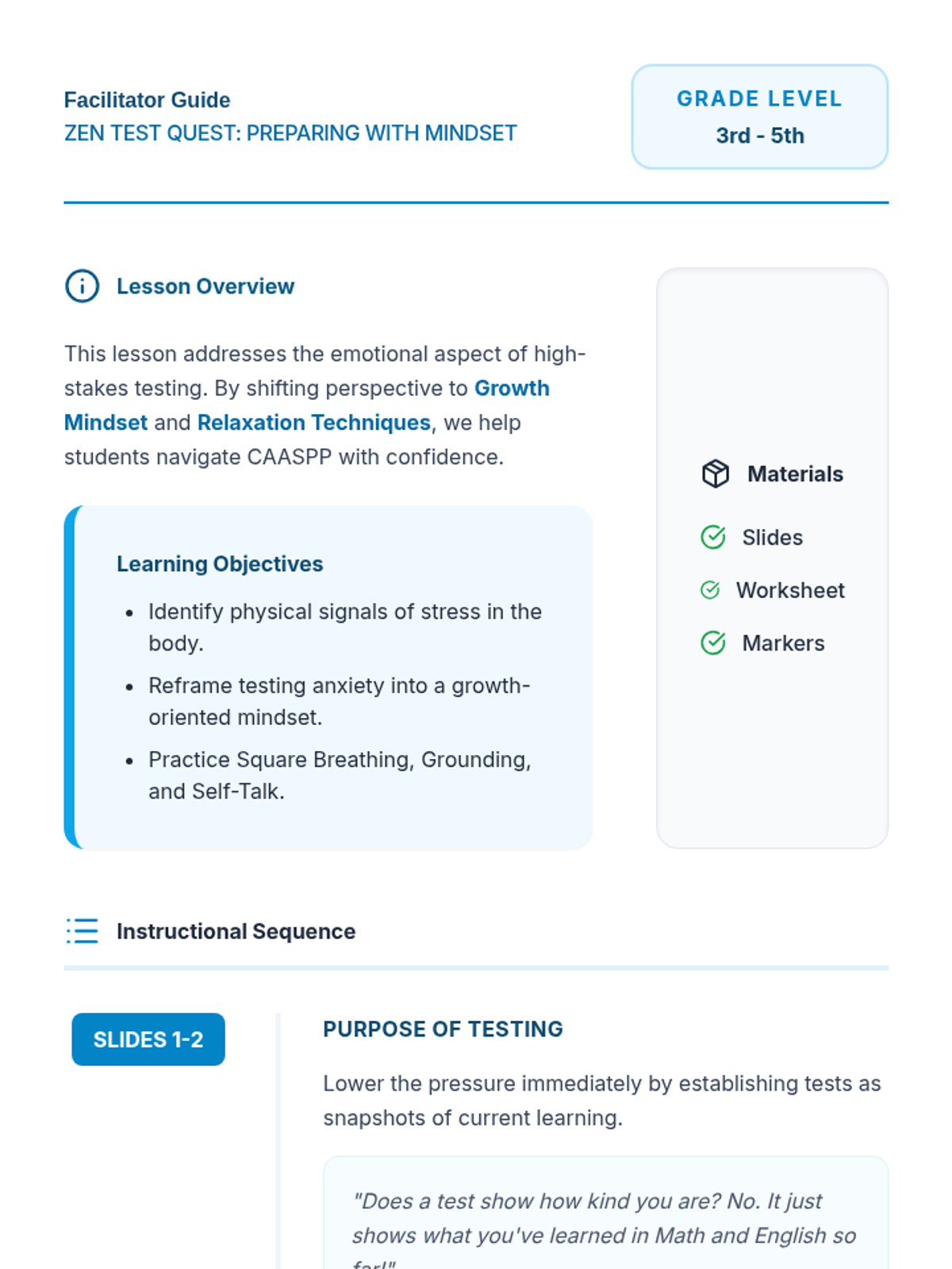 A growth-mindset focused lesson designed to help 3rd-5th grade students manage CAASPP testing anxiety using mindfulness and relaxation techniques. Students learn to view testing as an opportunity to showcase their learning and identify growth areas.