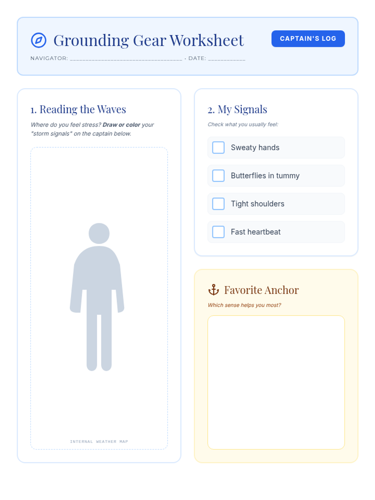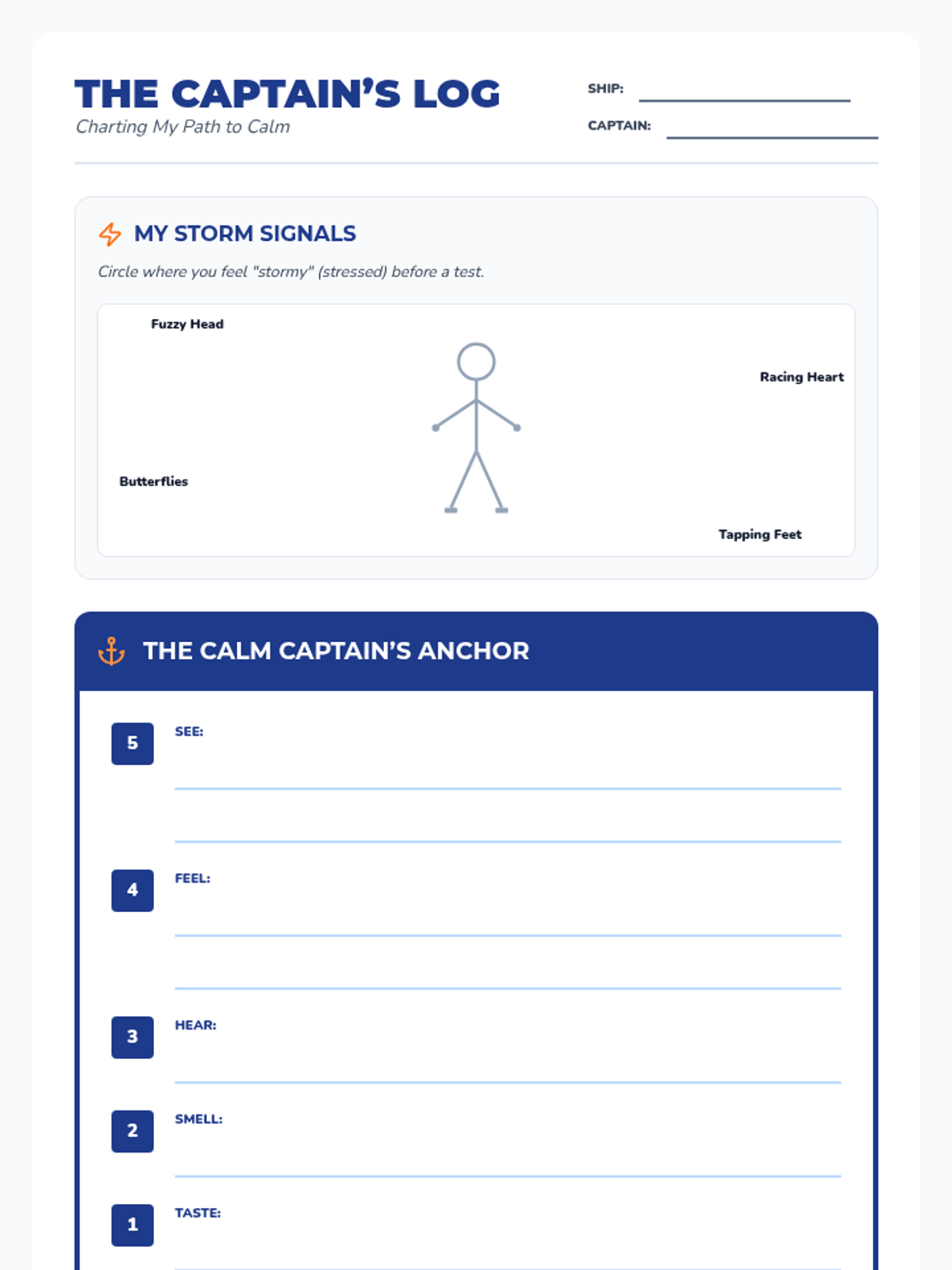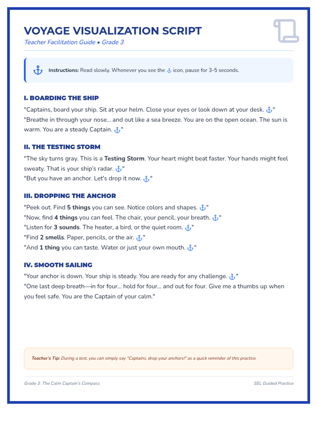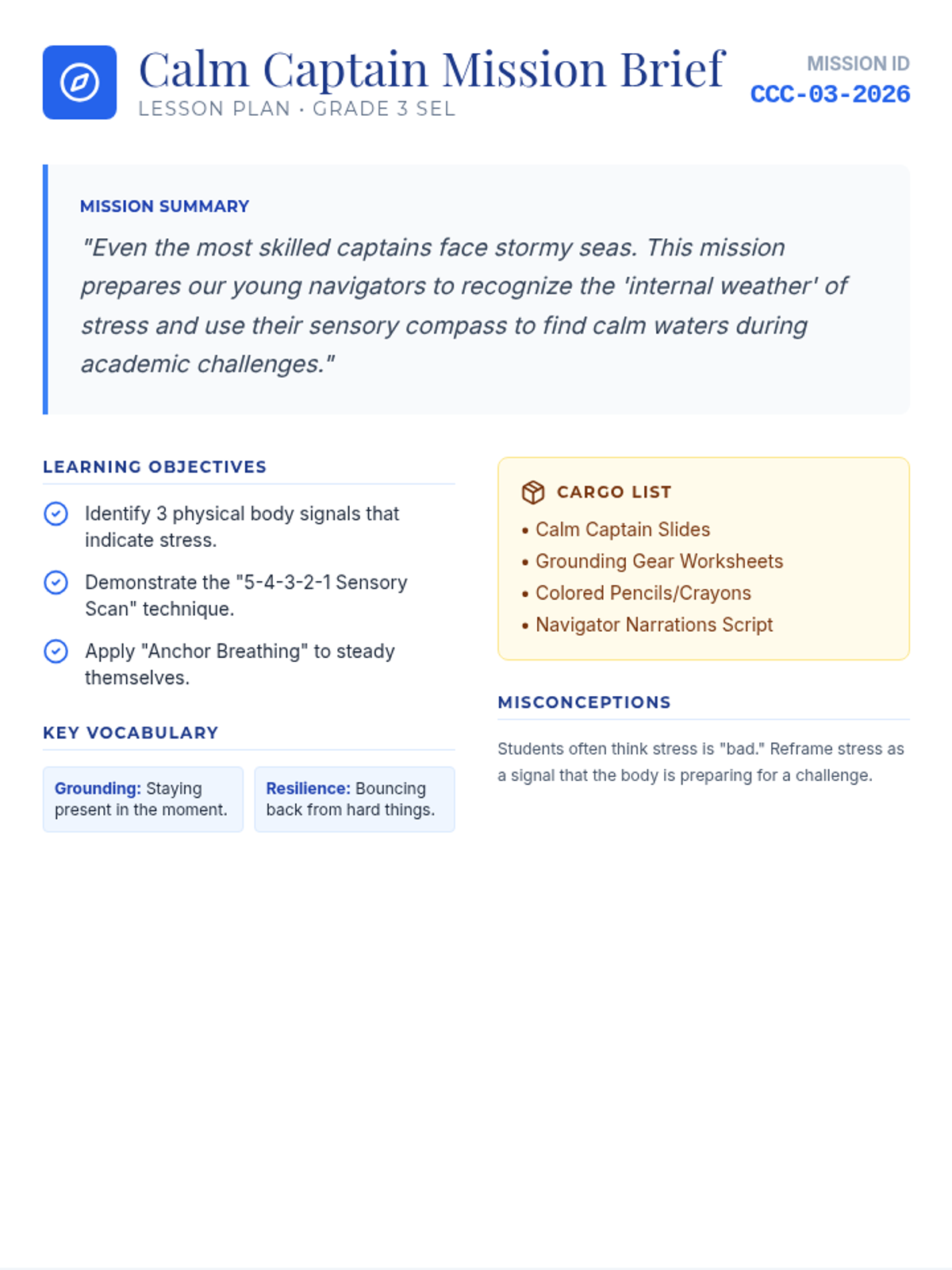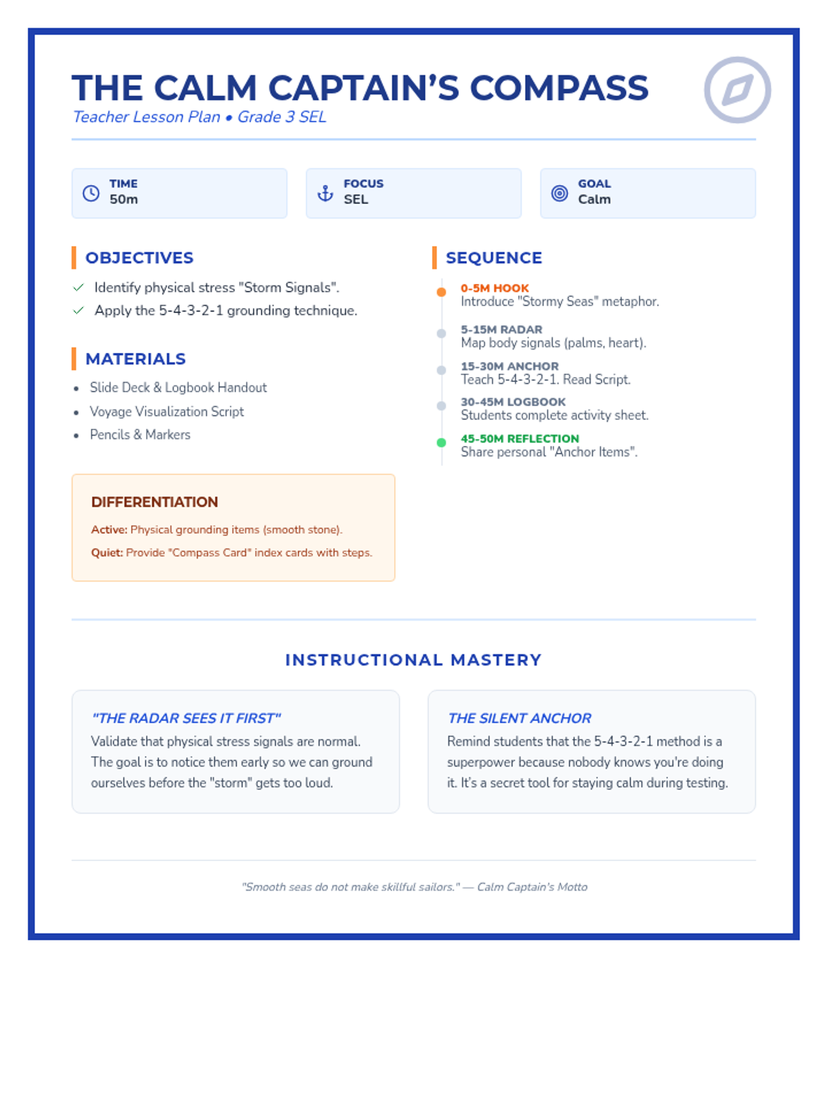 A nautical-themed social-emotional learning lesson for 3rd graders to identify stress triggers and master sensory grounding techniques for academic resilience.