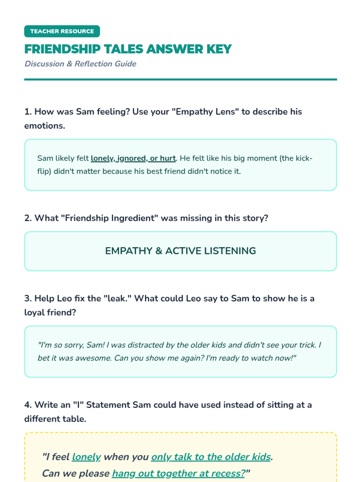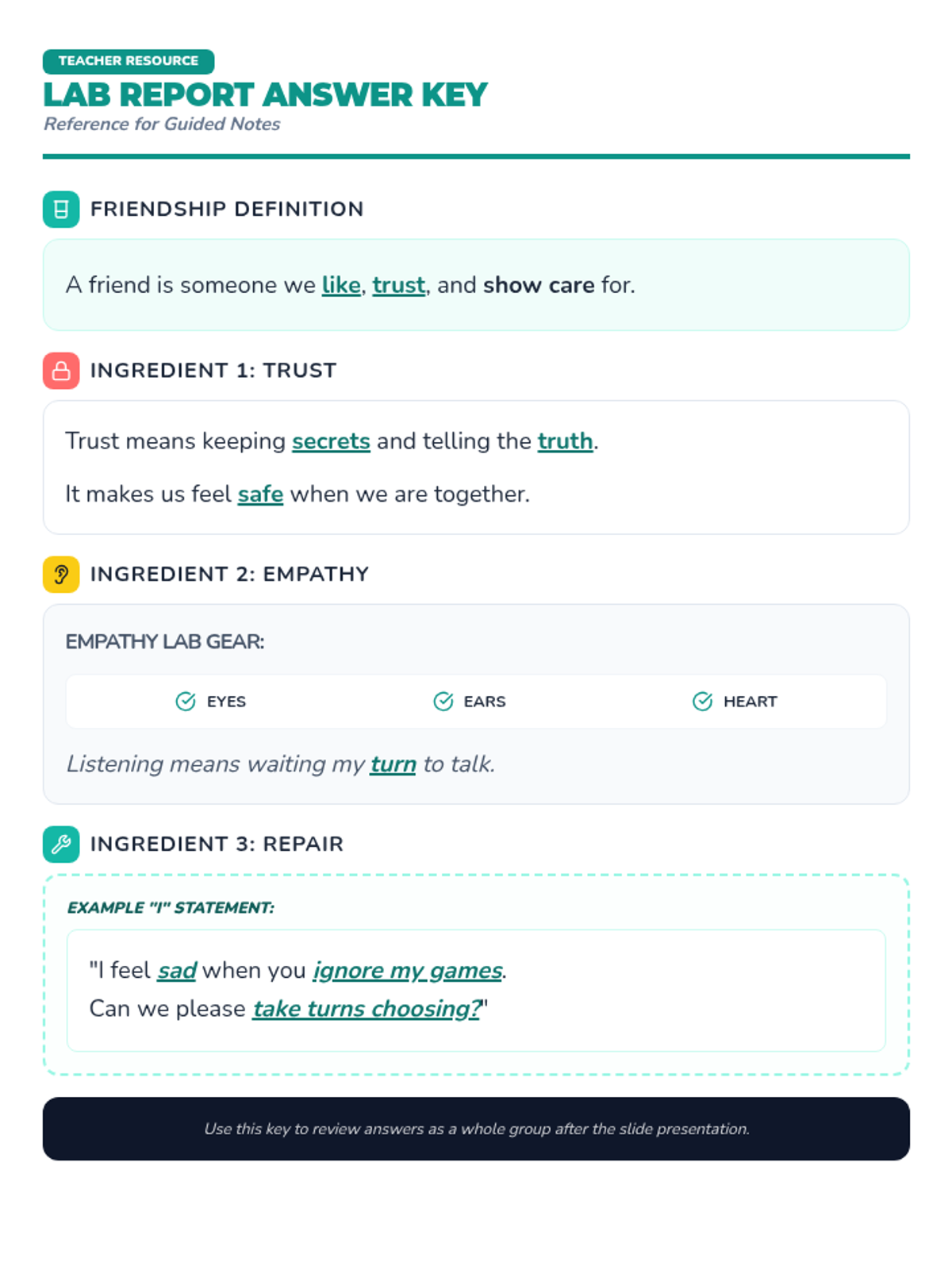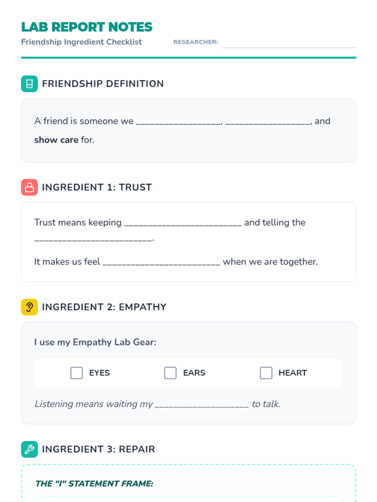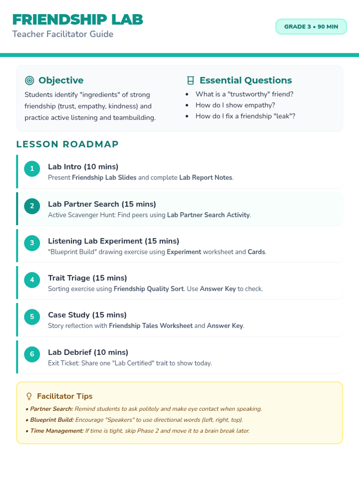 A comprehensive lesson for 3rd graders focused on identifying and practicing key friendship qualities like trust, empathy, and kindness through a "Friendship Lab" theme.