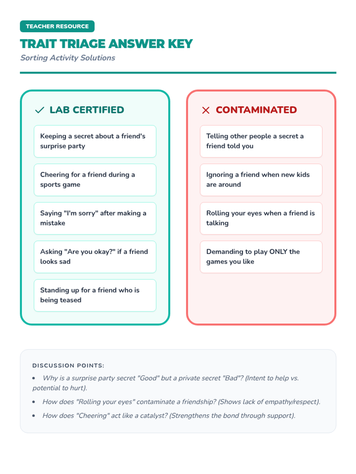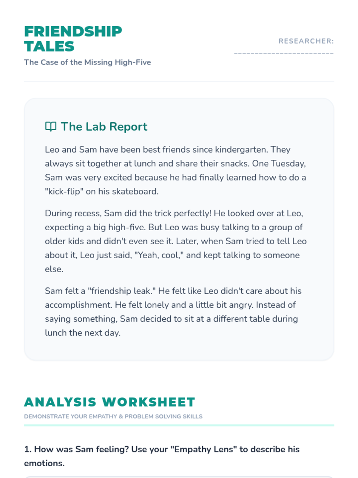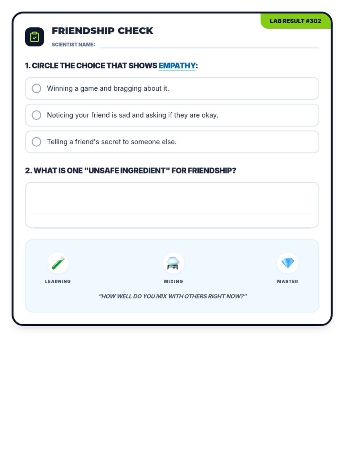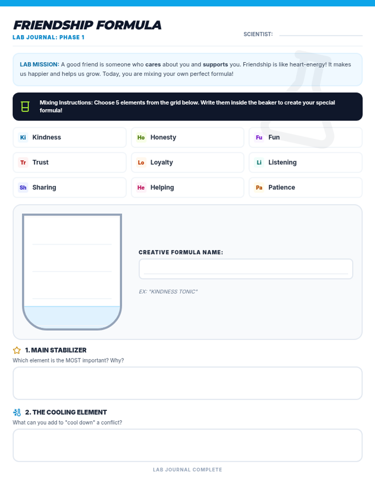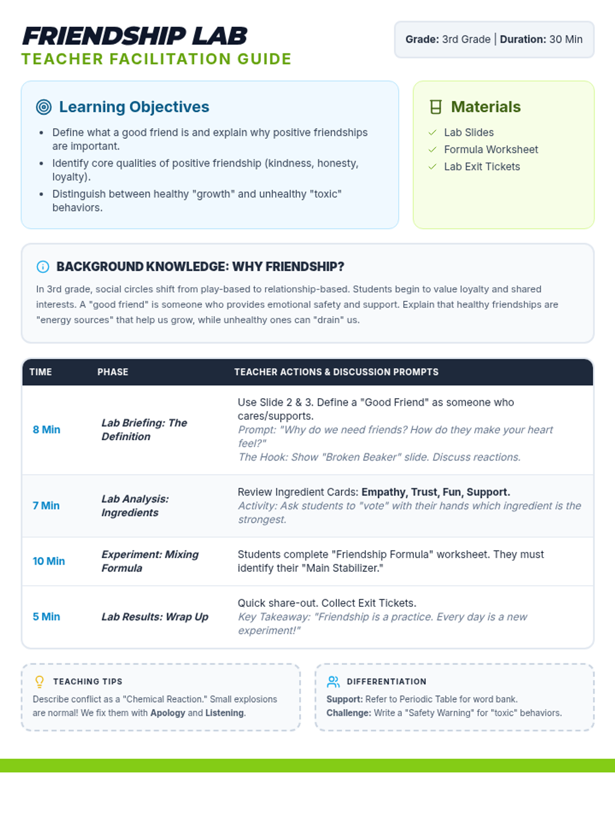 A 30-minute social-emotional learning lesson for 3rd graders focused on identifying and practicing the qualities of a good friend using a science lab theme.