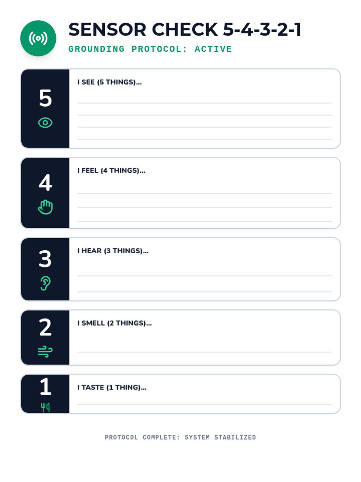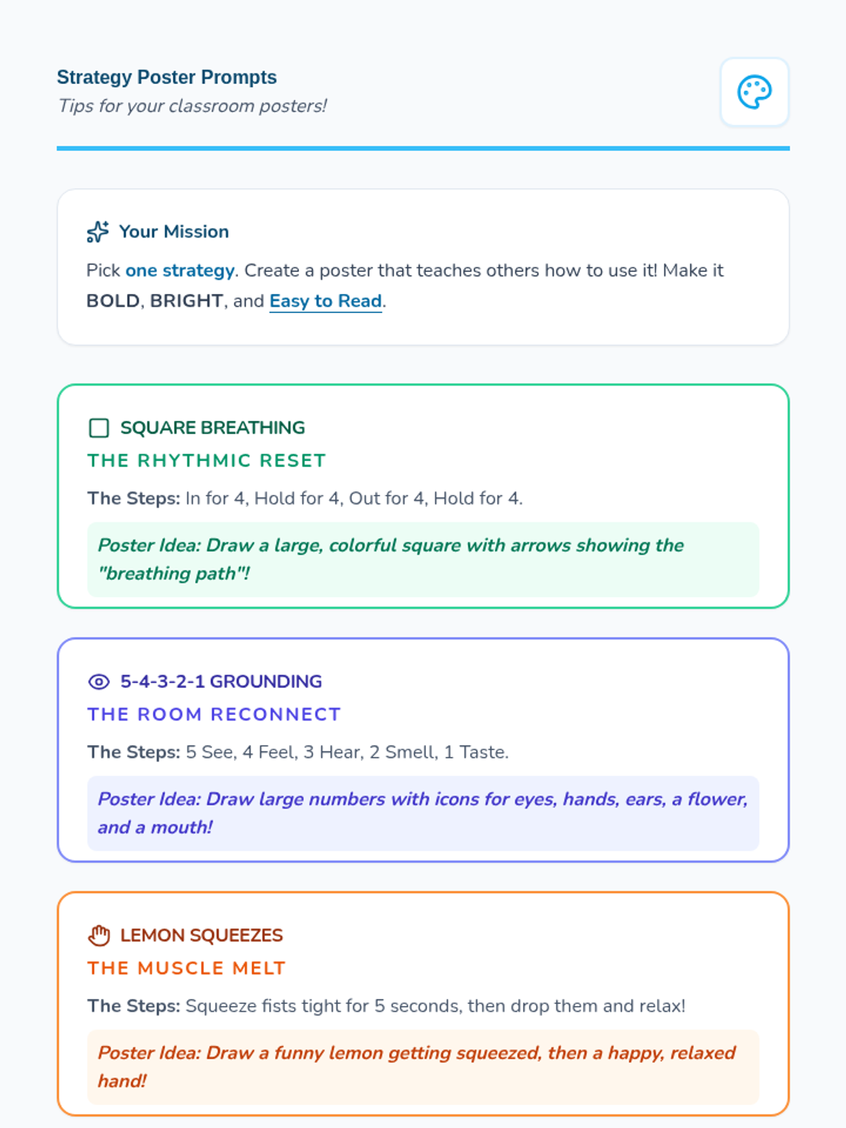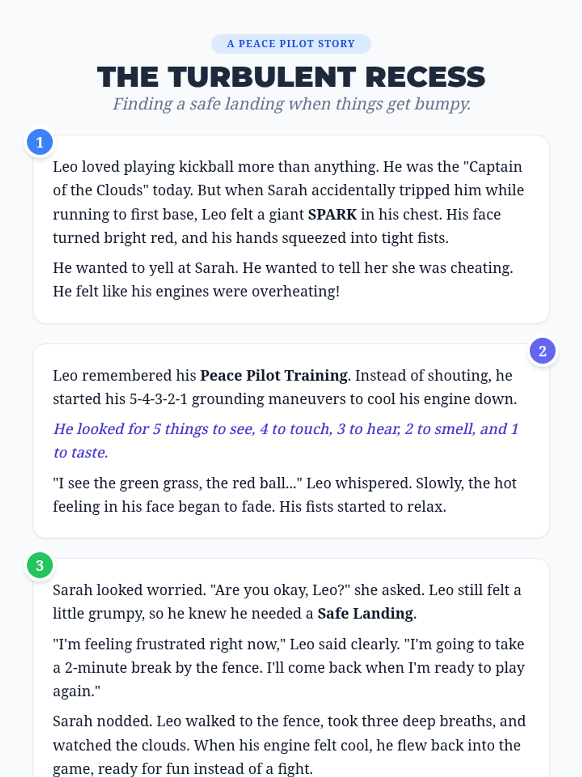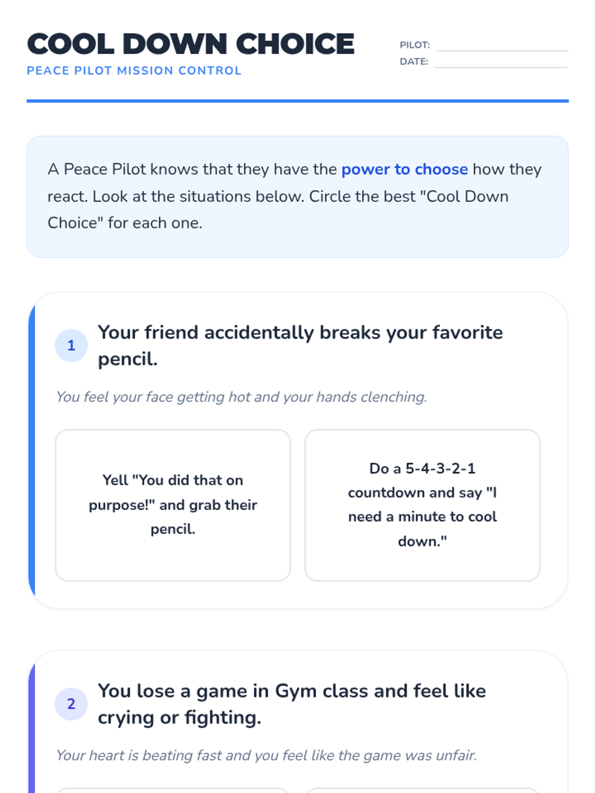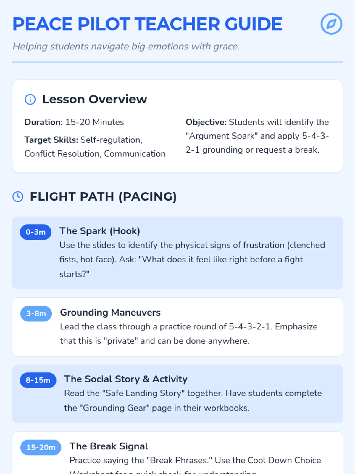 A lesson focused on self-regulation techniques, specifically the 5-4-3-2-1 grounding method and requesting breaks, to help students choose calm over conflict.
