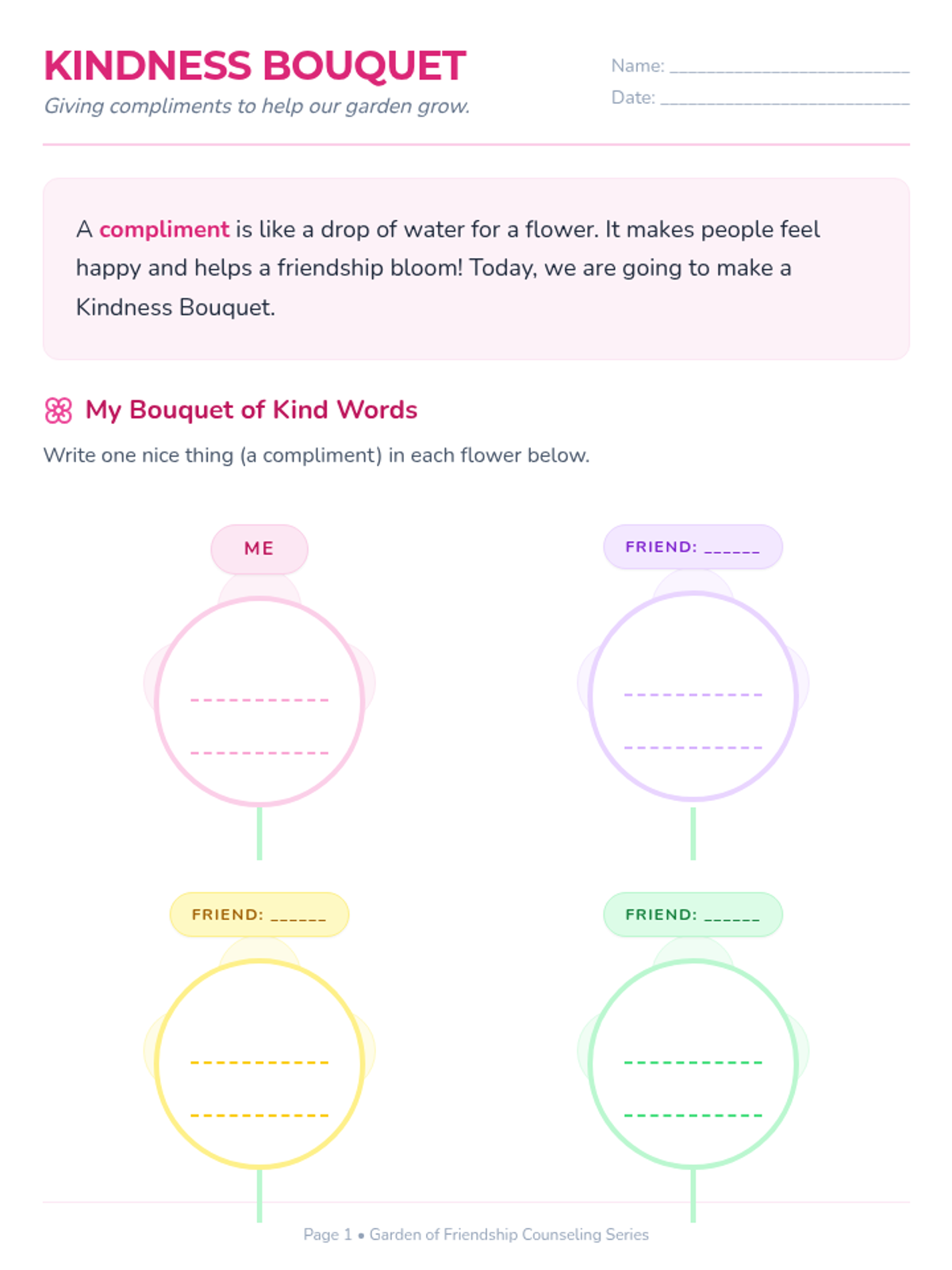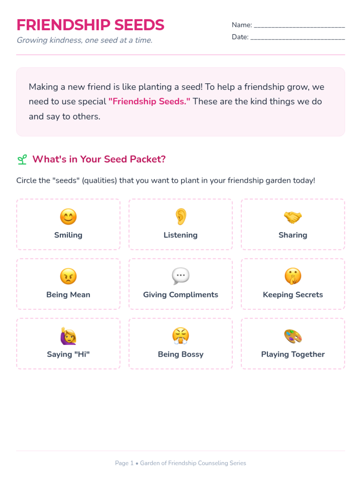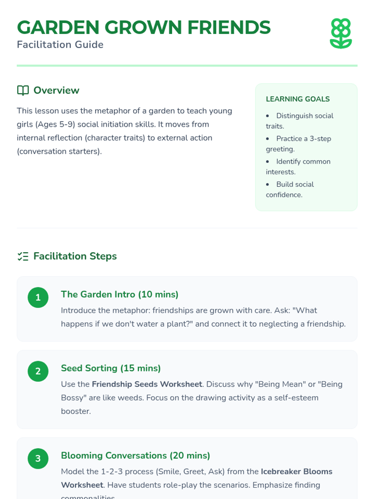 A foundational lesson for young girls focused on the social skills needed to initiate and maintain new friendships through the metaphor of growing a garden.