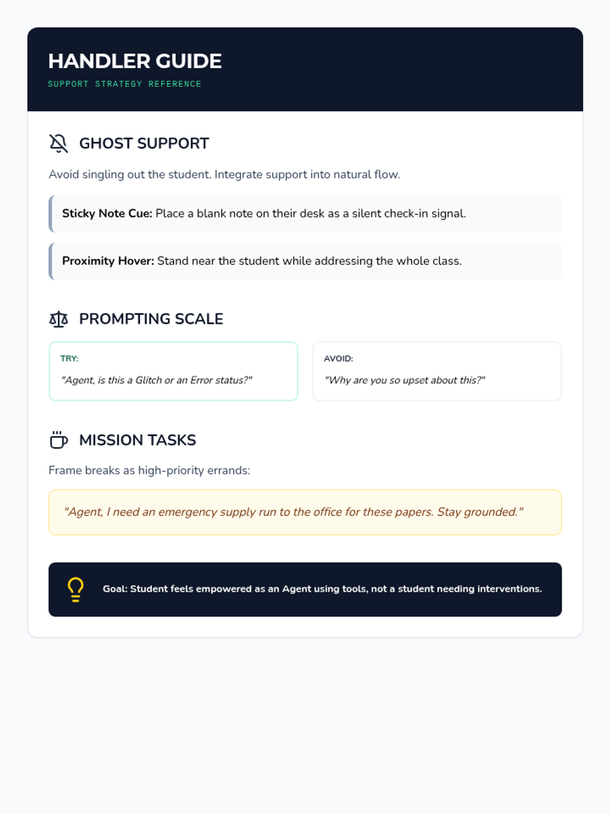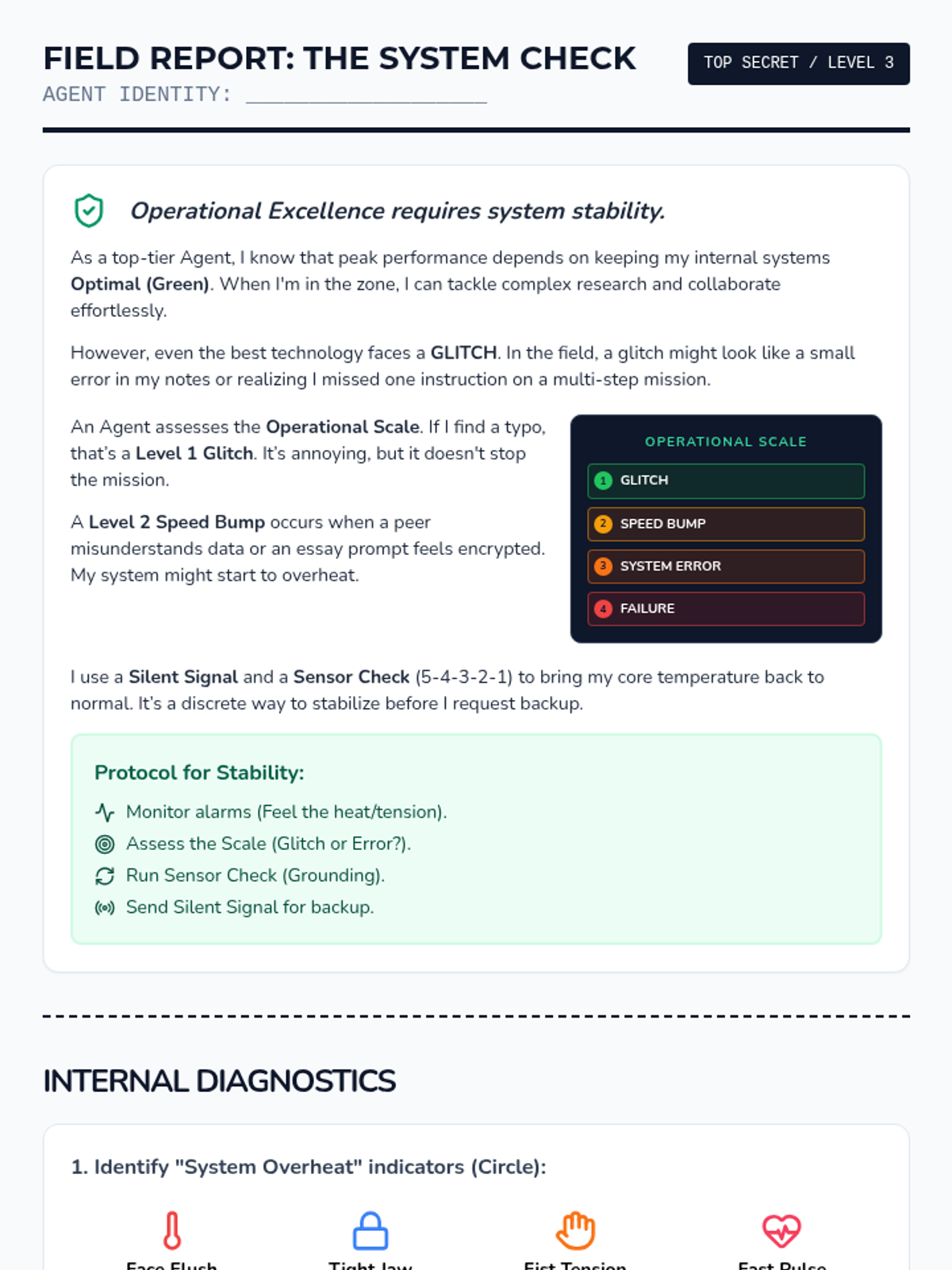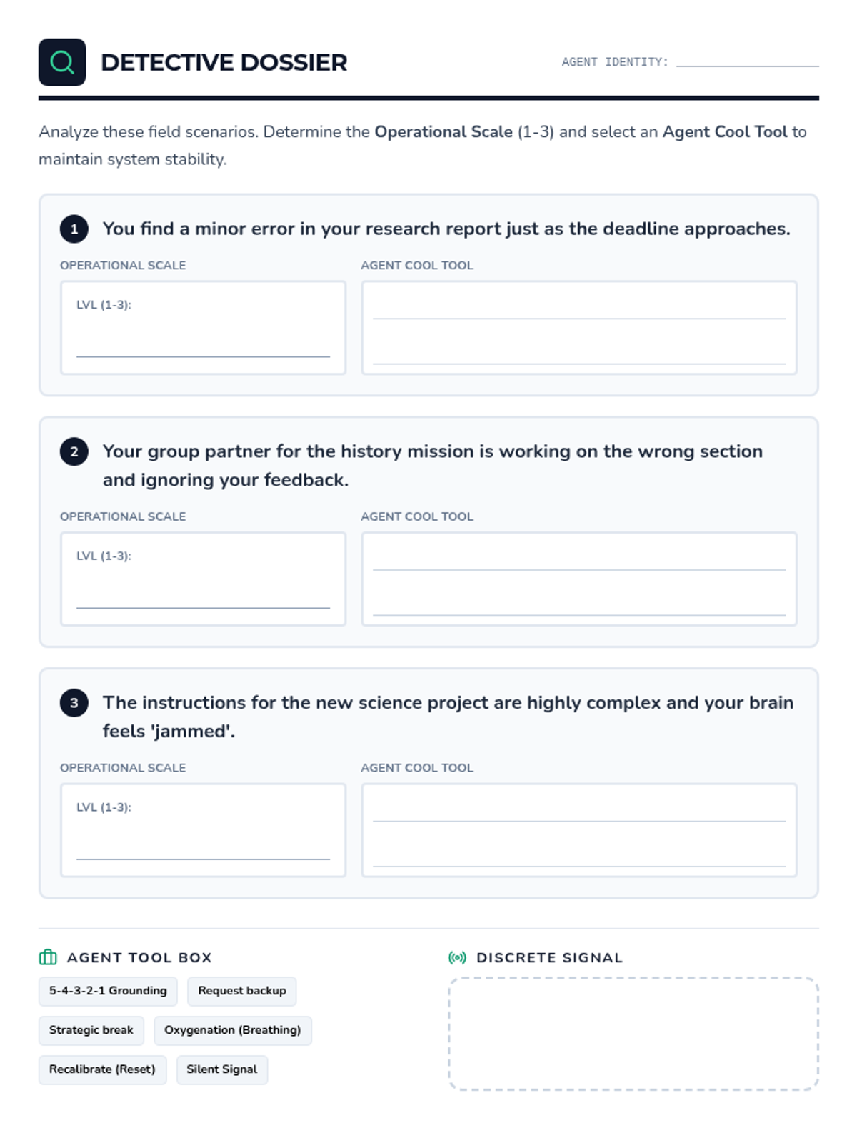 A social-emotional learning lesson focused on identifying the 'Size of the Problem' and utilizing grounding exercises, framed through an empowering 'Secret Agent' theme to support students with low frustration tolerance.