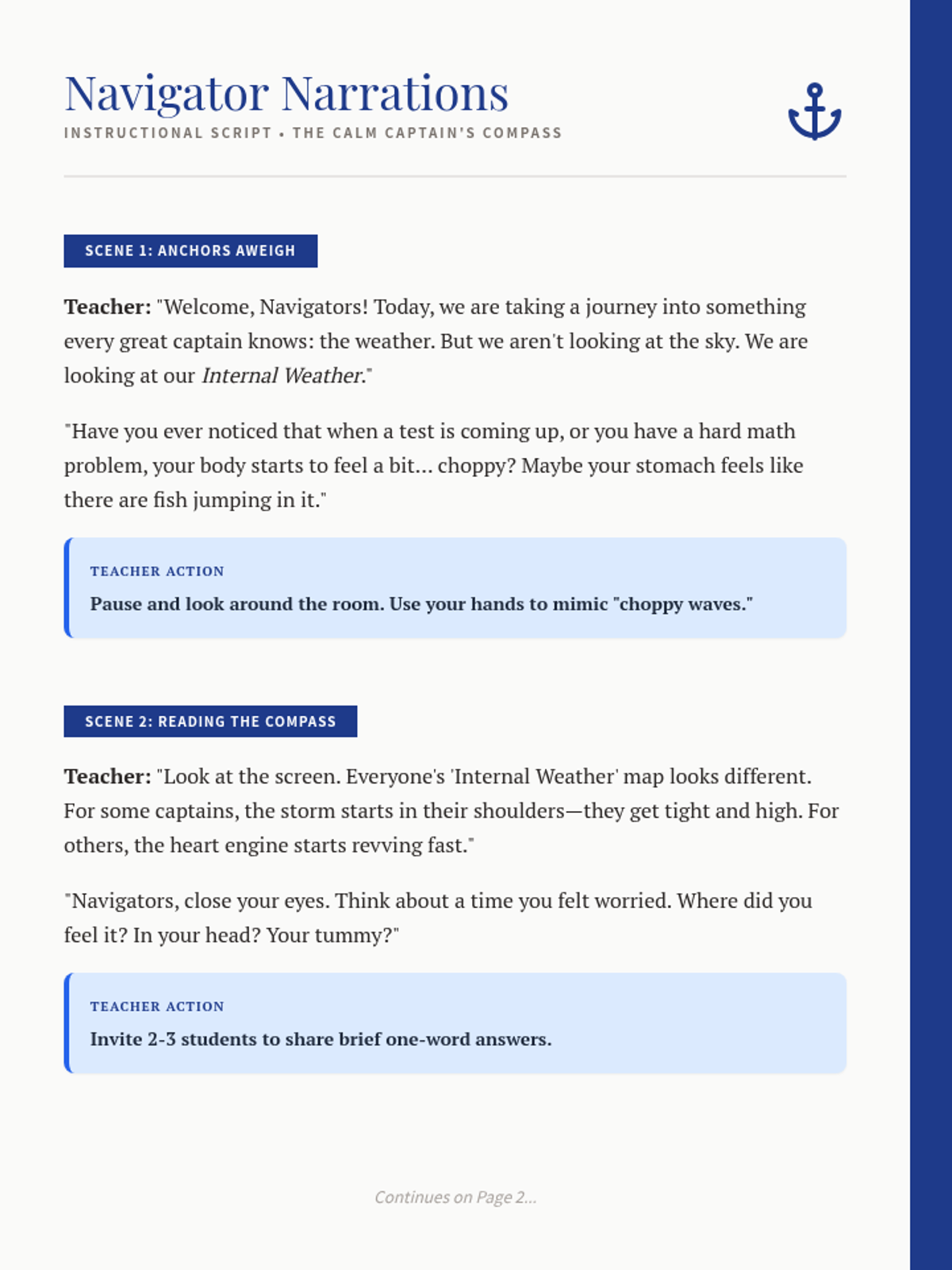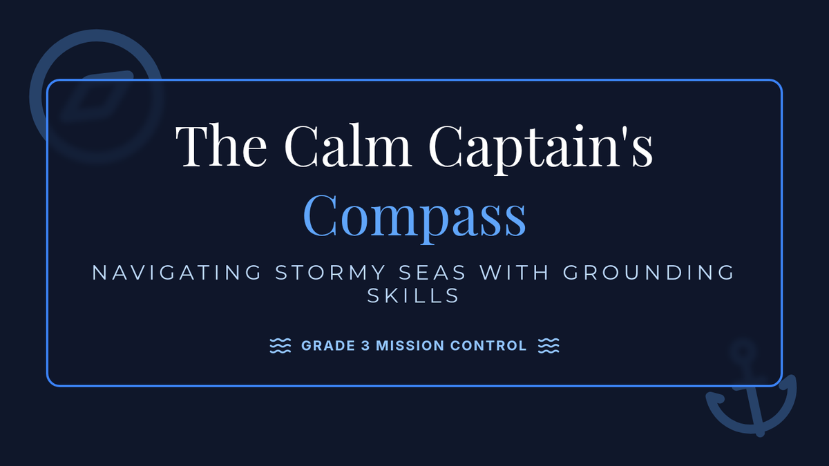 A social-emotional learning lesson for third graders focused on identifying physical stress signals and practicing grounding techniques to navigate academic challenges with a nautical explorer theme.
