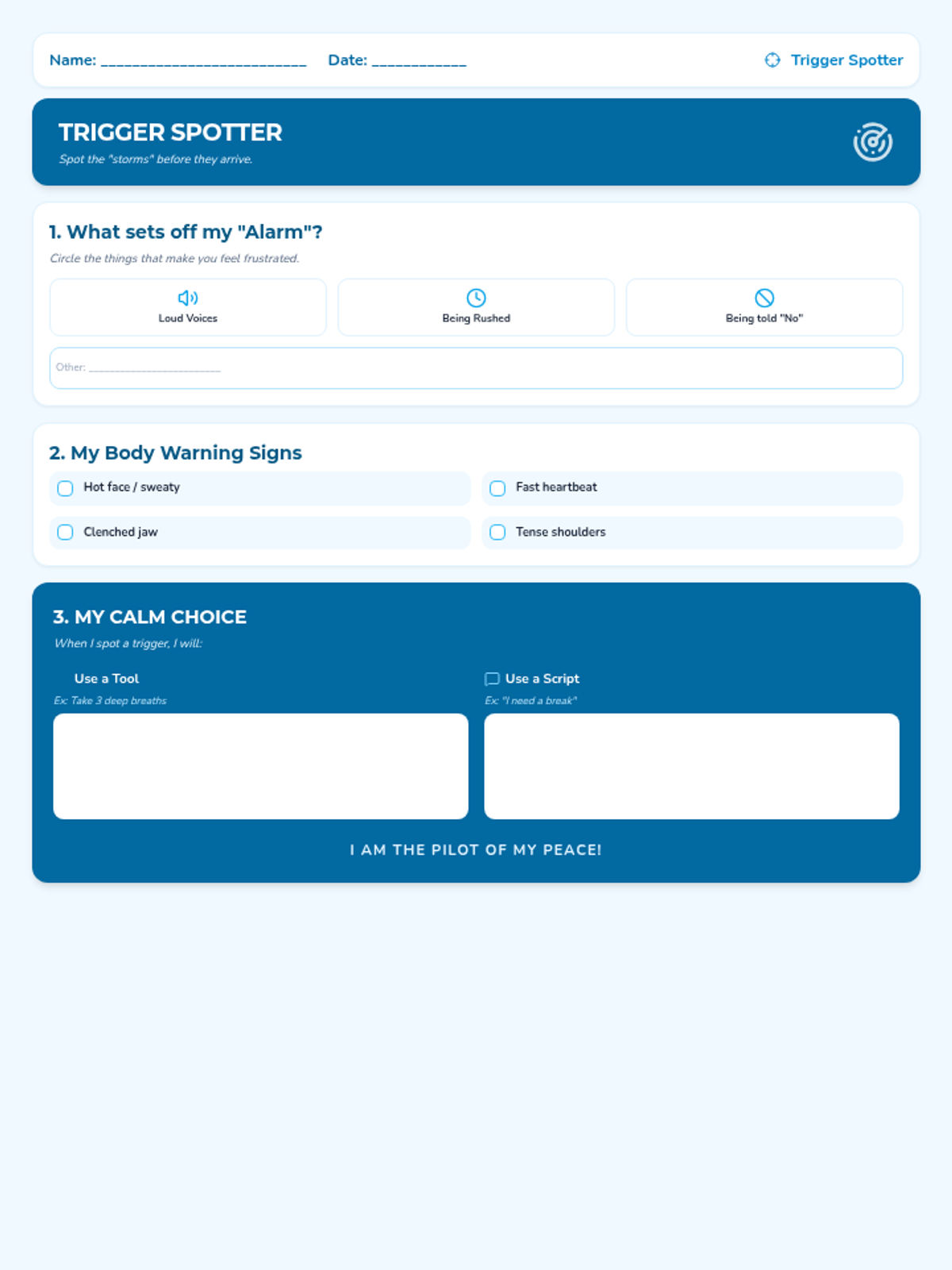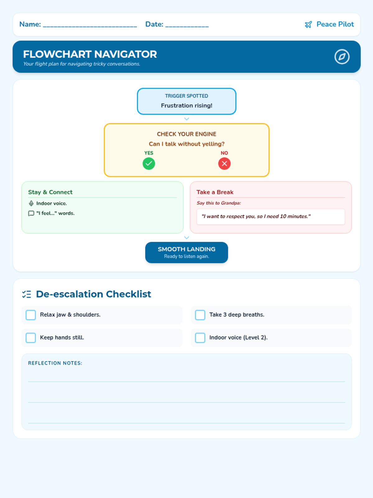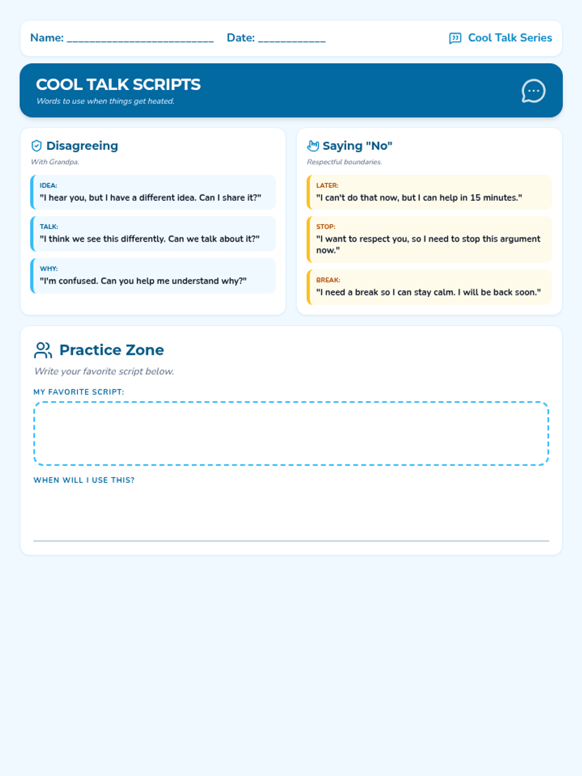 A collection of visual tools and communication strategies designed to help students navigate family conflict, manage emotional triggers, and use de-escalation techniques while maintaining respectful boundaries.