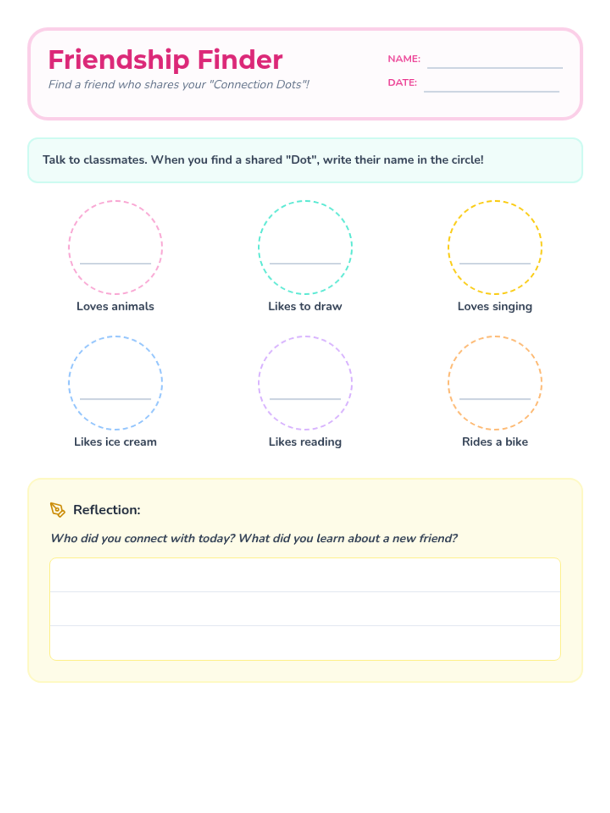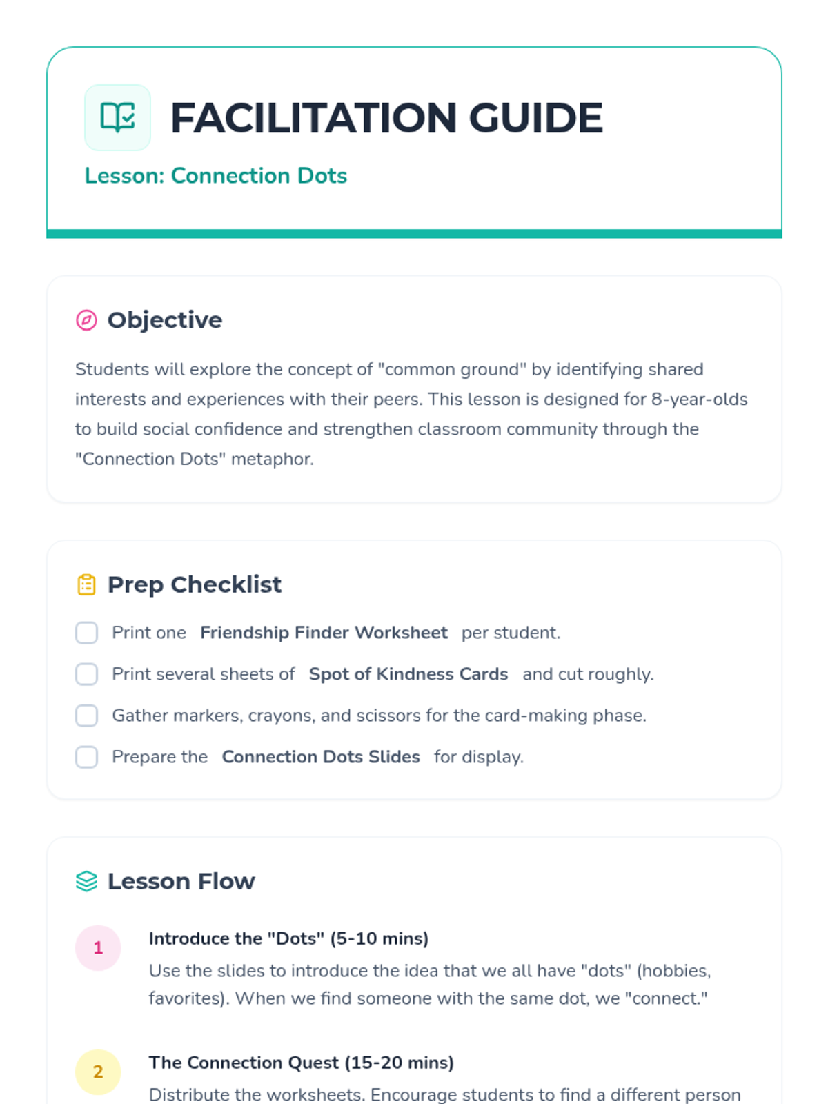 This lesson helps students identify common interests and shared experiences as 'connection dots' to help build stronger friendships through interactive games and reflection.