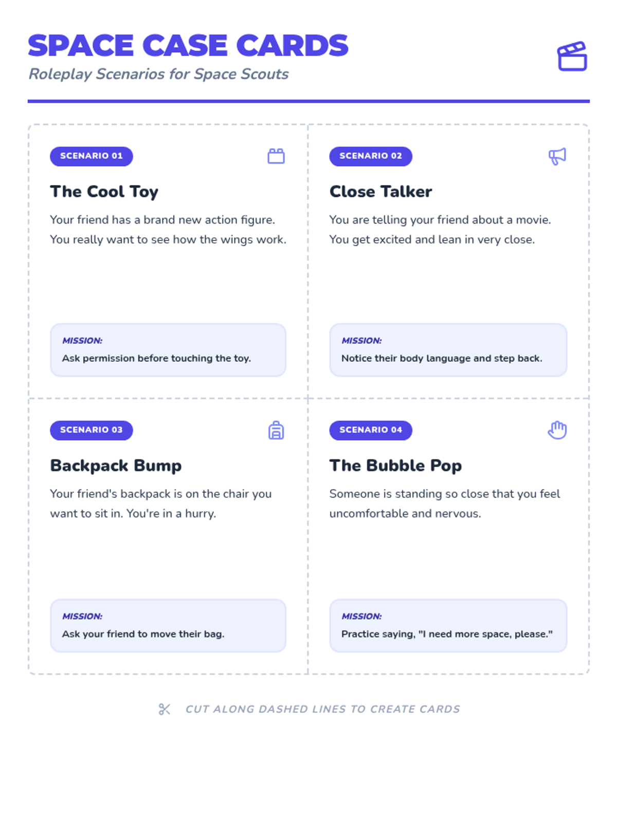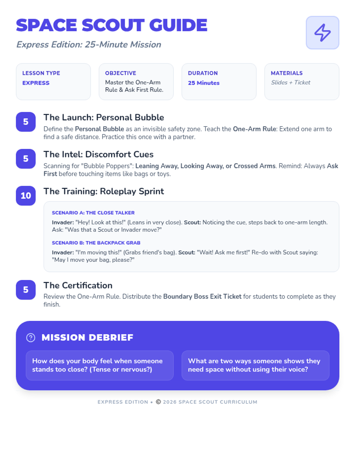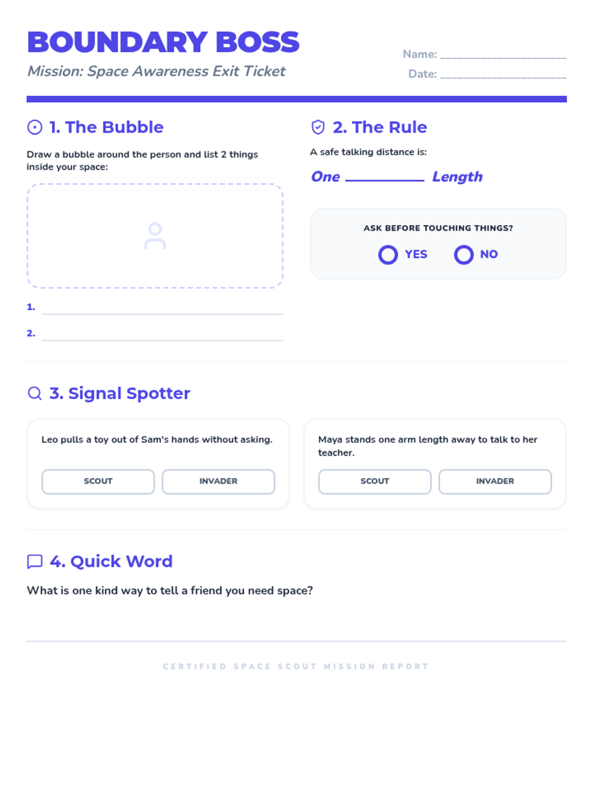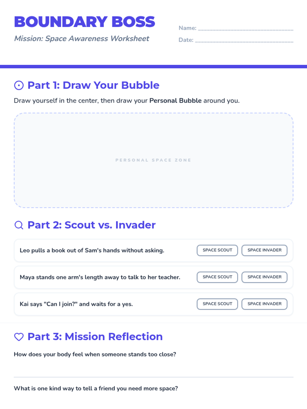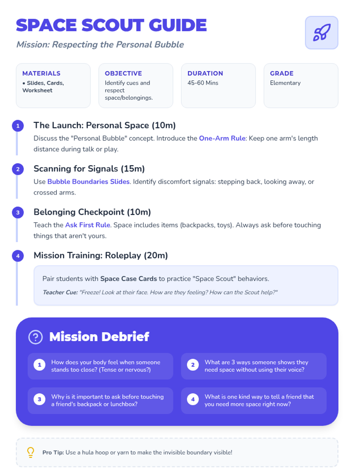 A social-emotional learning lesson focused on personal space, social cues, and respecting the belongings of others. Students learn to identify their 'personal bubble' and use body language to navigate social interactions respectfully.