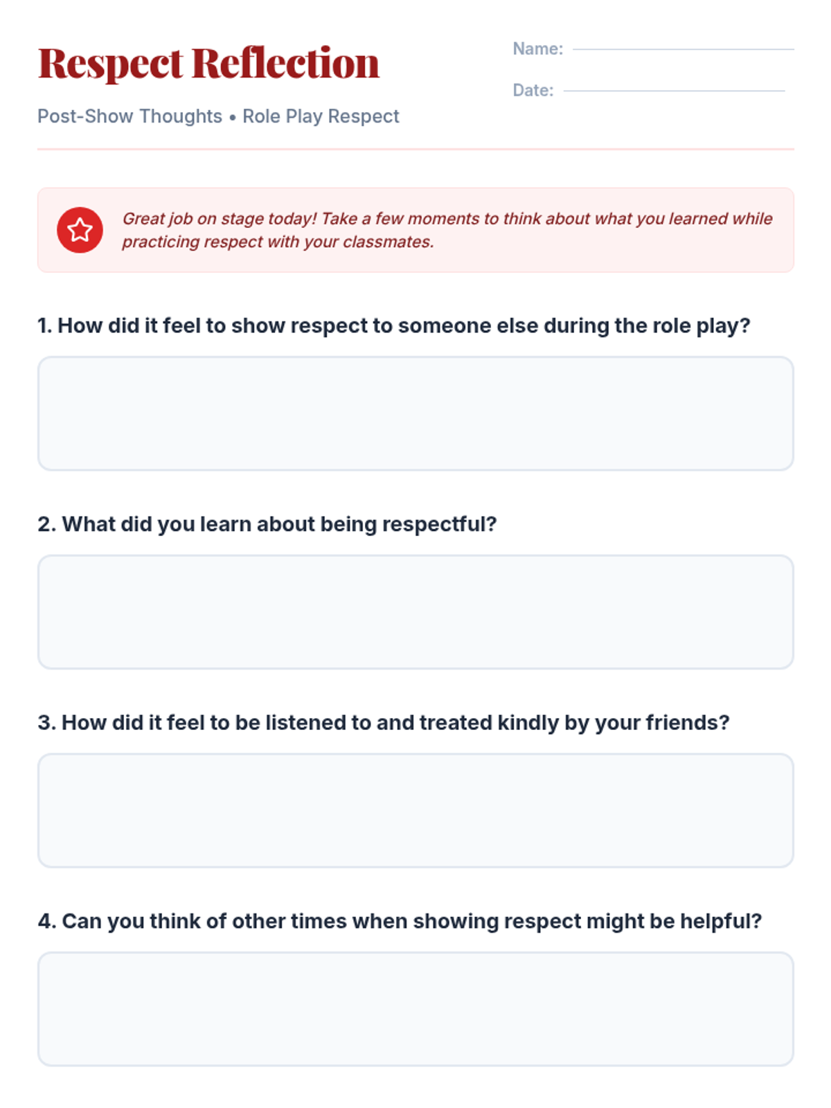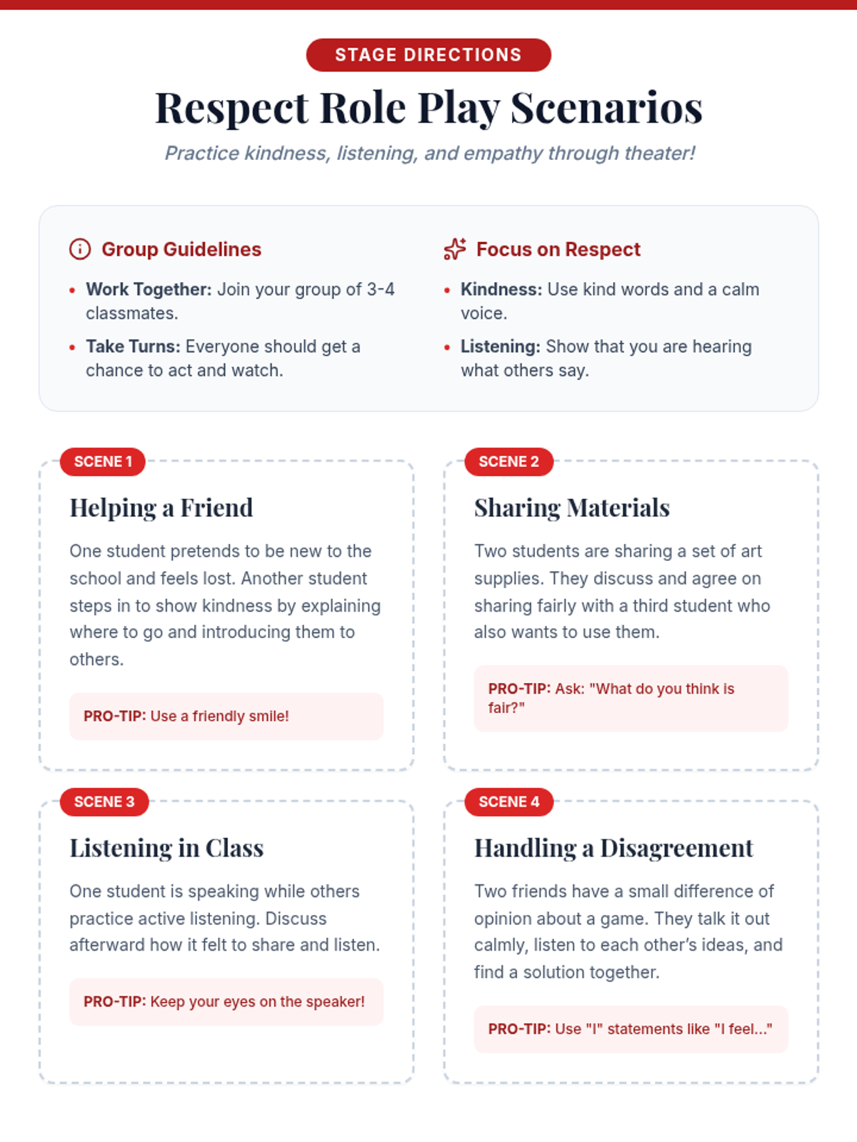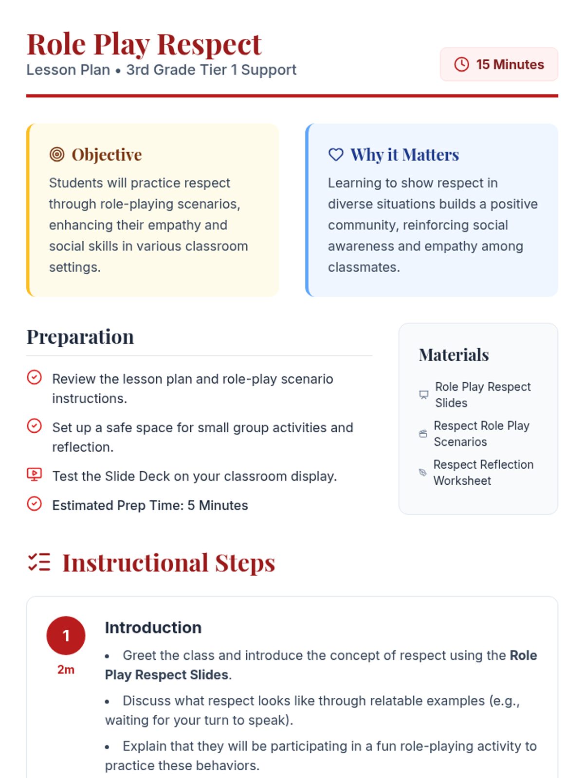 A 15-minute Tier 1 social-emotional learning lesson for 3rd graders where students practice respect through role-playing scenarios to build empathy and community.
