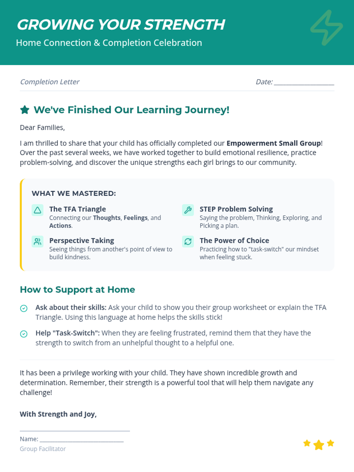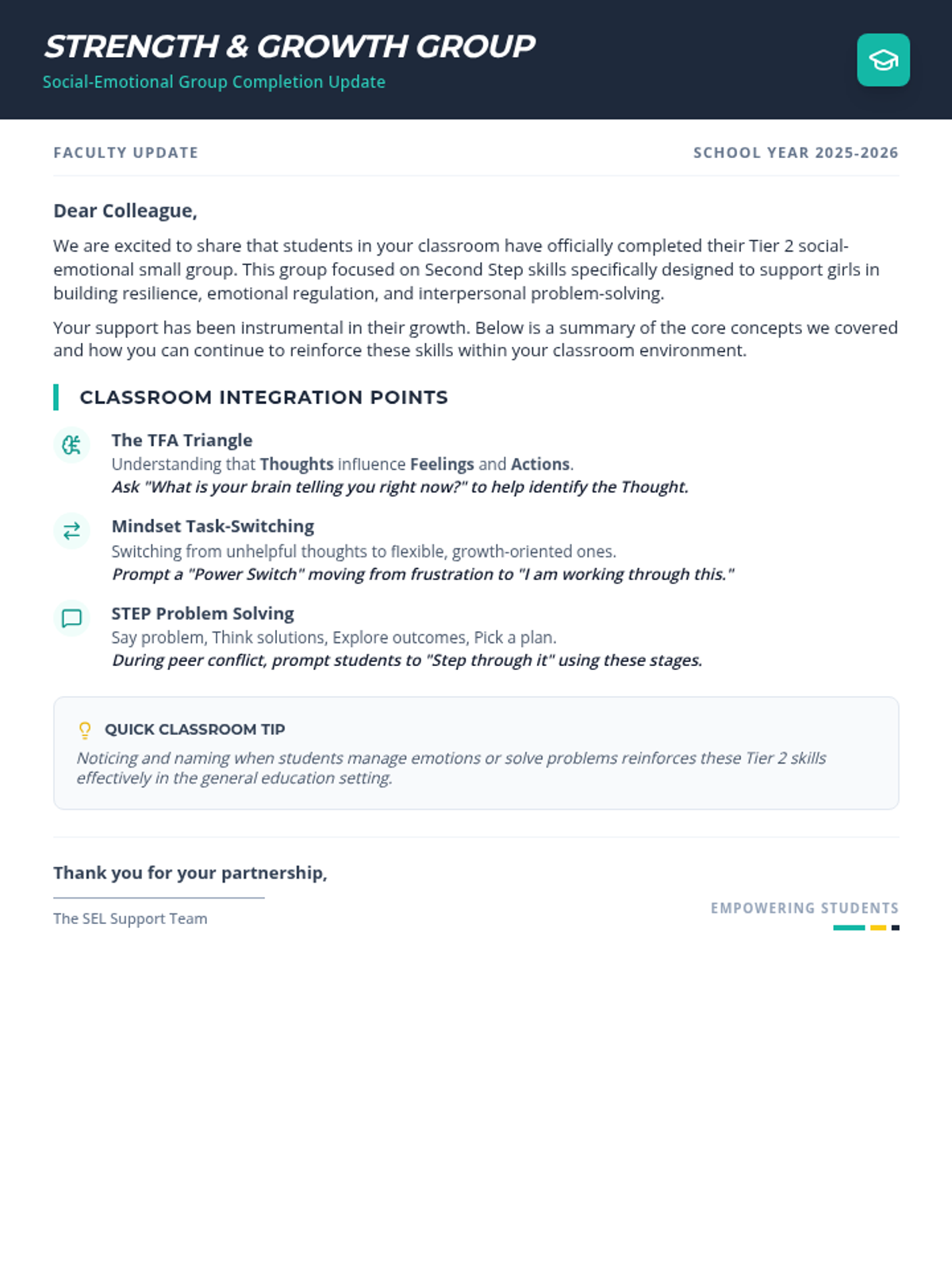 A comprehensive wrap-up session for Second Step Tier 2 small groups for girls, featuring the 'Spark Your Strength' theme. Reviews the TFA triangle, perspective-taking, problem-solving, and resilience.