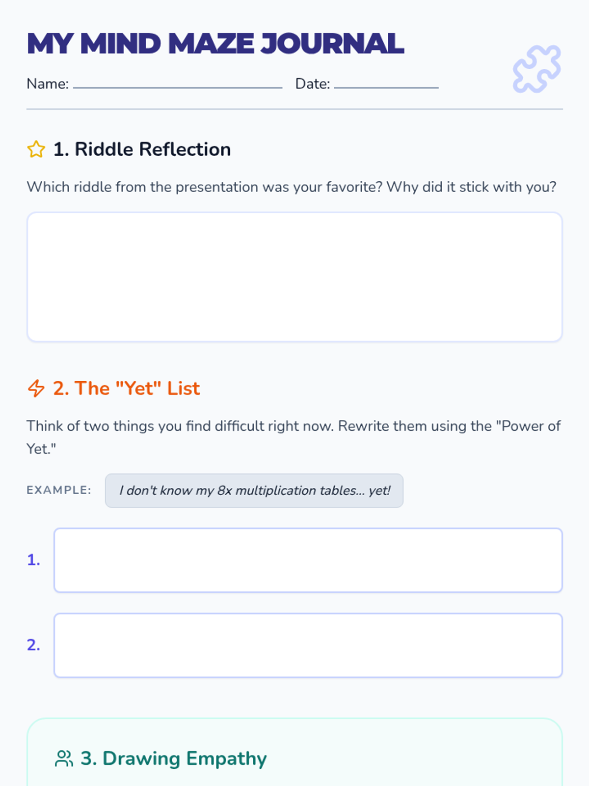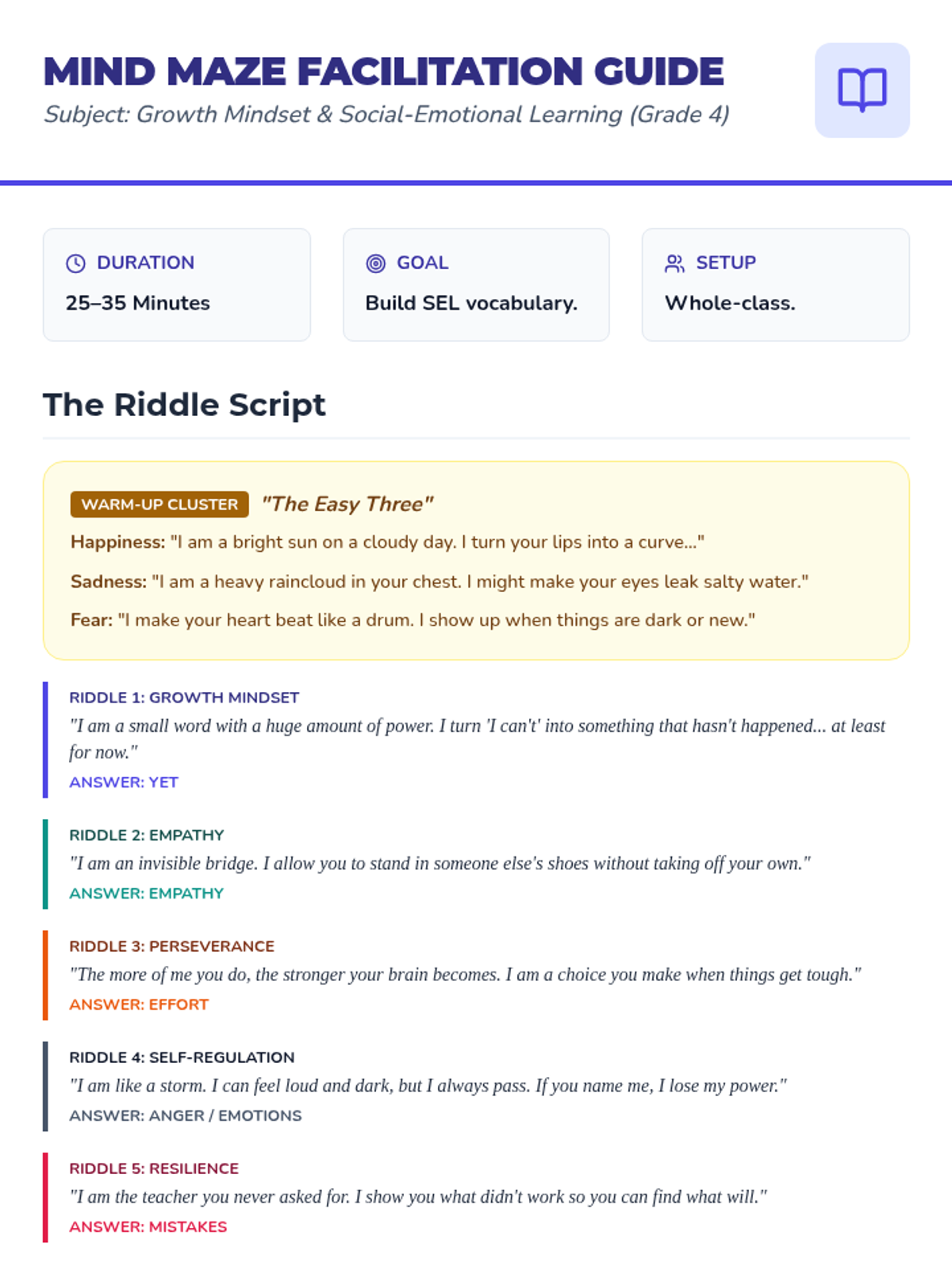 A riddle-based interactive session focusing on developing a growth mindset, perseverance, and emotional intelligence through critical thinking and empathy puzzles.