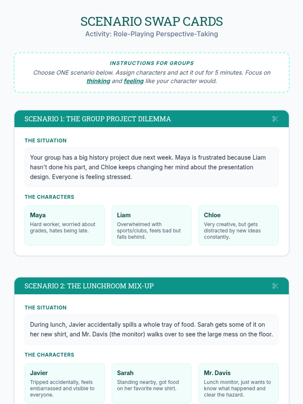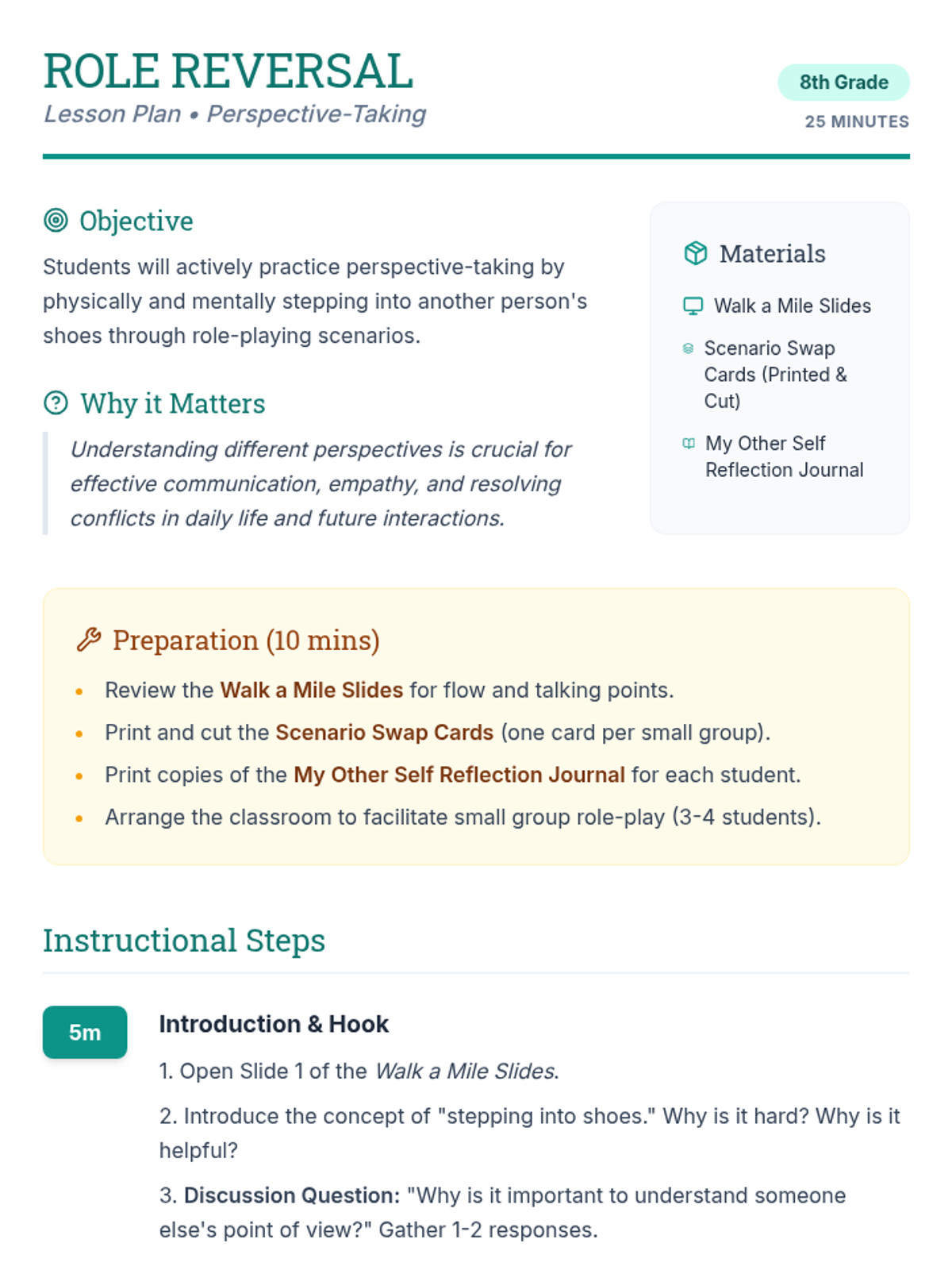 A 25-minute lesson for 8th graders to practice active listening and perspective-taking through role-play and reflective journaling.
