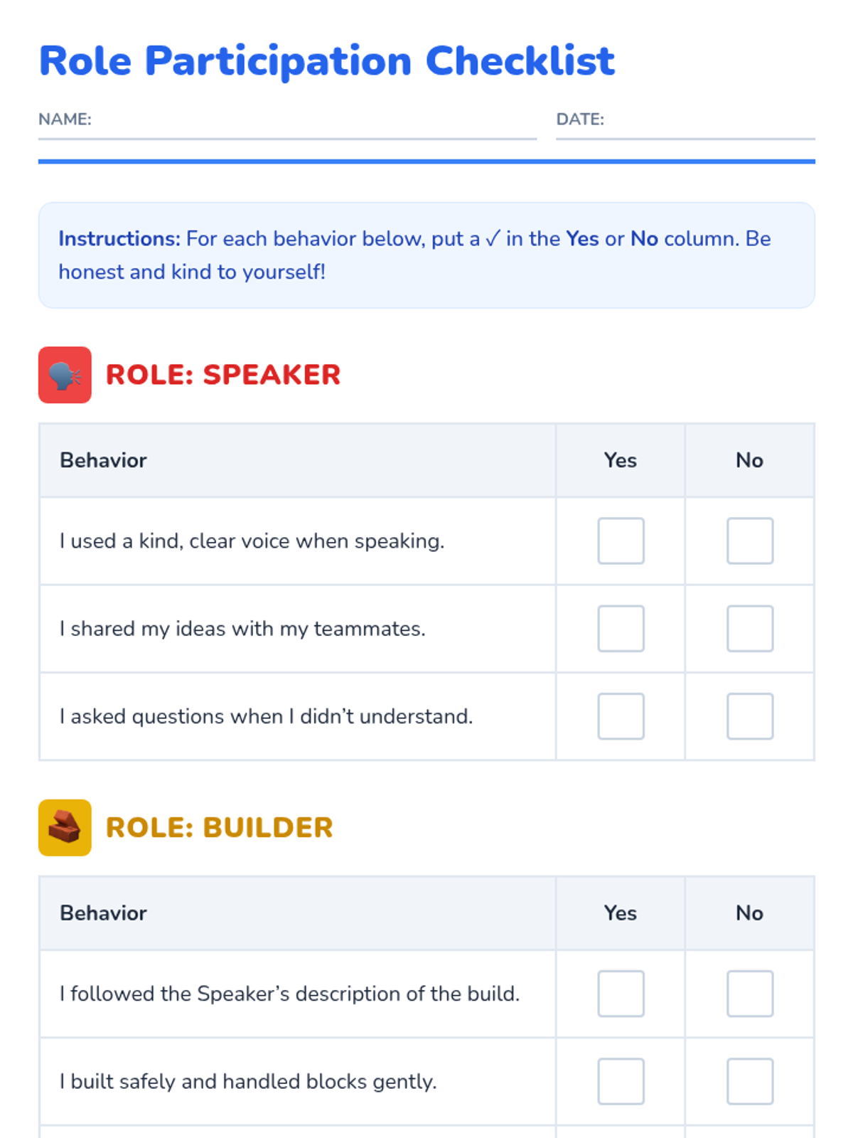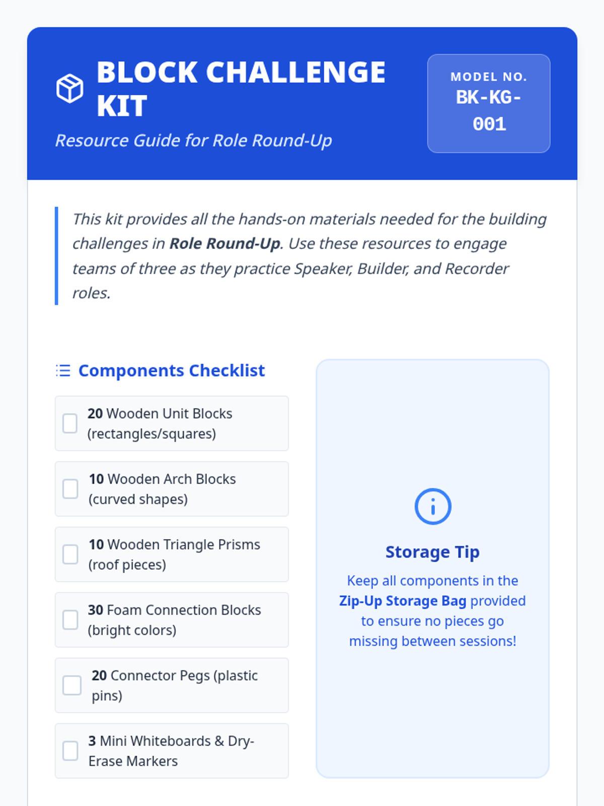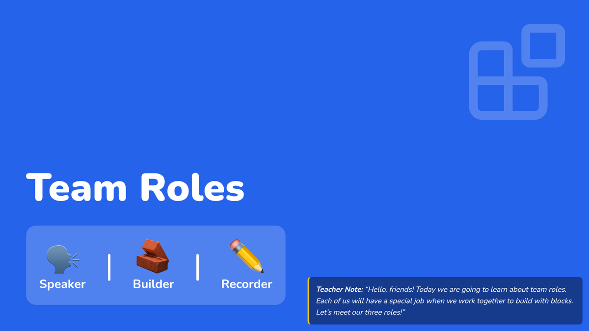 اس عملی سبق میں کنڈرگارٹن کے بچے اسپیکر، بلڈر، اور ریکارڈر کے کرداروں کو بلاک چیلنج کے ذریعے دریافت اور عملی طور پر سیکھیں گے، تعاون اور خود انتظام کی مہارتیں مضبوط ہوتی ہیں۔