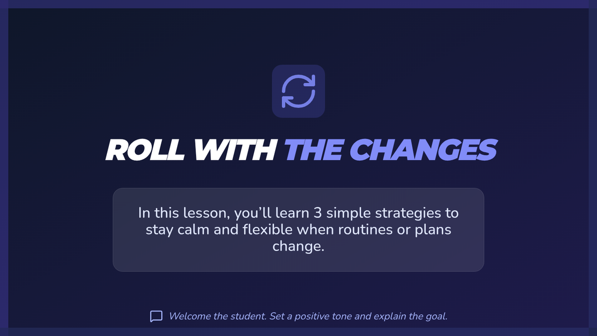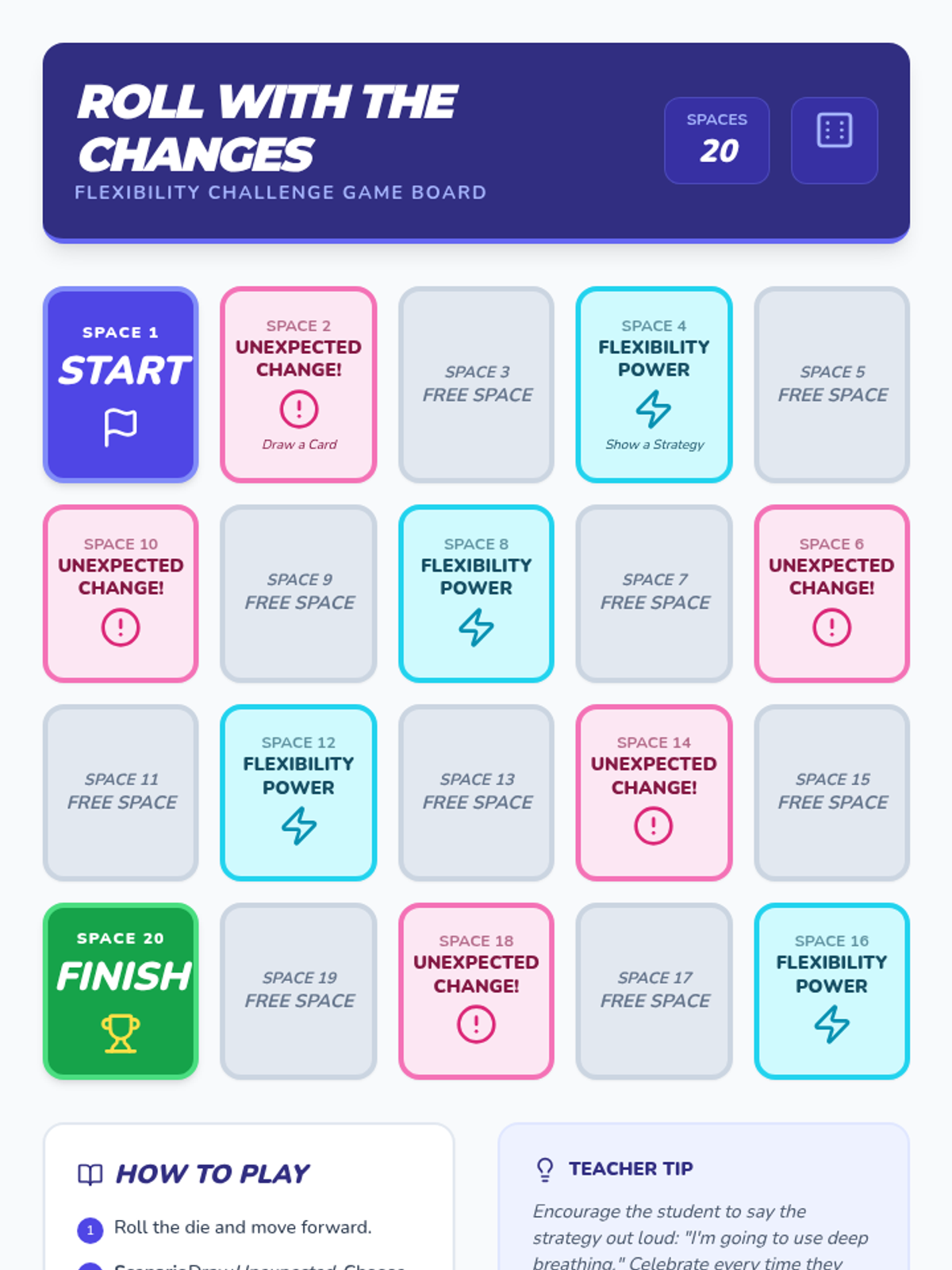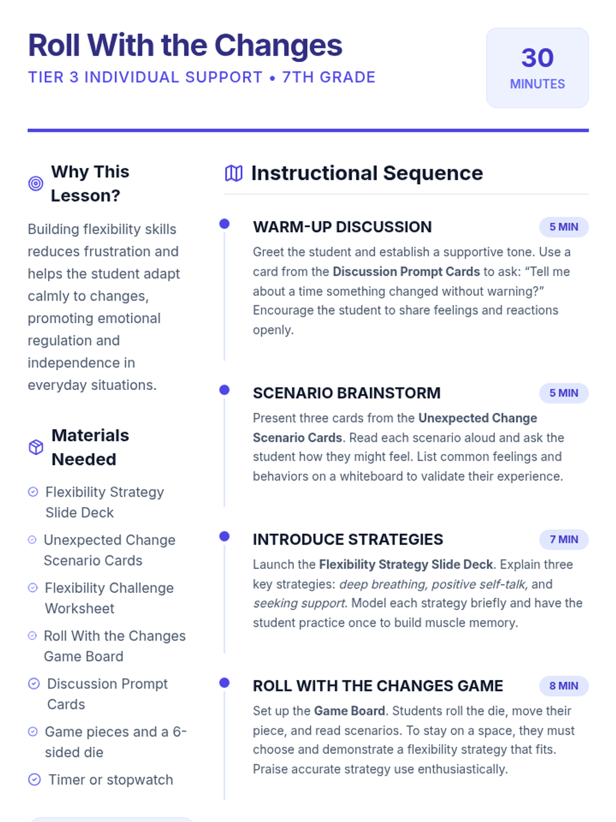 A 30-minute individual lesson for 7th-grade students with autism to develop flexibility skills. Students learn strategies like deep breathing and positive self-talk to manage unexpected changes through discussion, interactive slides, and a board game.