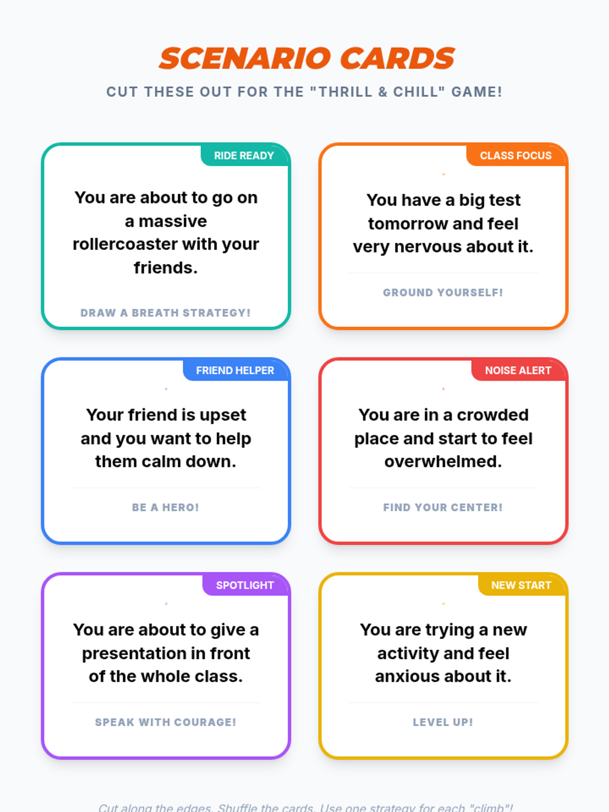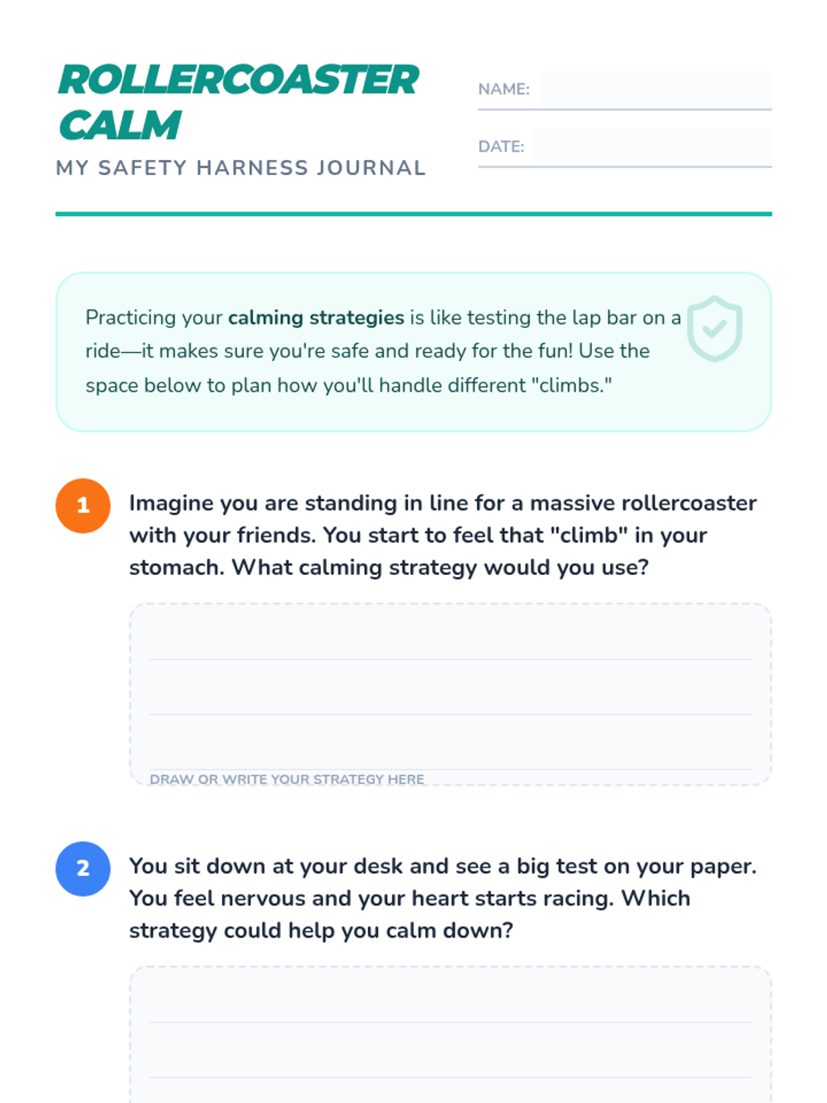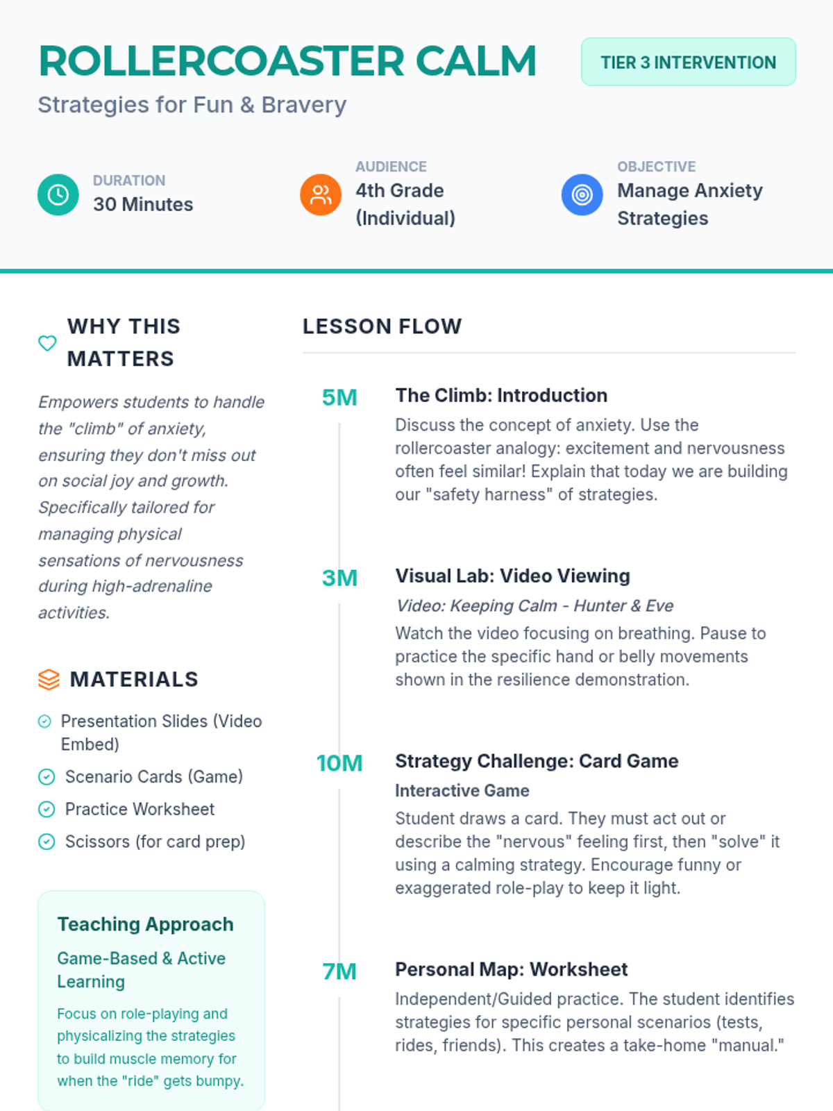 A Tier 3 social-emotional learning lesson for fourth graders to master calming strategies for anxiety, themed around the thrills and chills of rollercoasters. Students will explore breathing techniques and grounding exercises to manage social anxiety and enjoy activities with friends.
