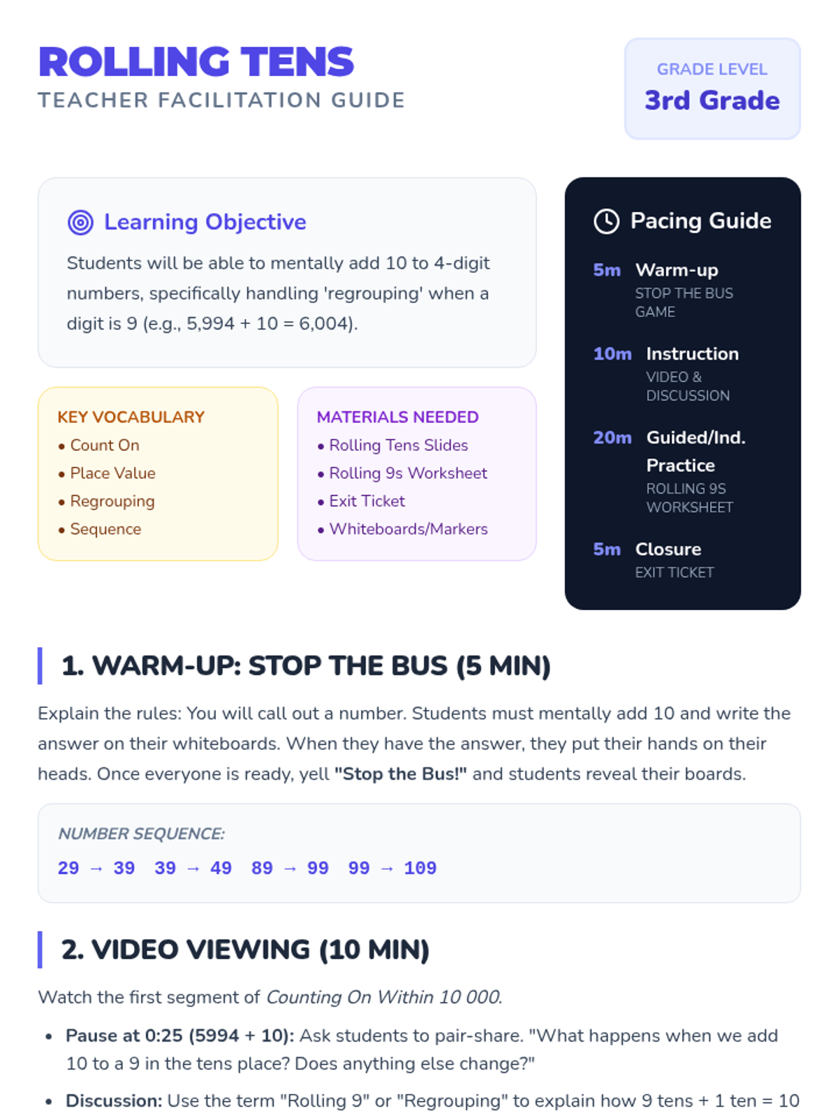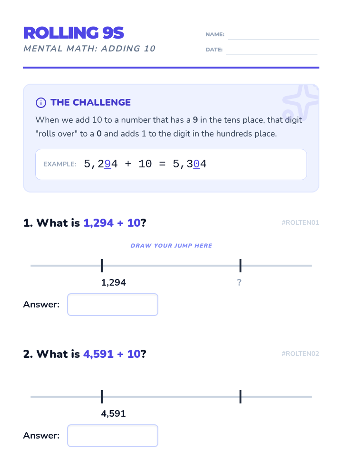 A 3rd-grade math lesson focusing on mentally adding 10 to 4-digit numbers, specifically mastering the 'regrouping' that occurs when the tens digit is 9. Students use number lines and pattern recognition to understand how a single jump of 10 can roll over into the hundreds and thousands places.