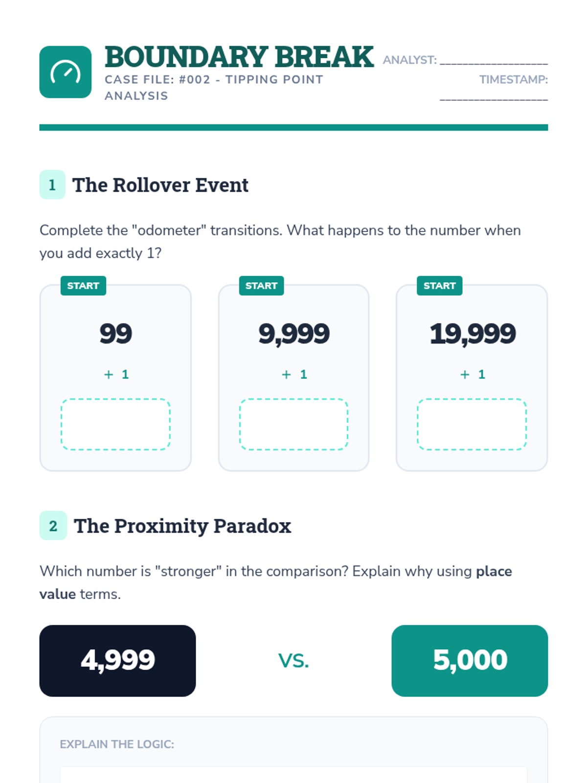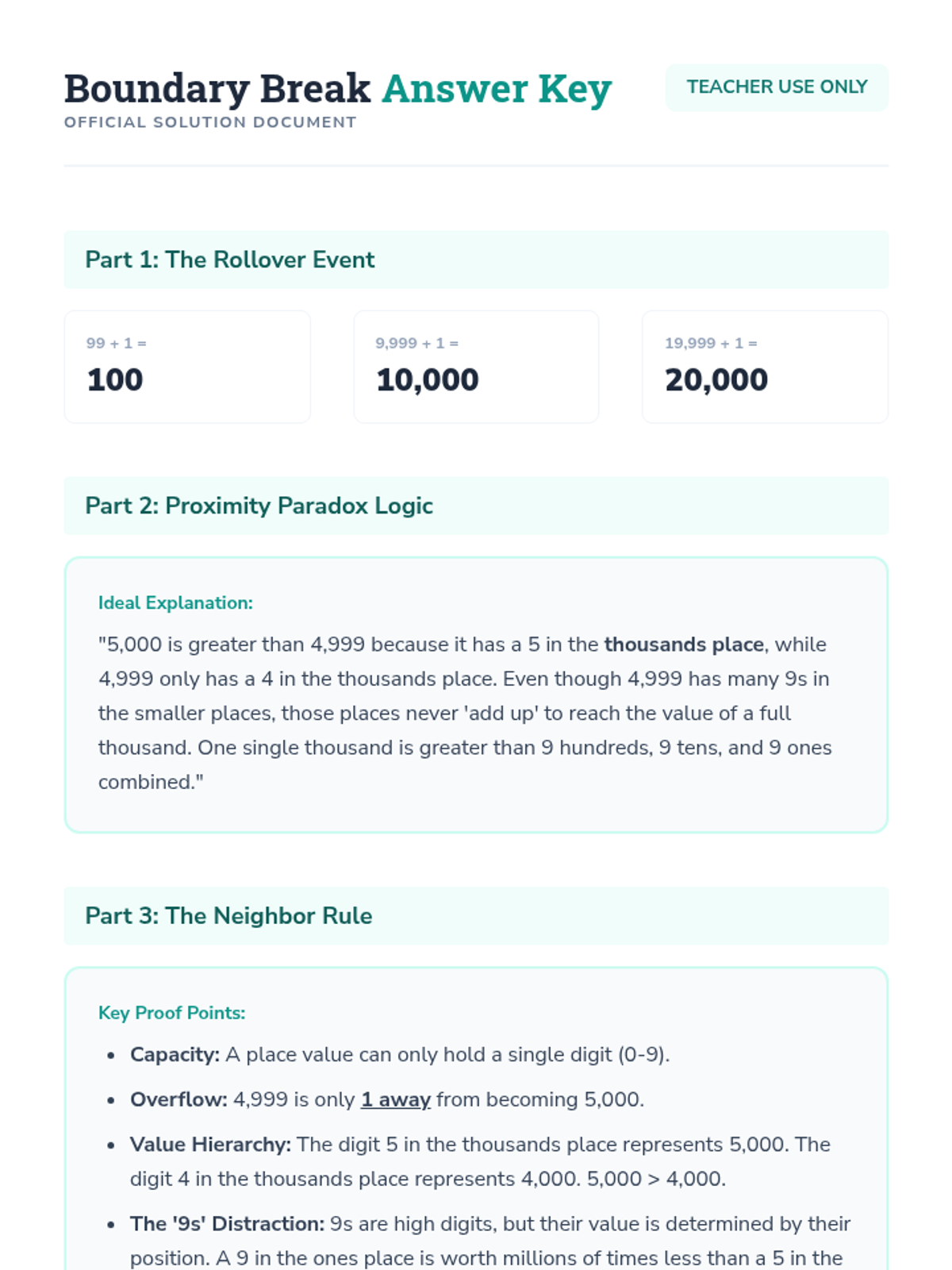 Students analyze the transition points in place value where a single digit change 'rolls over' the entire number, emphasizing the relationship between neighboring place values.