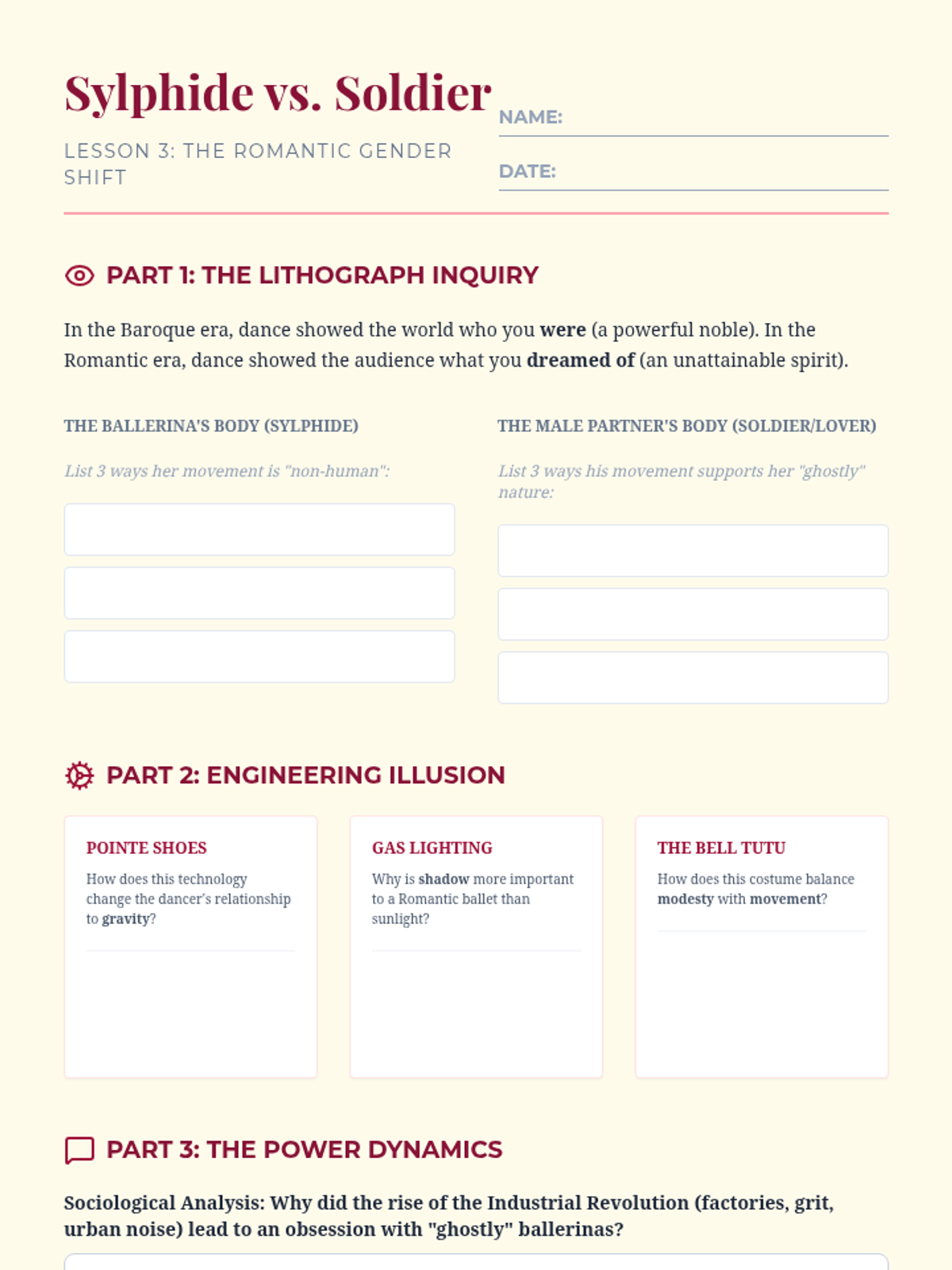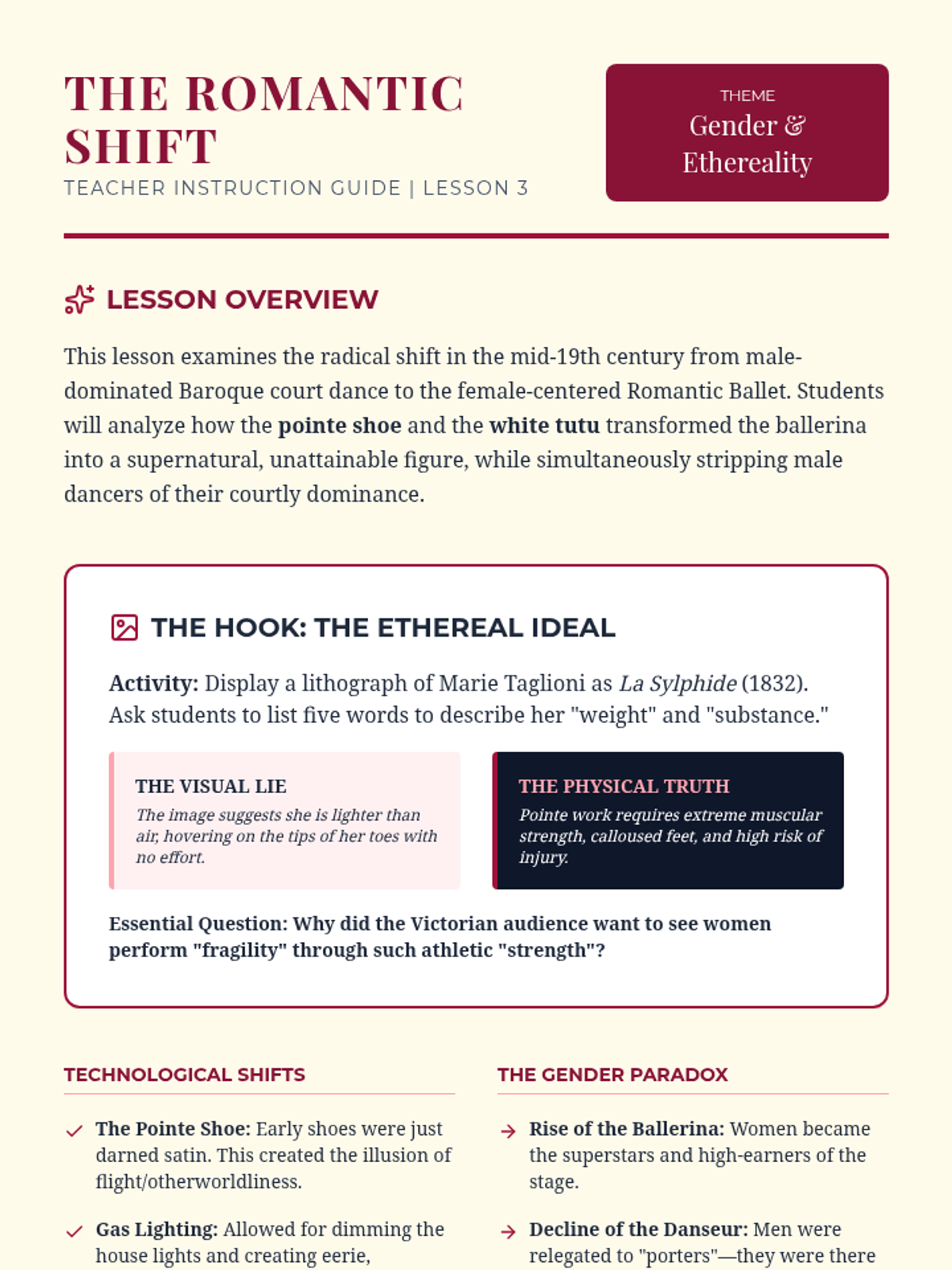 Analyze the shift from male-dominated Baroque dance to the female-centered Romantic era, exploring how technology (pointe shoes) and gender ideals reshaped dance hierarchy.