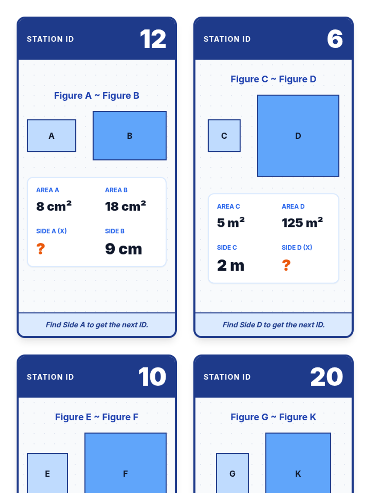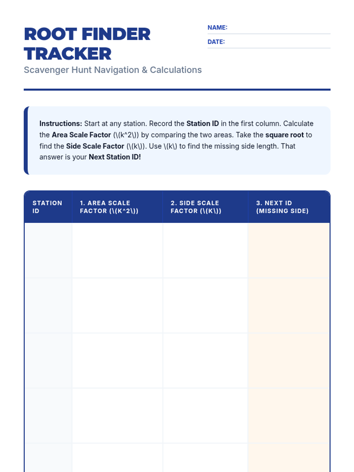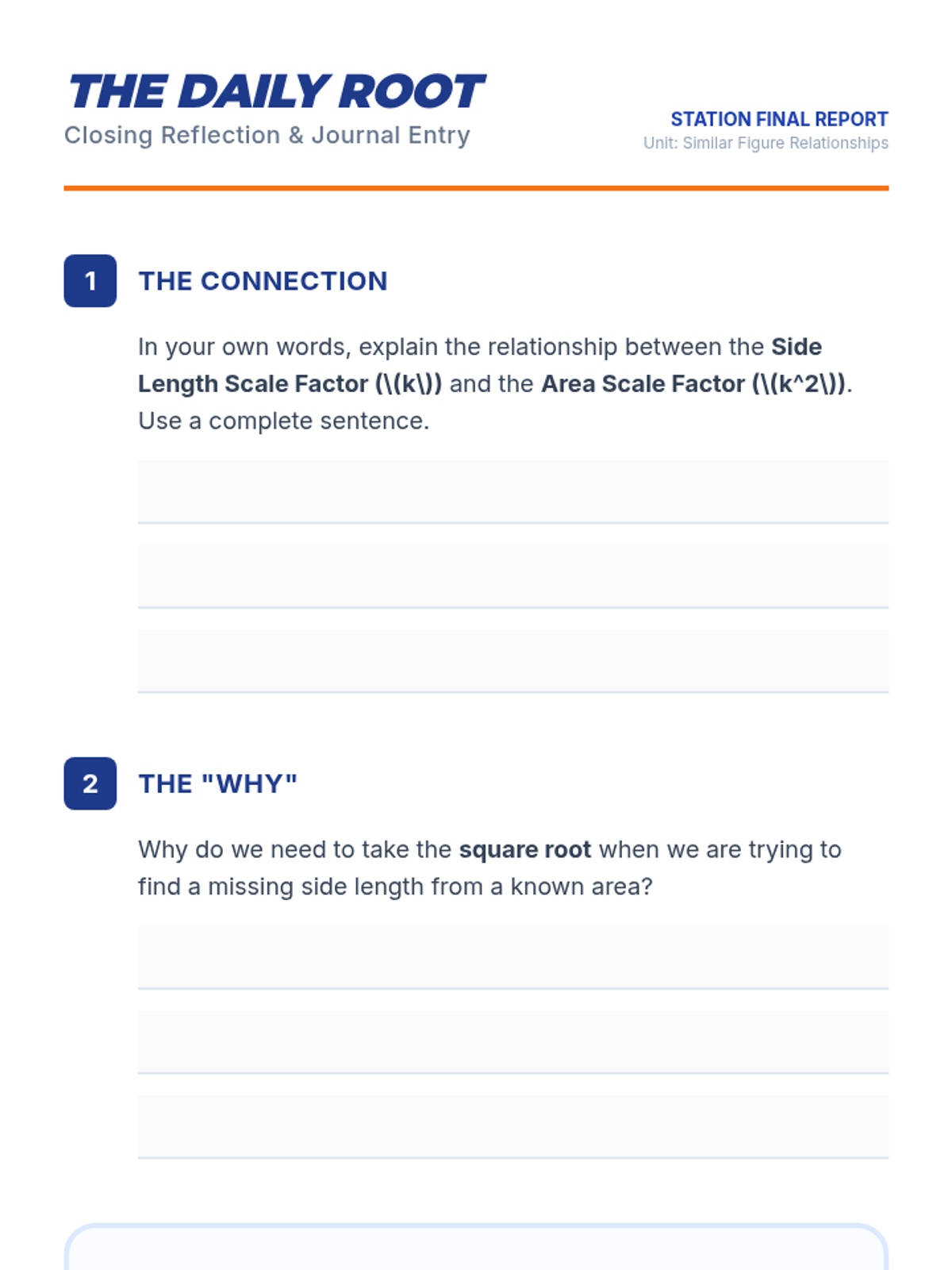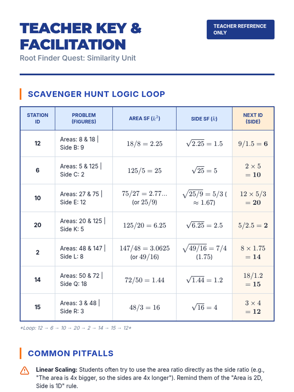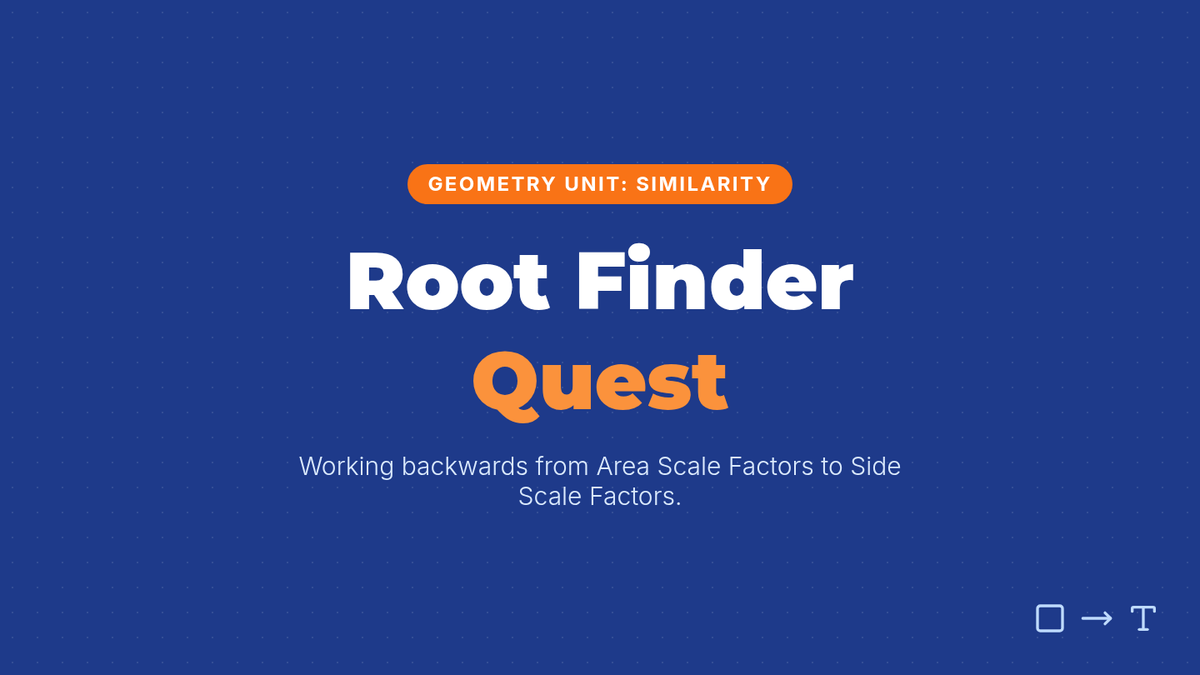 A lesson focused on working backwards from area ratios to side length ratios in similar figures using square roots. Includes a perfect squares warm-up, a video analysis of an area problem, and a hands-on scavenger hunt activity.