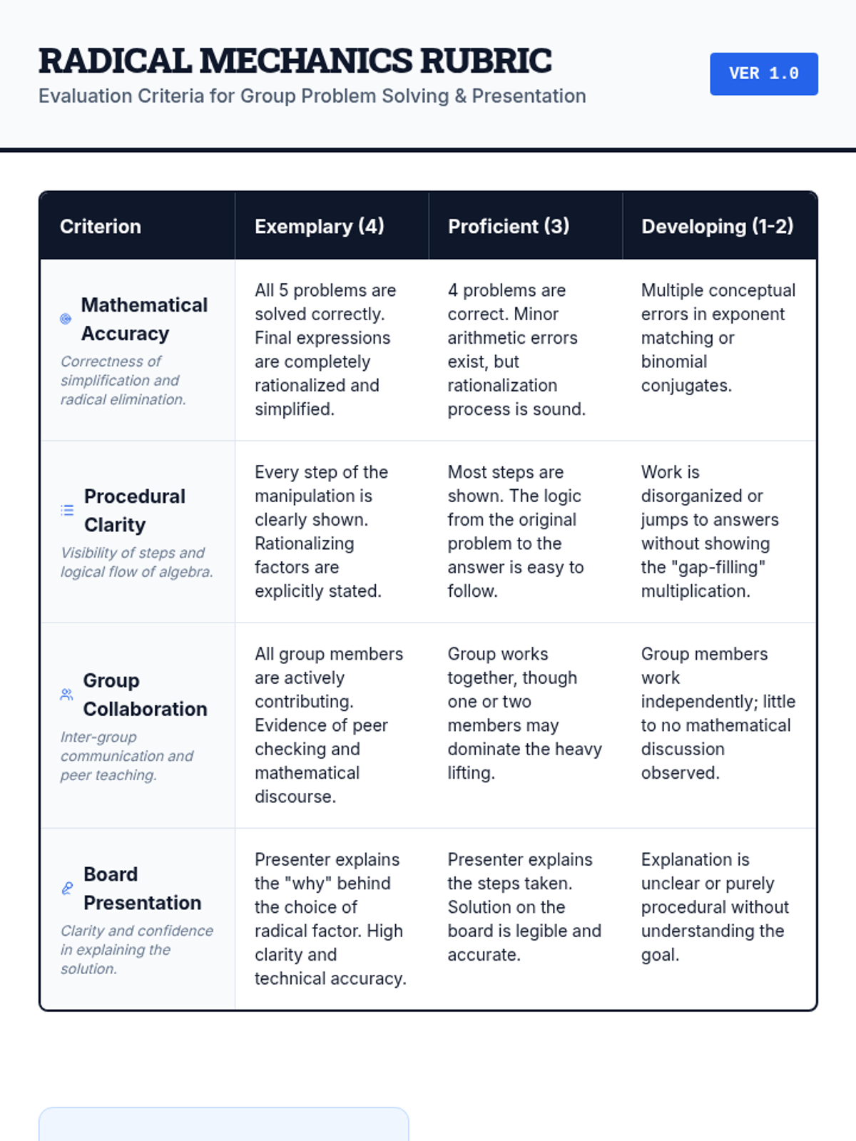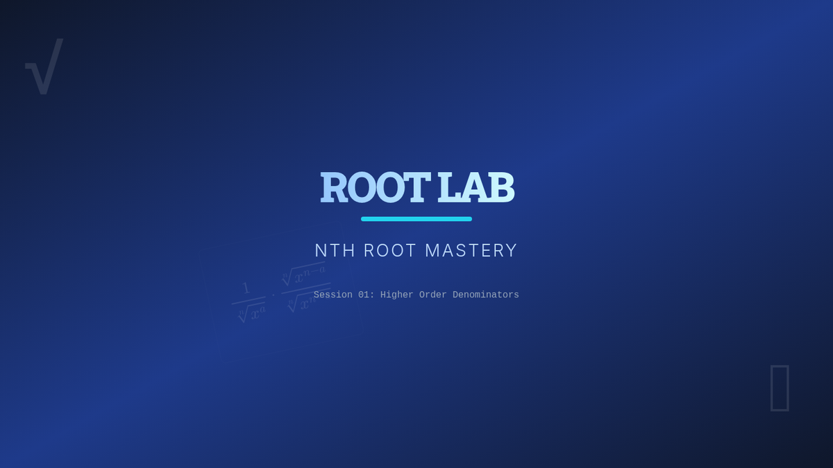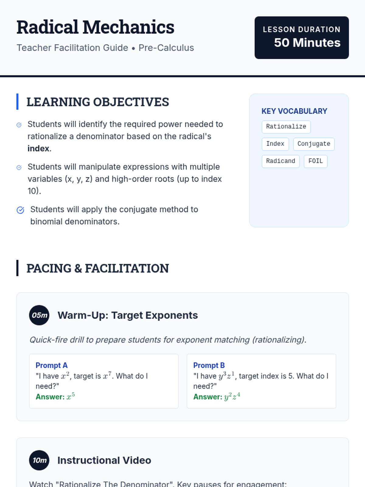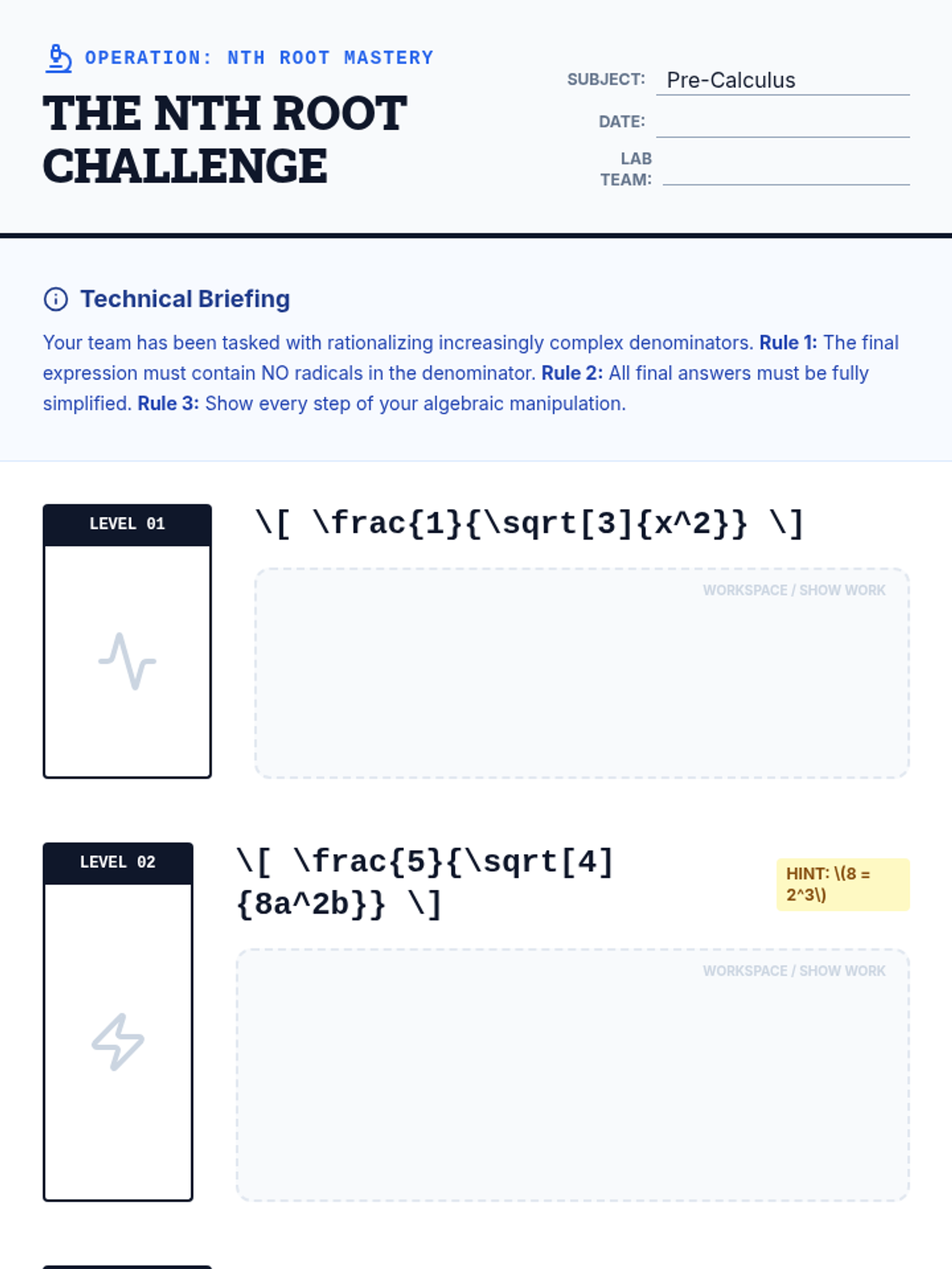 A high-school Pre-Calculus lesson focused on rationalizing denominators with higher-order roots and multiple variables, featuring a collaborative problem-solving challenge and a technical 'Root Lab' aesthetic.