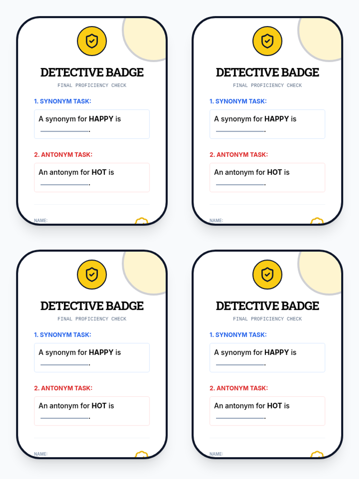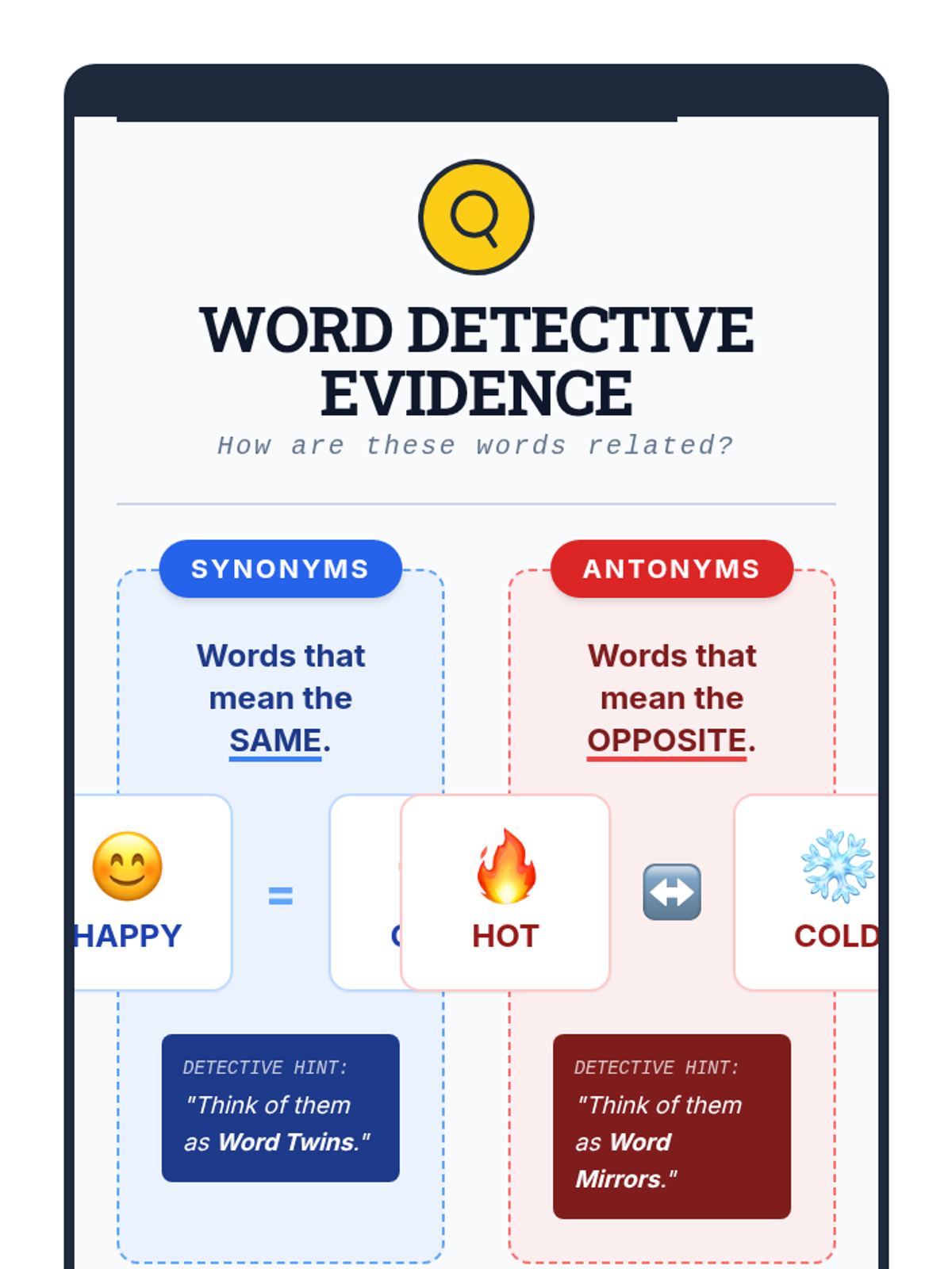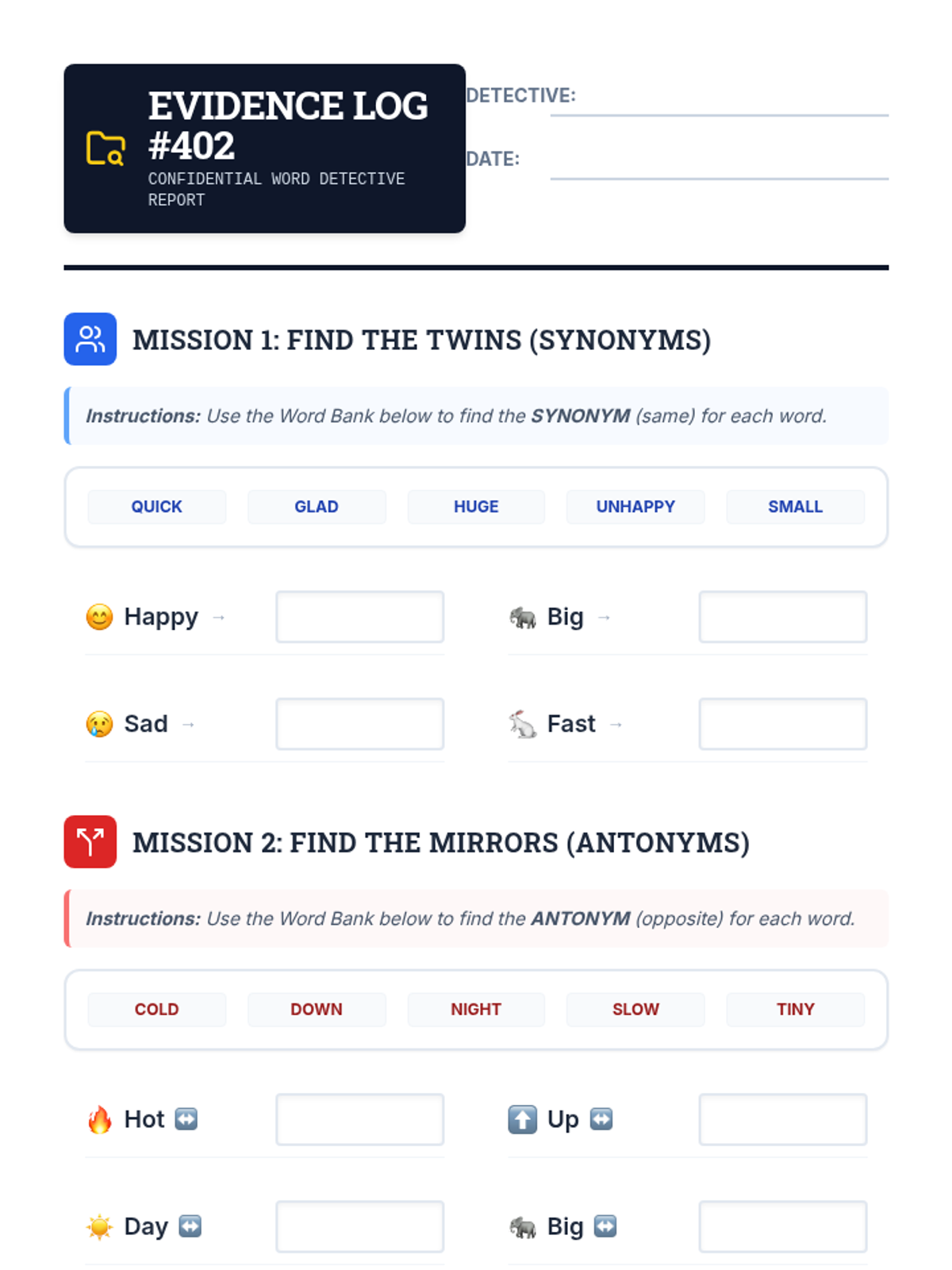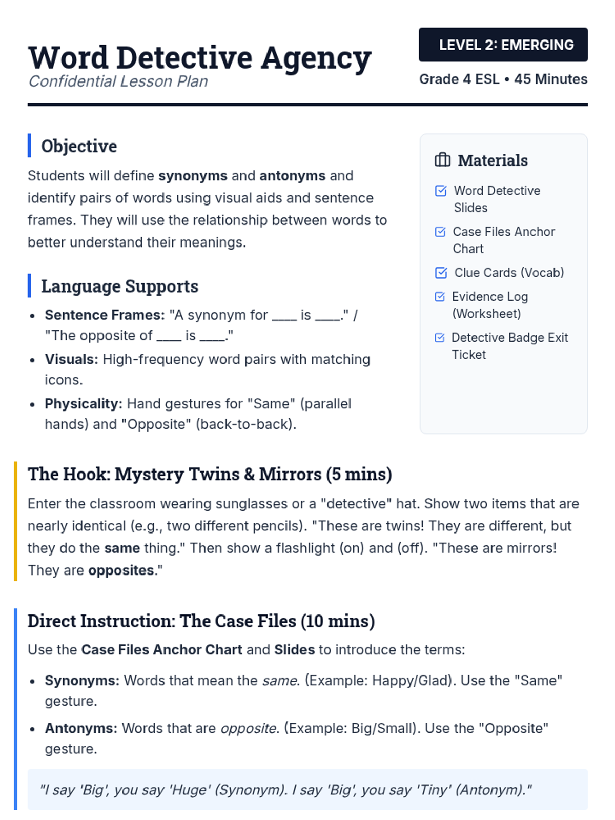 A 45-minute Grade 4 ESL lesson focused on identifying and using synonyms and antonyms. Designed for Level 2 (Emerging) learners, the lesson uses a 'Word Detective' theme with heavy visual support and sentence frames.