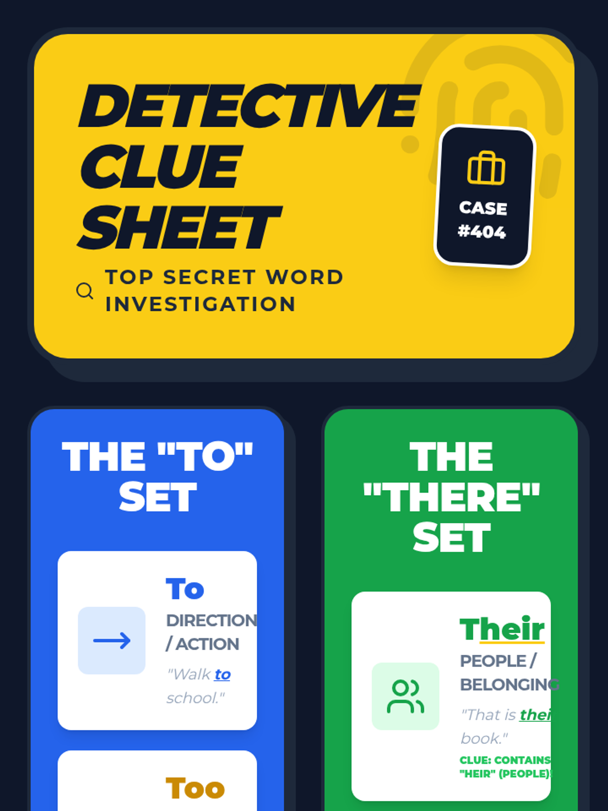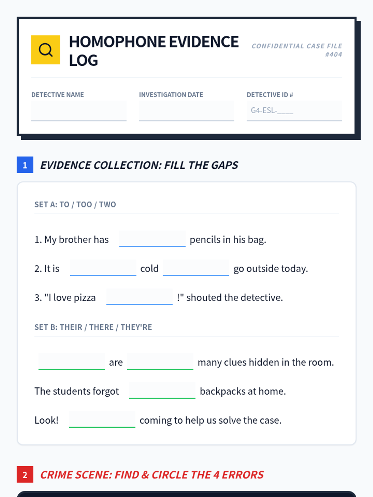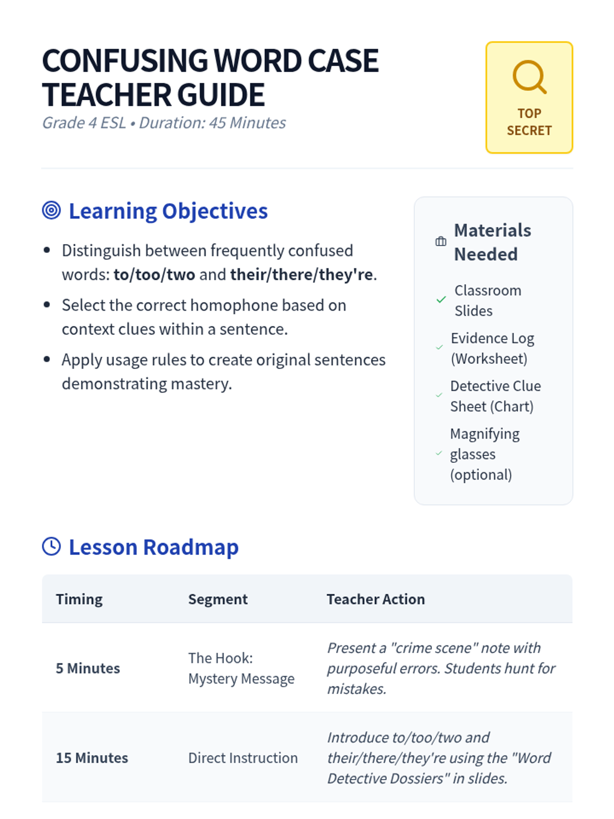 A 45-minute ESL lesson for 4th graders focused on mastering the homophones to/too/two and their/there/they're through a fun 'Word Detective' mystery theme.