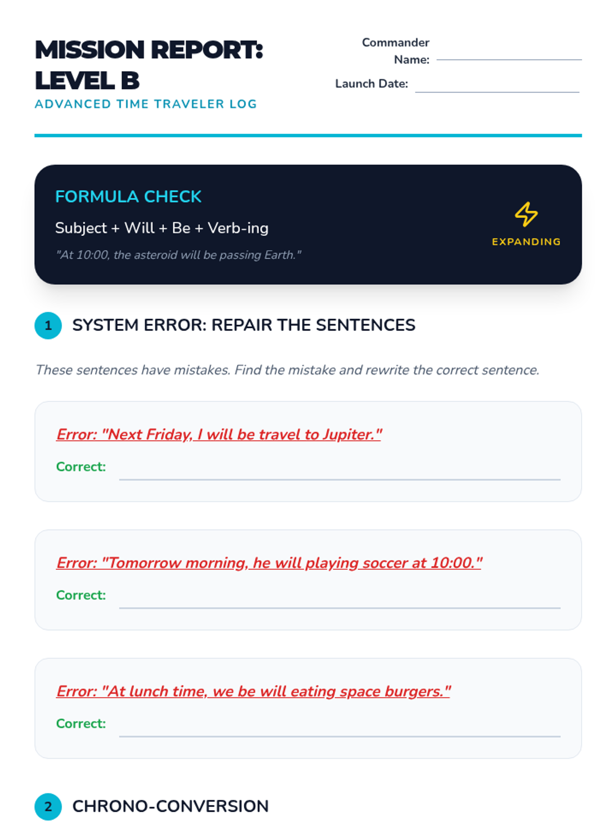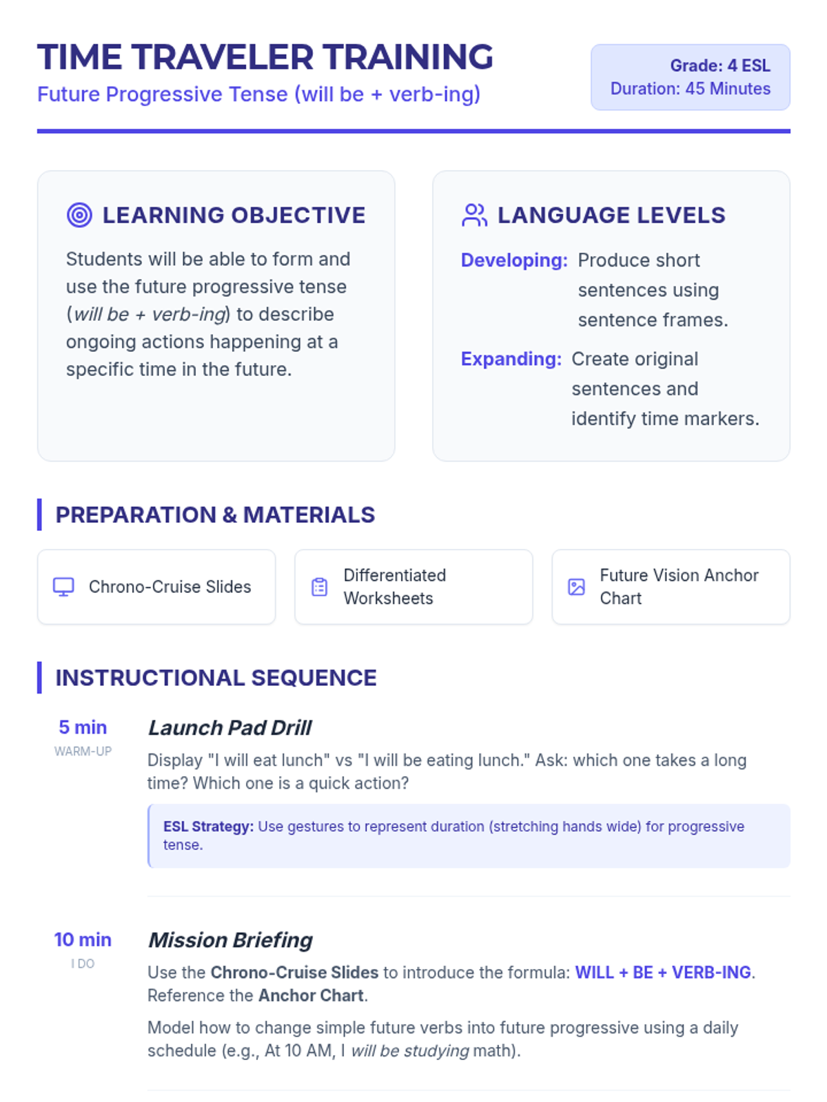 A 45-minute Grade 4 ESL lesson focusing on the future progressive tense (will be + verb-ing) using a 'Time Traveler Training' theme. Includes a comprehensive lesson plan, instructional slides, anchor chart, differentiated worksheets, and exit tickets.