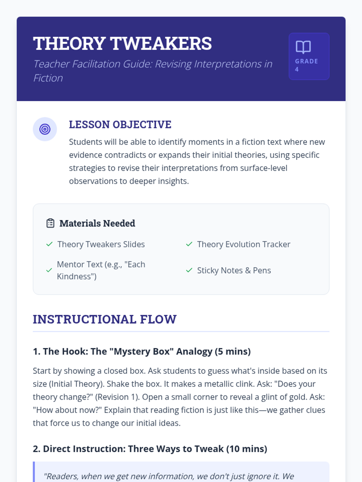 Students will learn to evolve their thinking about characters and themes in fiction by identifying new evidence that challenges or deepens their initial theories. This lesson focuses on the cognitive flexibility required to move from surface-level observations to nuanced interpretations.