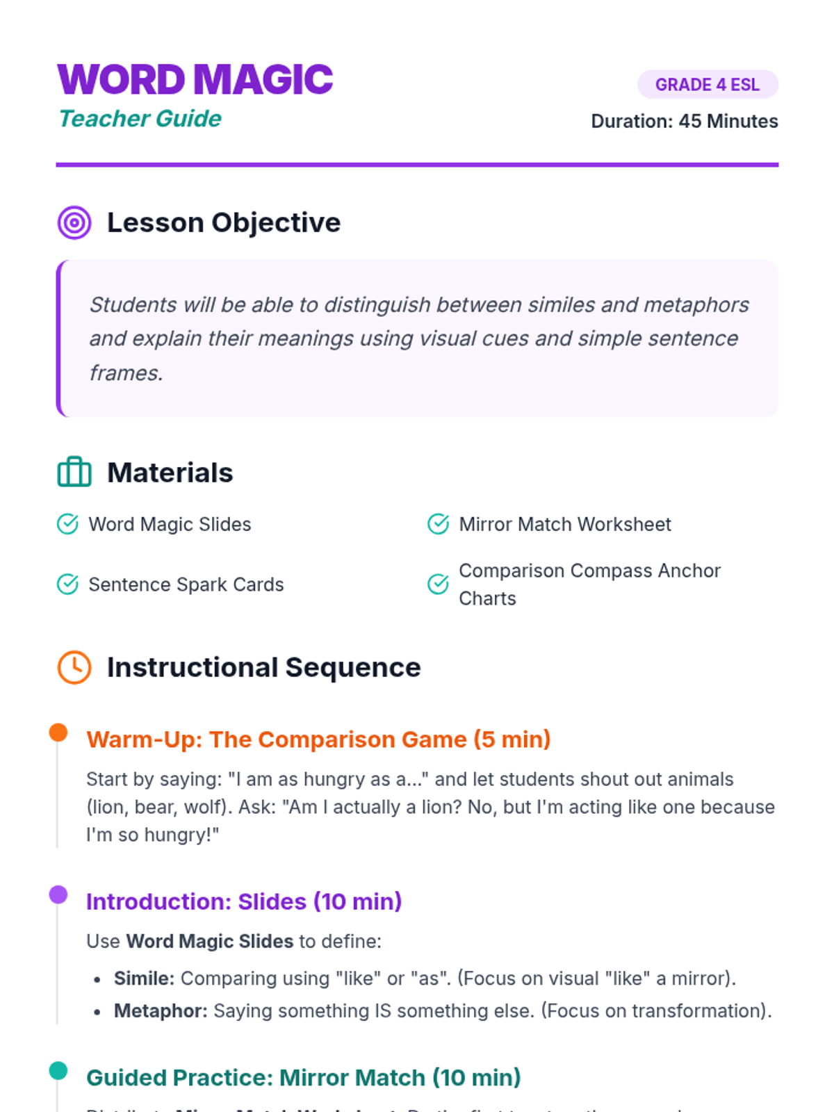 A 45-minute introductory lesson for Grade 4 ESL students on similes and metaphors, focusing on visual associations and simple sentence structures.