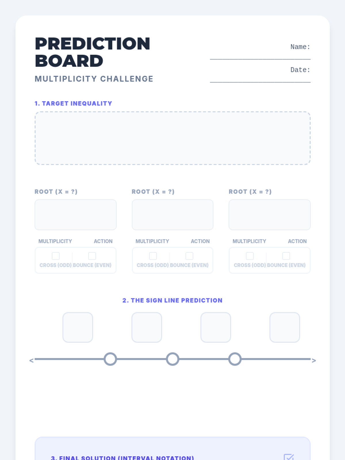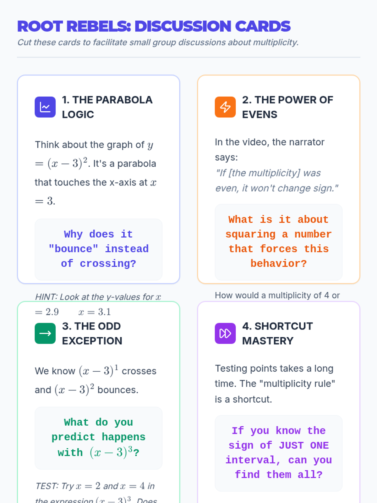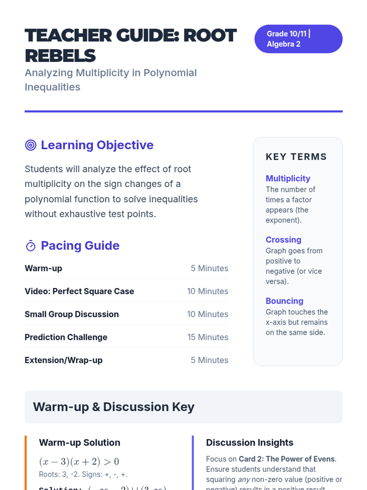 This lesson explores how the multiplicity of roots in polynomial inequalities determines whether a function changes sign or 'bounces' at a critical point, featuring a video demonstration and a prediction challenge.