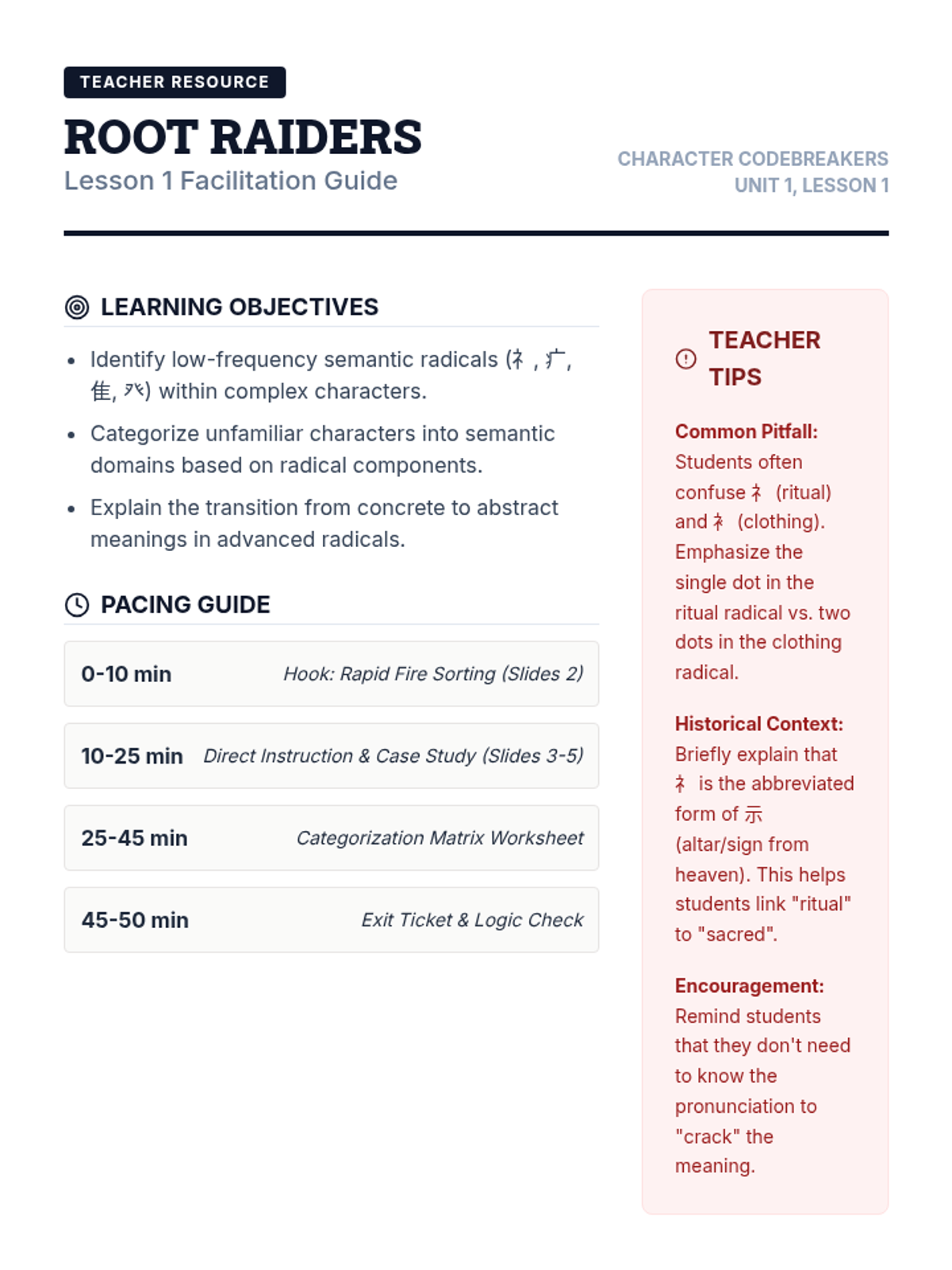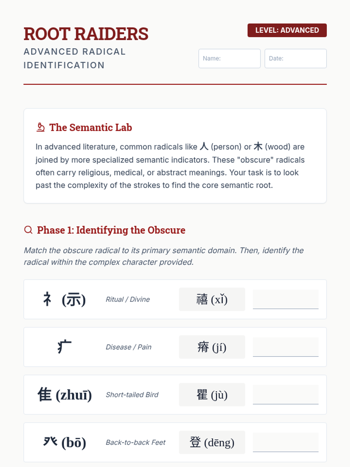 Students move beyond basic radicals to identify low-frequency semantic components like the 'ritual' or 'disease' radicals, practicing character categorization based on subtle root meanings.
