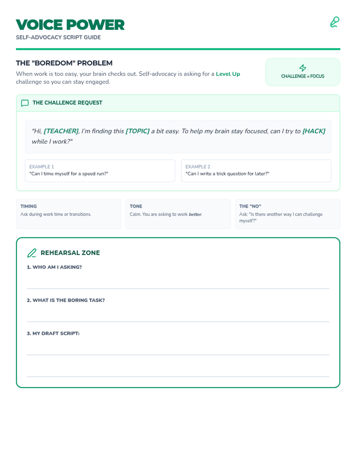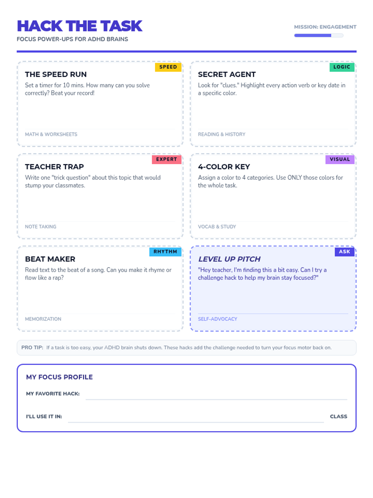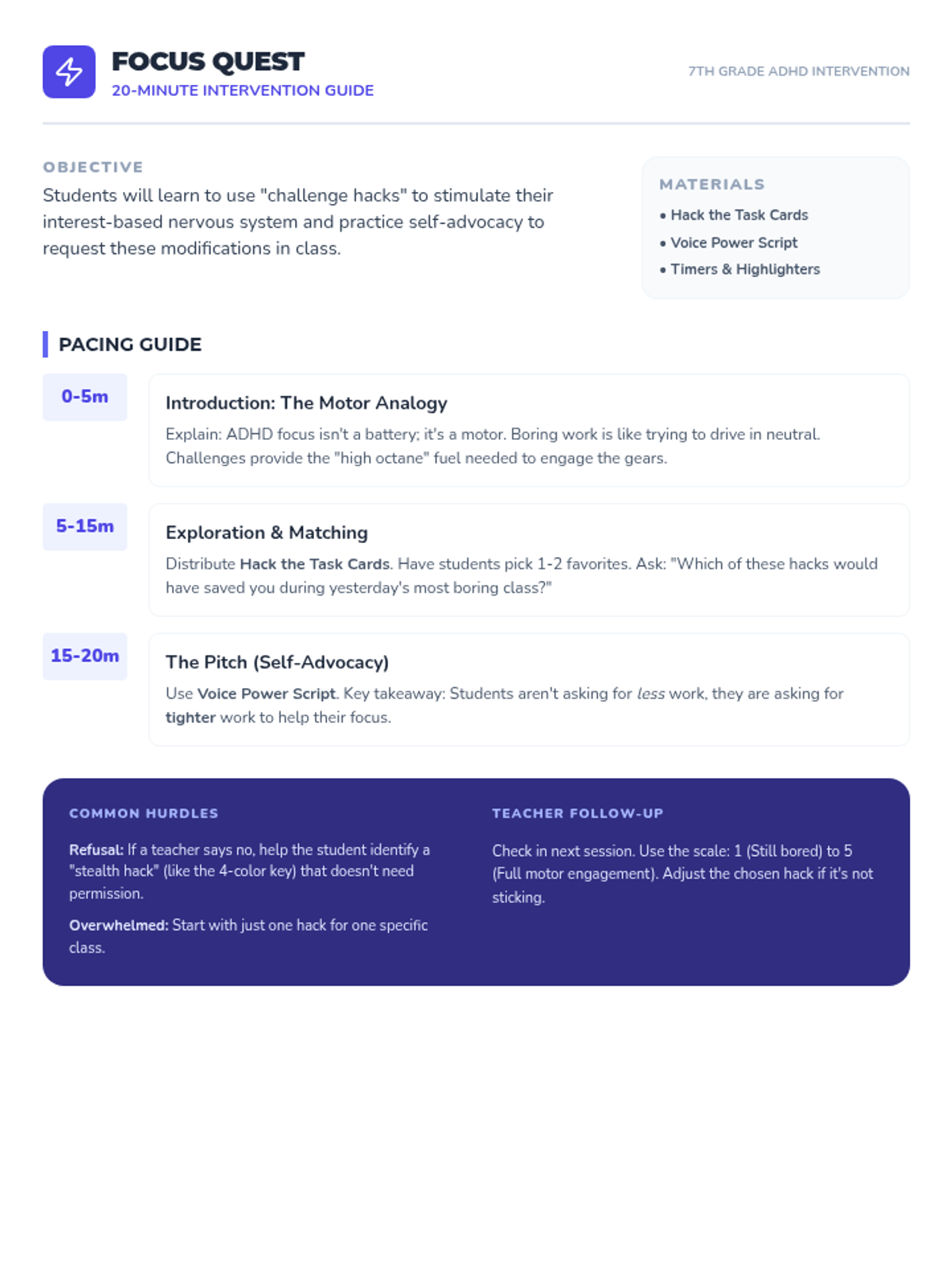 A 20-minute intervention for 7th grade students with ADHD/Focus needs, focusing on using 'challenge hacks' to increase engagement and practicing self-advocacy to request modifications.