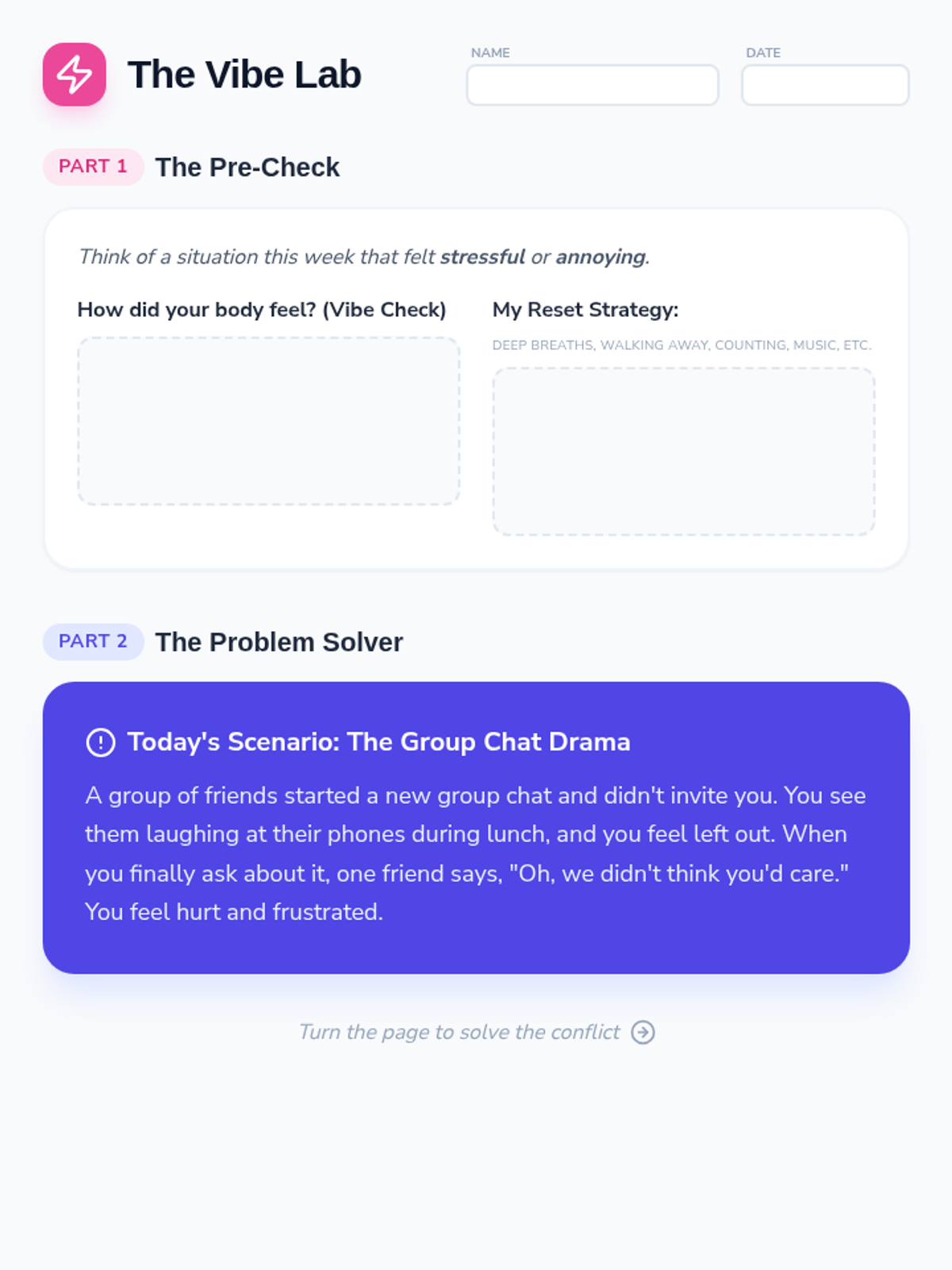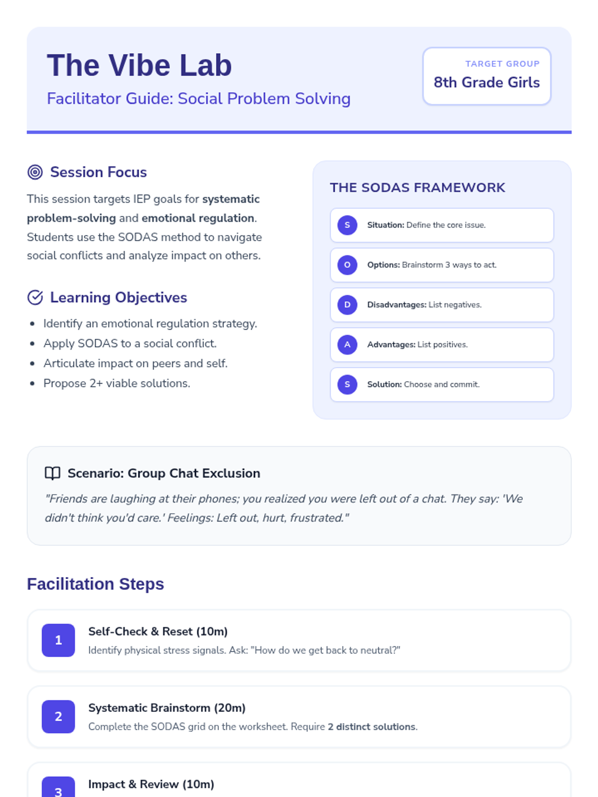 A social problem-solving session designed for middle school girls to practice systematic thinking, emotional regulation, and perspective-taking during social conflicts.