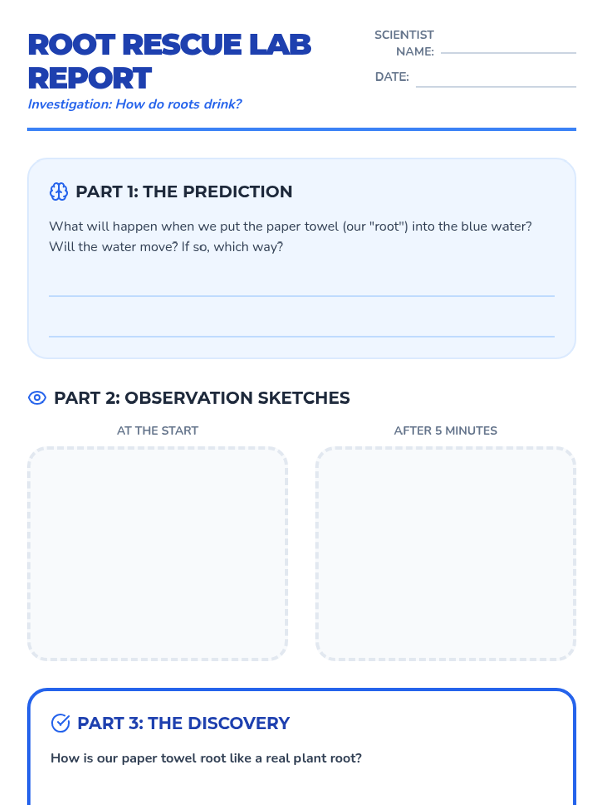 Focuses on the role of roots in water absorption and anchoring through a colored water experiment and discussion.