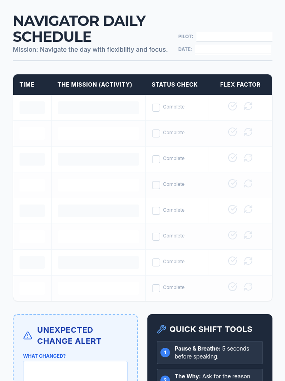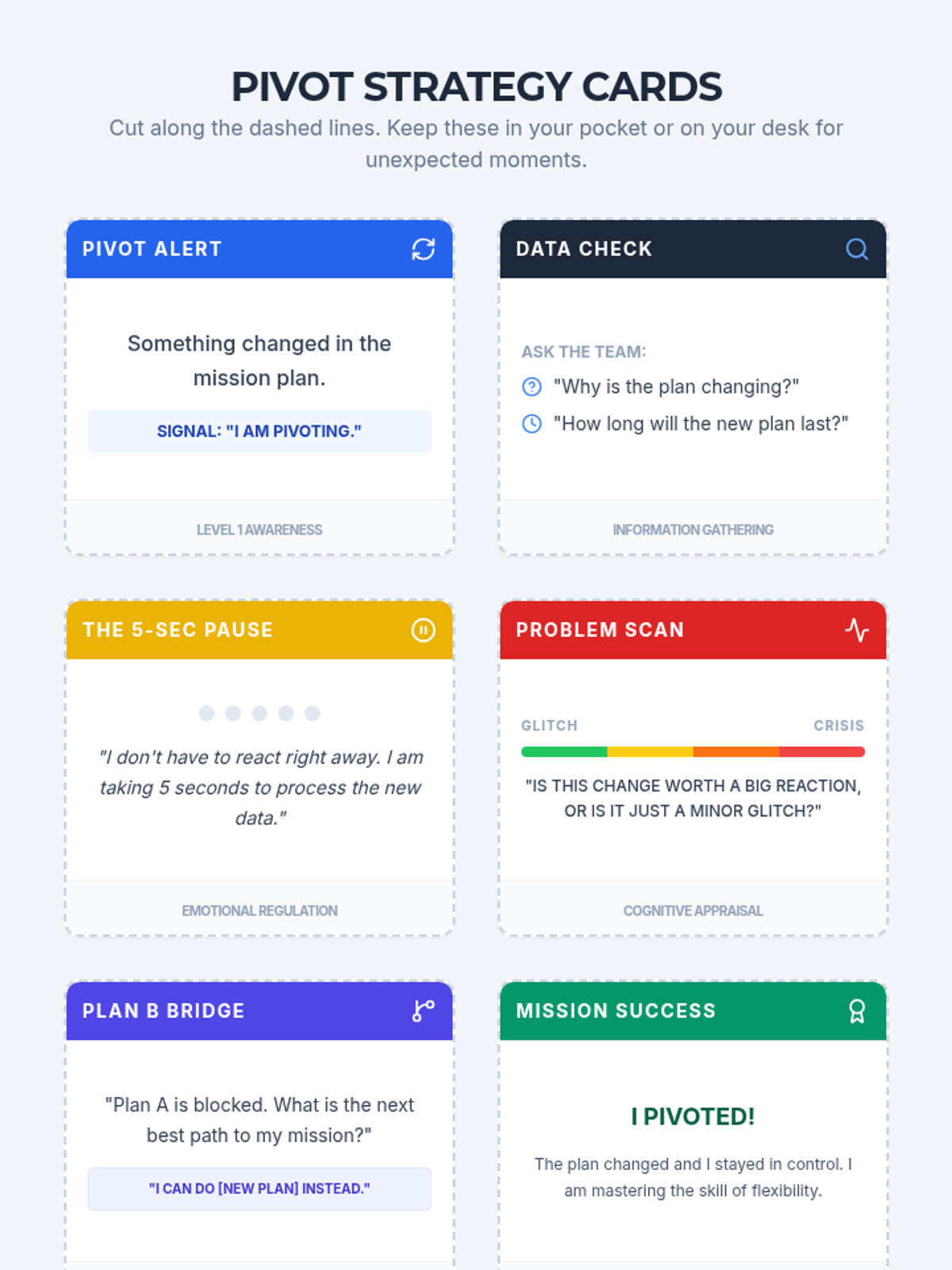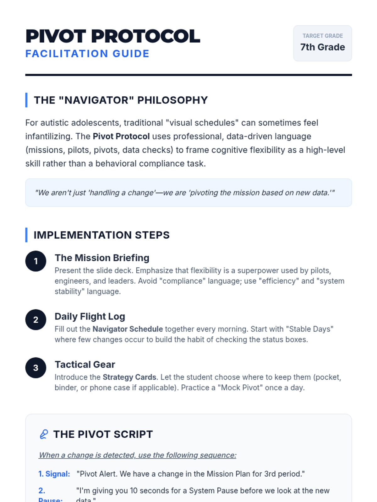 A specialized set of tools designed to help a 7th-grade student navigate daily transitions and unexpected changes with a focus on cognitive flexibility.