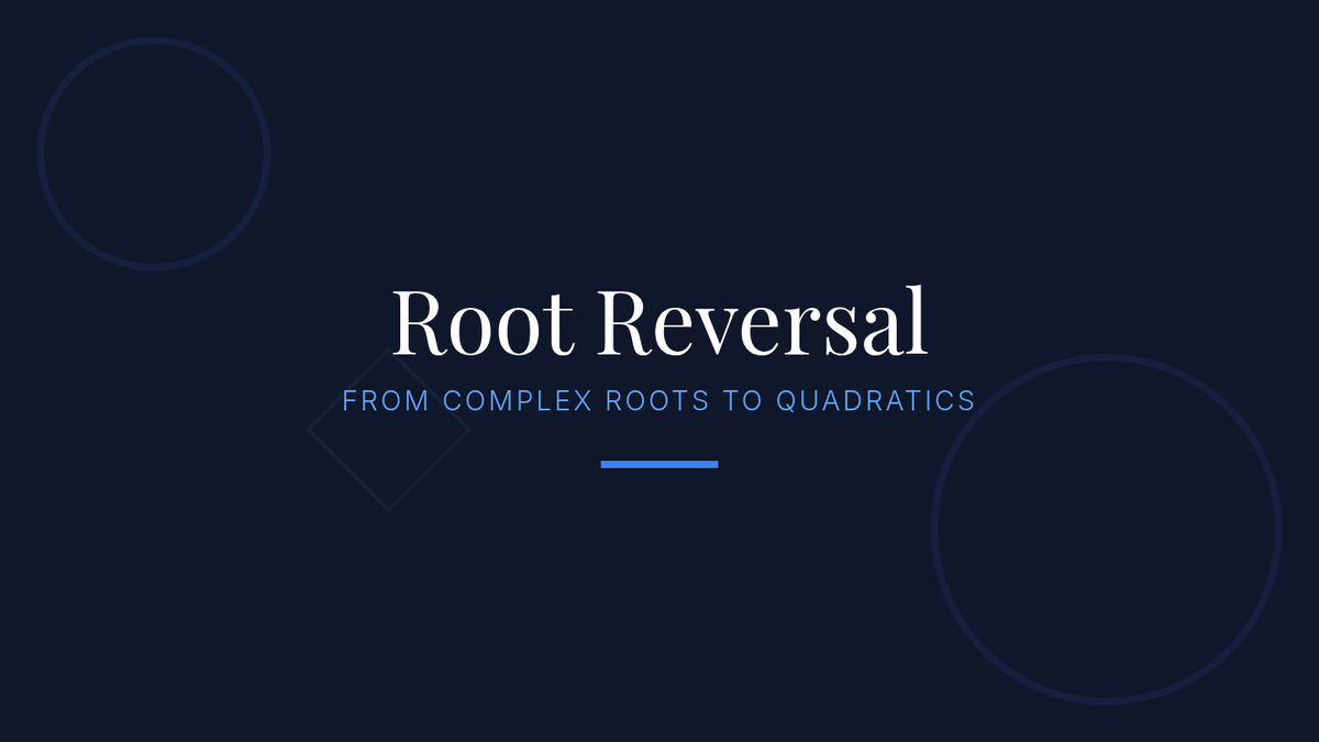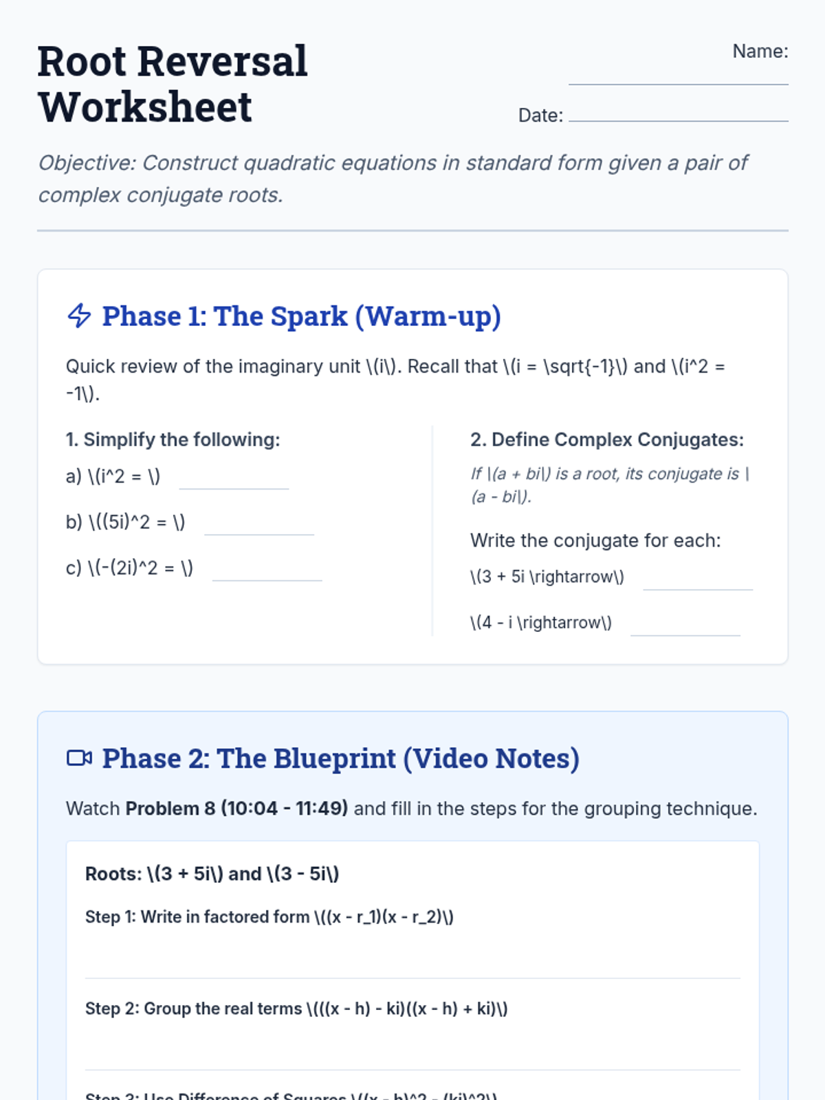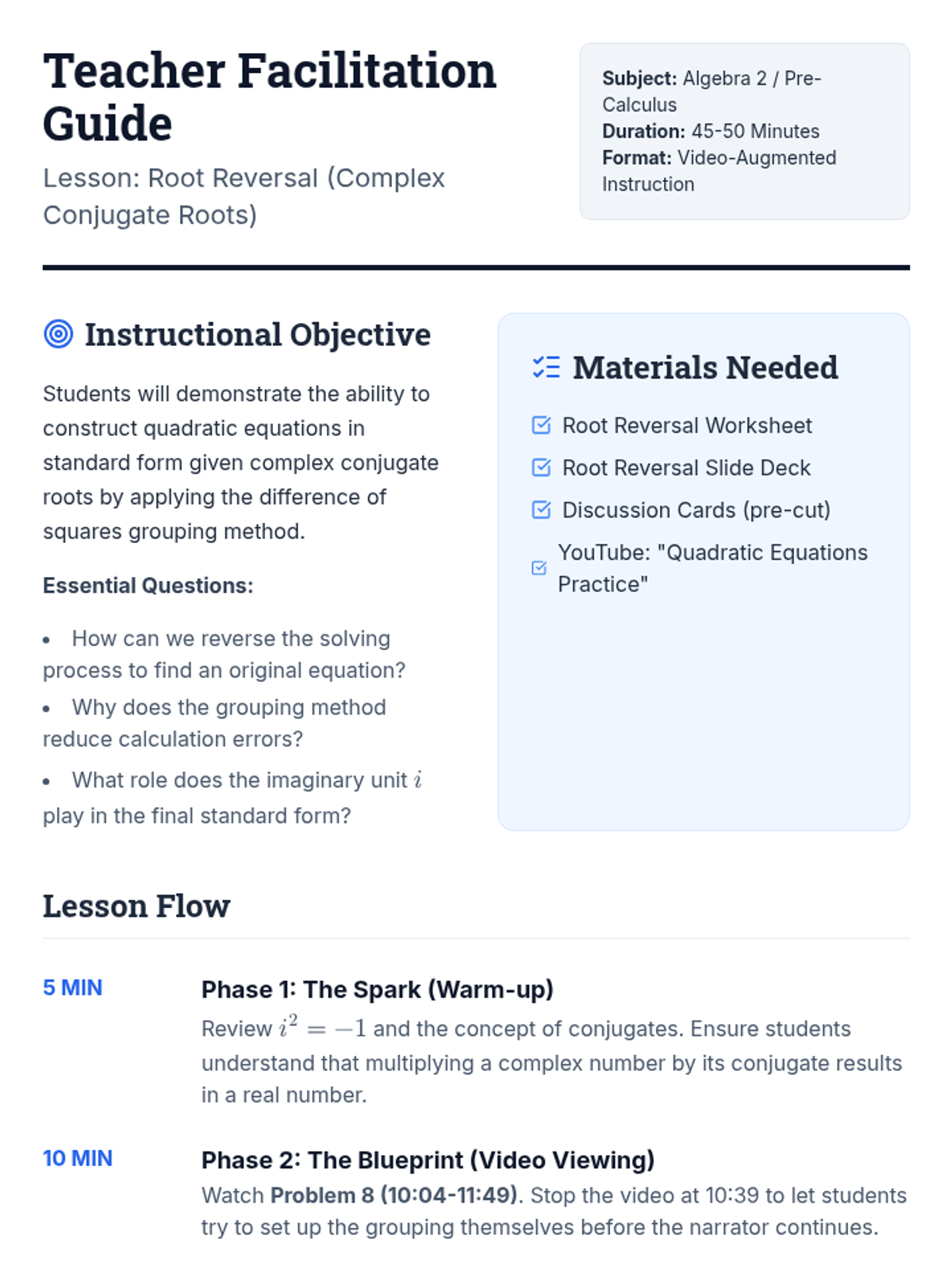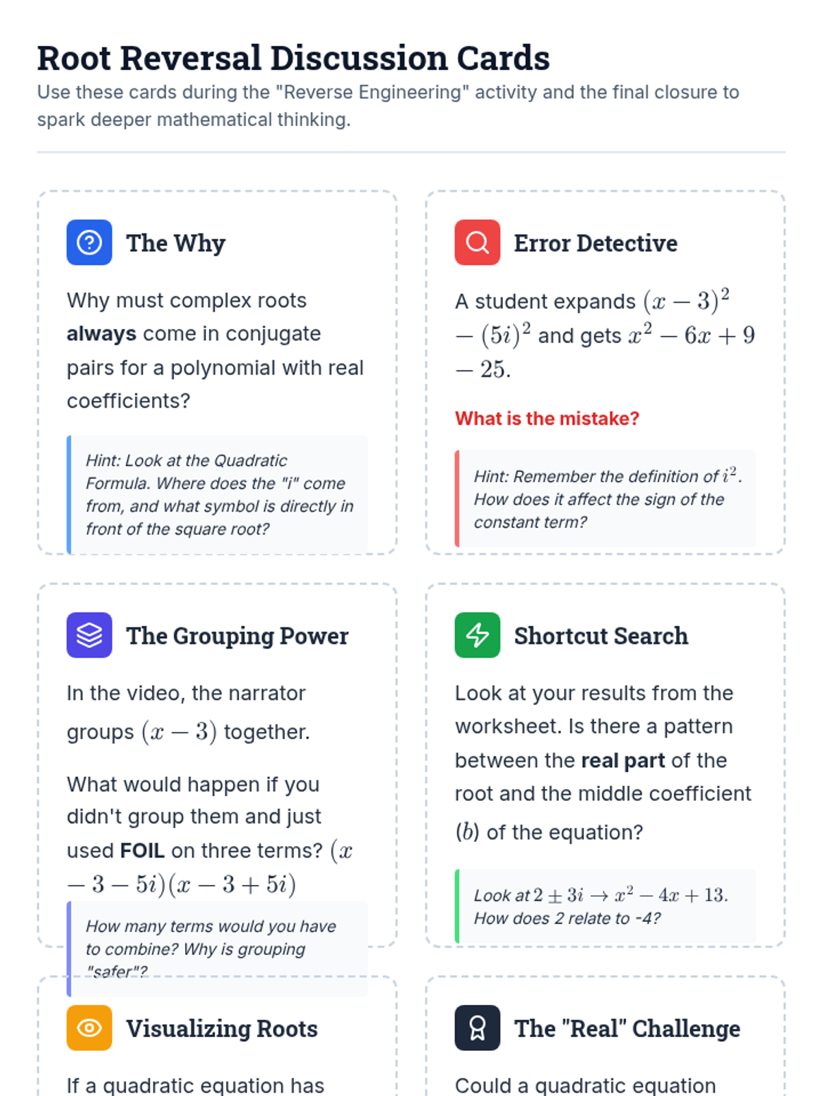 A lesson focusing on working backwards from complex roots to find quadratic equations using grouping and the difference of squares technique.